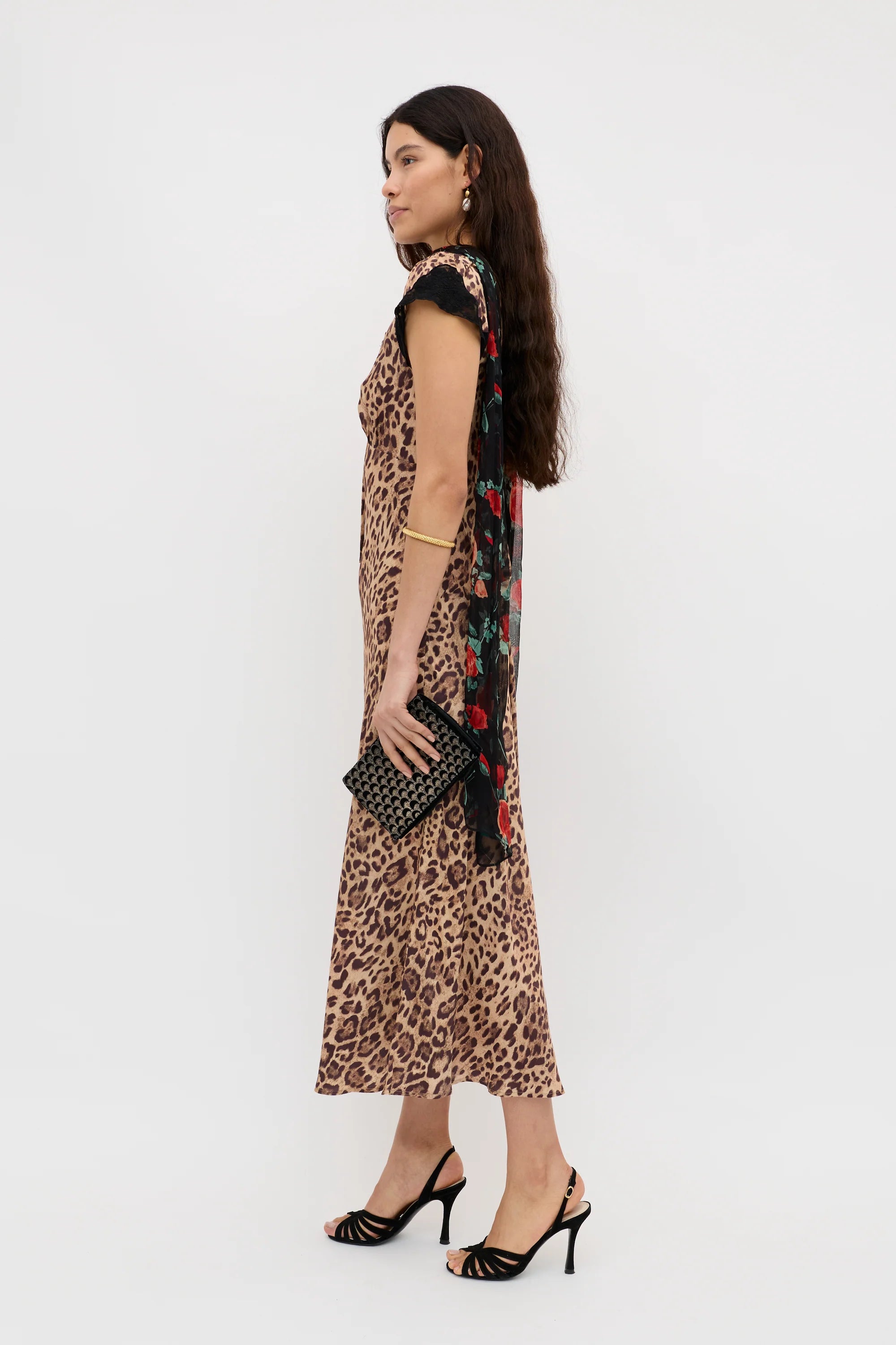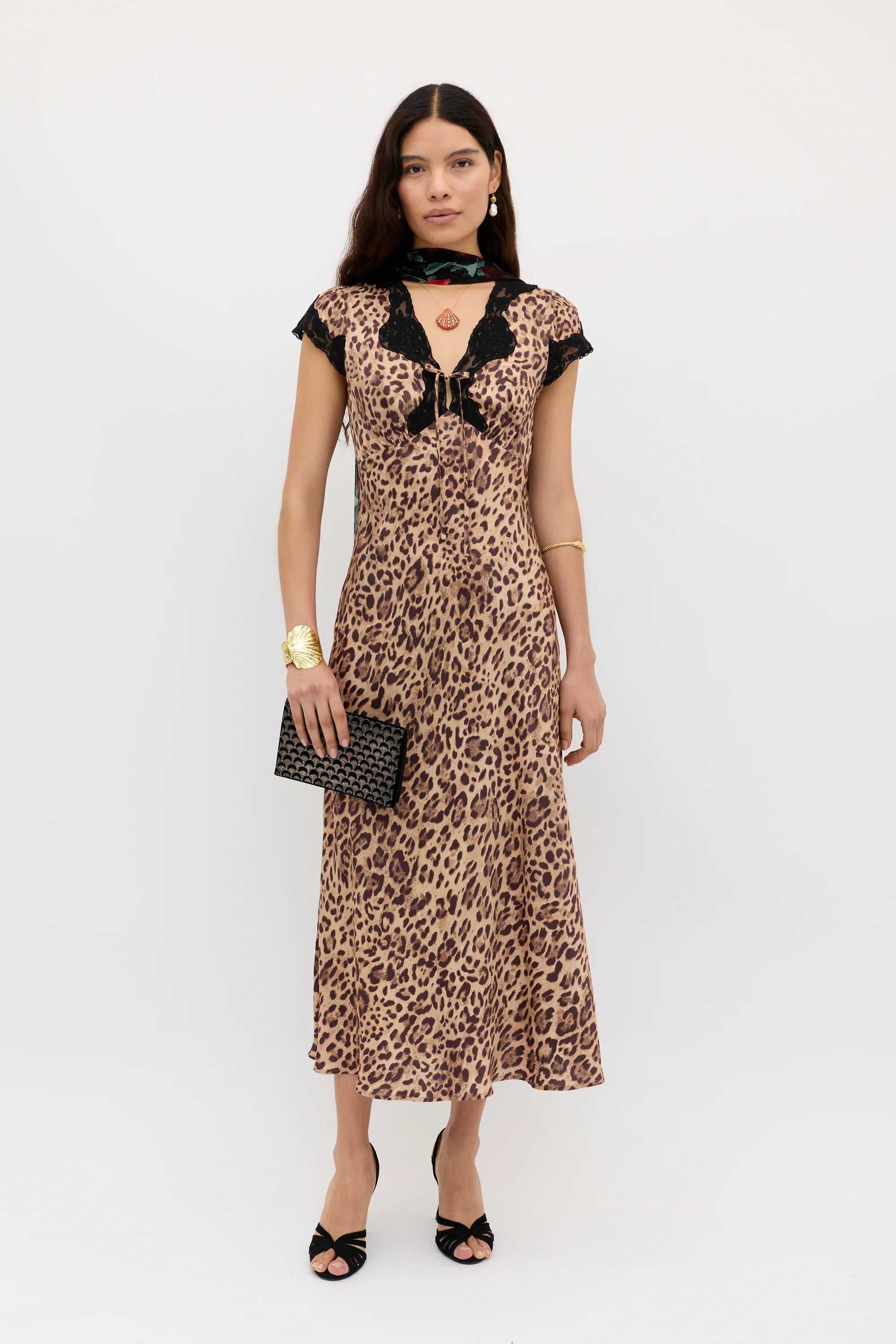 Amari is based on our beloved Clarice dress, but the statement lace trim and leopard print gives it an elevated feel. It's cut in our signature bias shape, with under bust seams and a tie front so you can adjust the V-neck. A timeless style for dinner dates to special occasions.