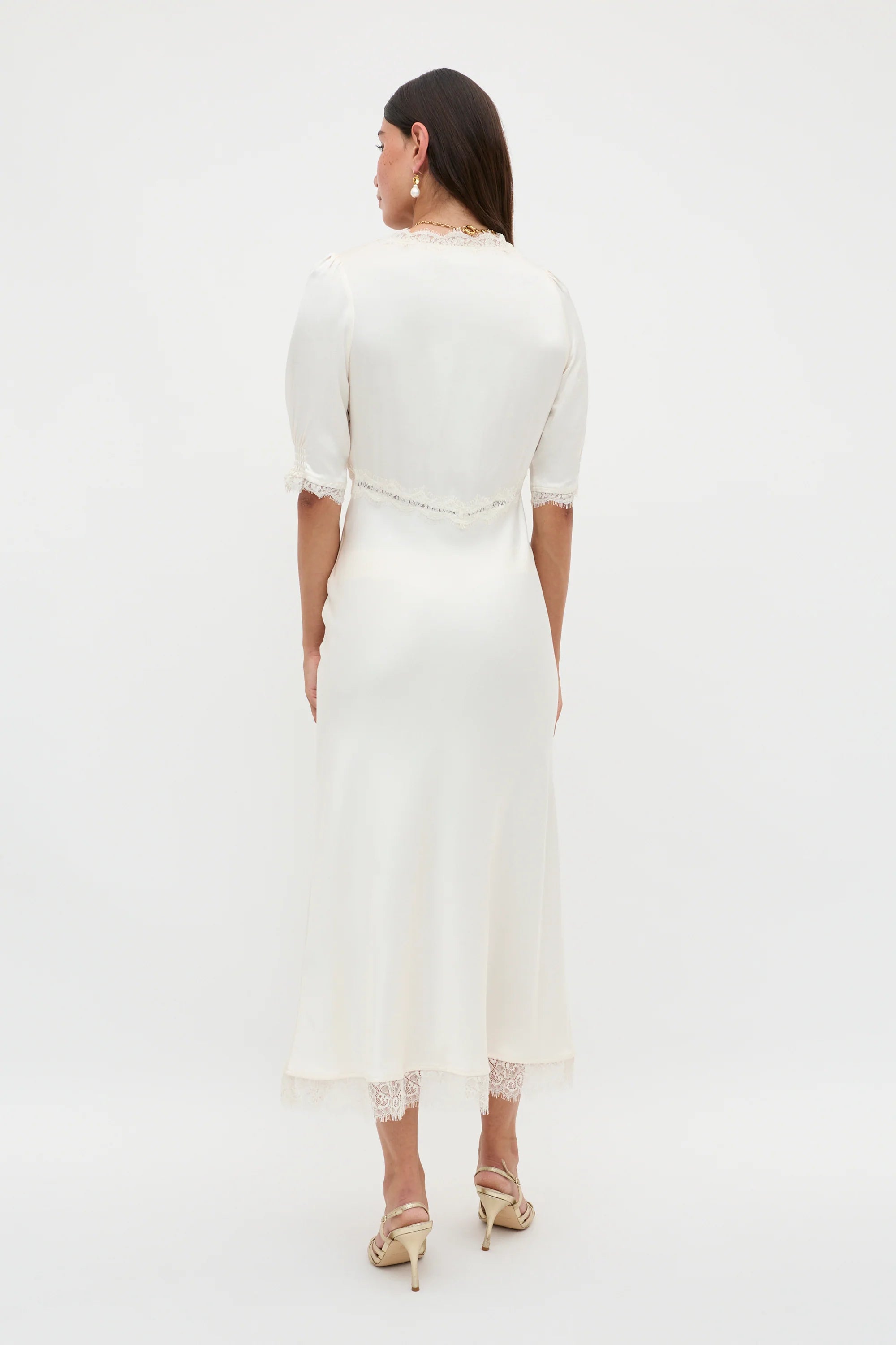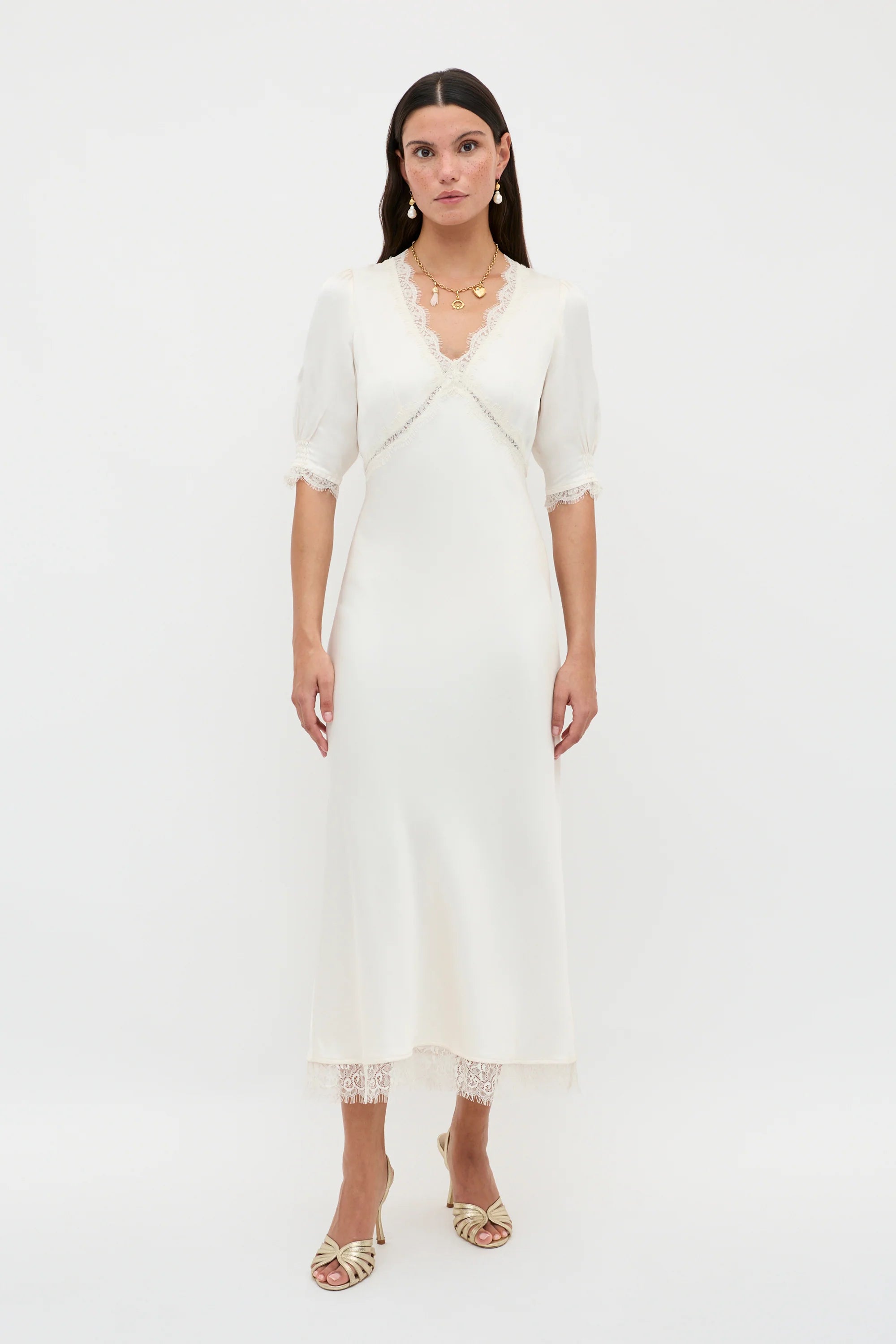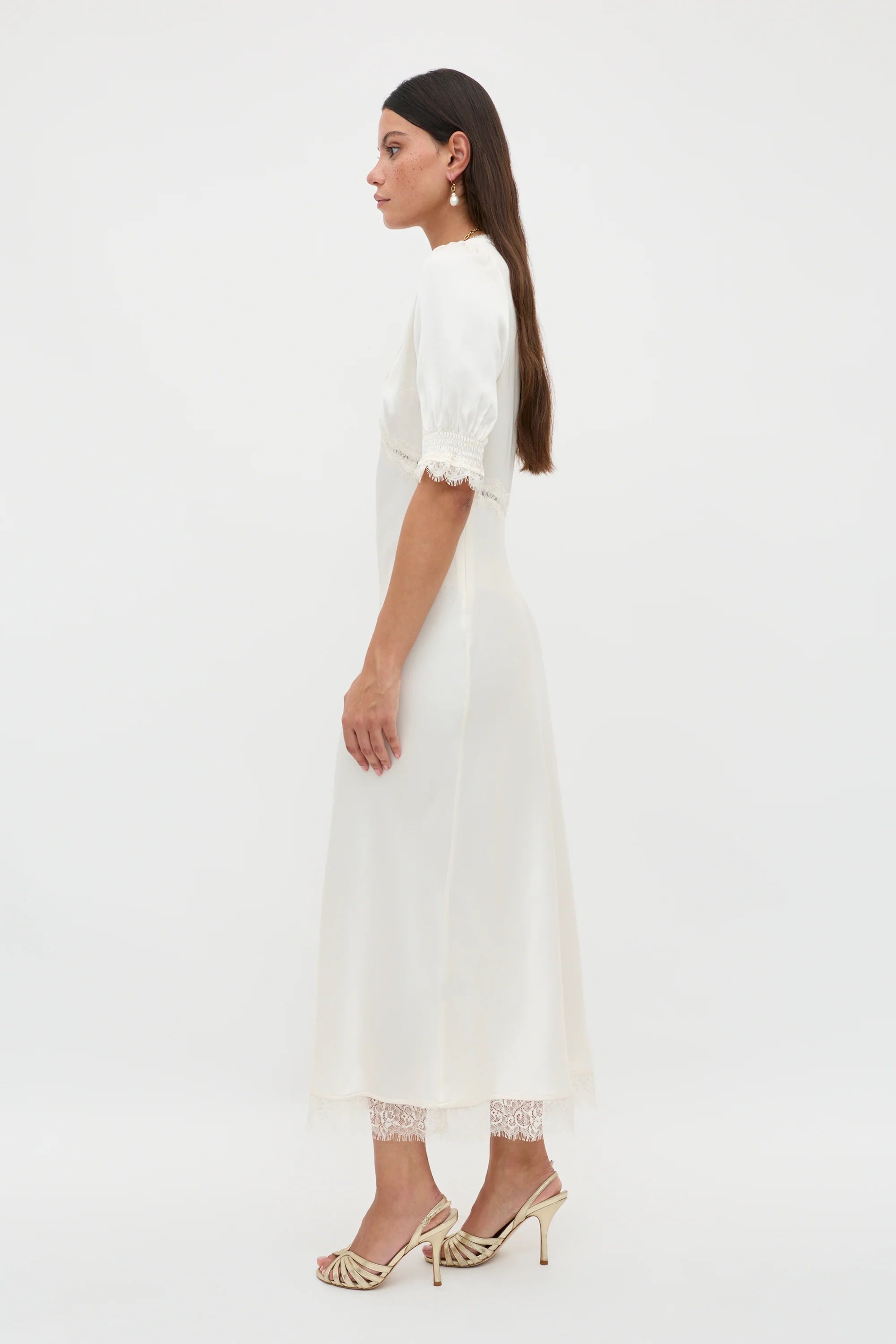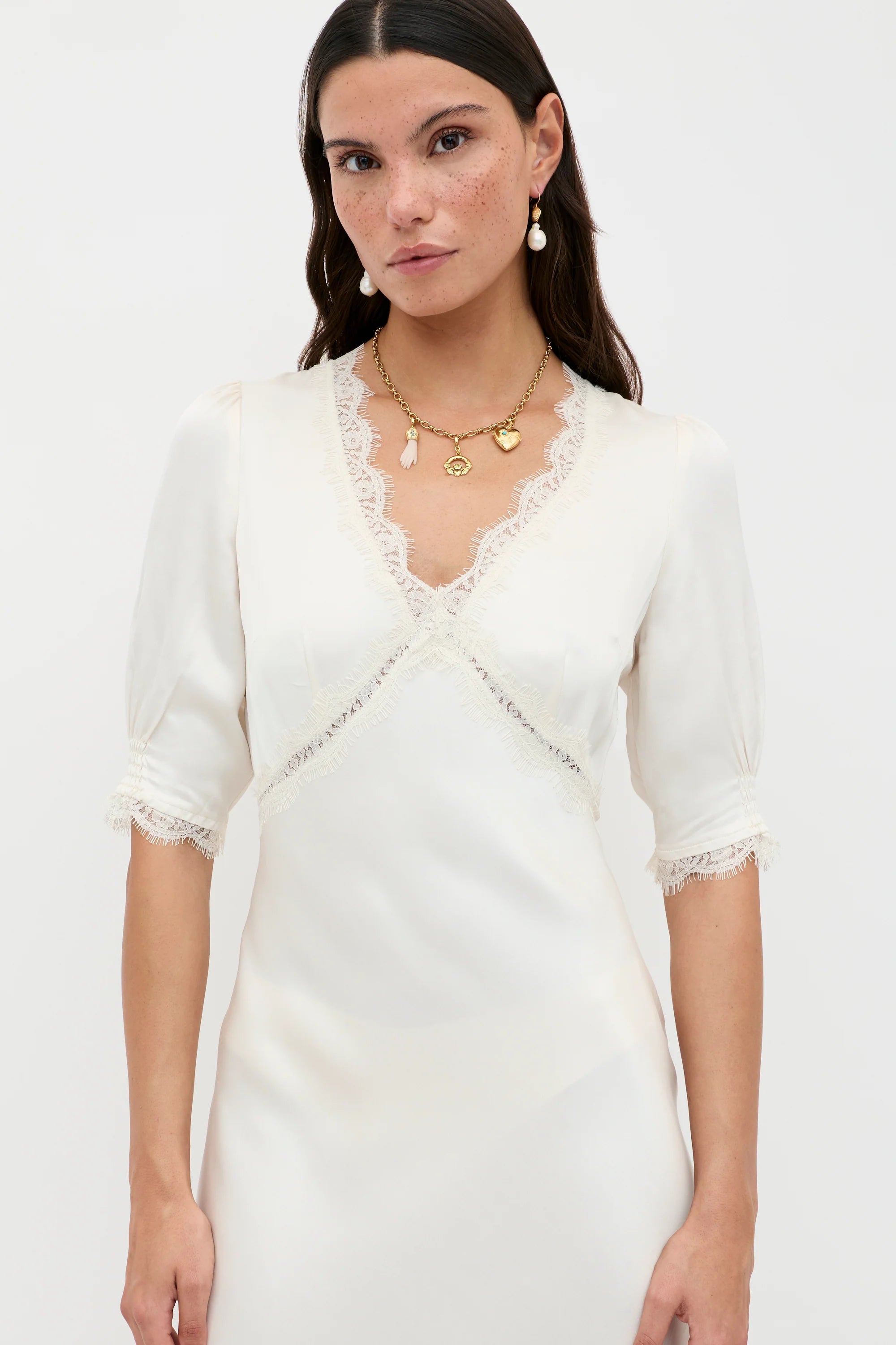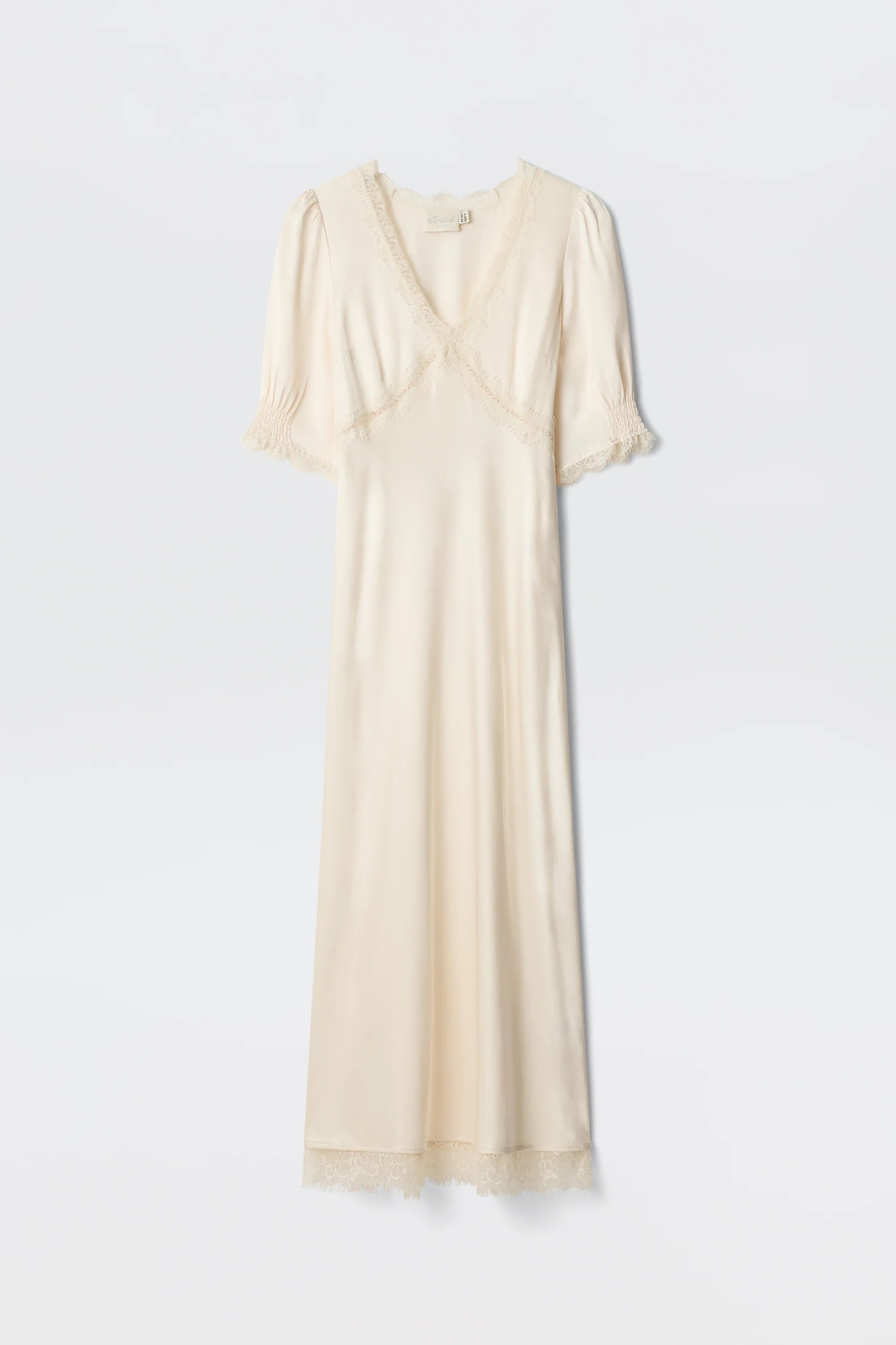 Elegantly refined with a true vintage soul, our Annina Dress is a timeless choice. Crafted from a silky EcoVero-blend with delicate lace trims and shirred blouson sleeves, it evokes a romantic whimsy whilst still feeling polished. Our Pearl colourway has a subtle iridescence that shimmers when the light hits it – a dream for both the wedding dance floor and dappled sunlight filled afternoons.