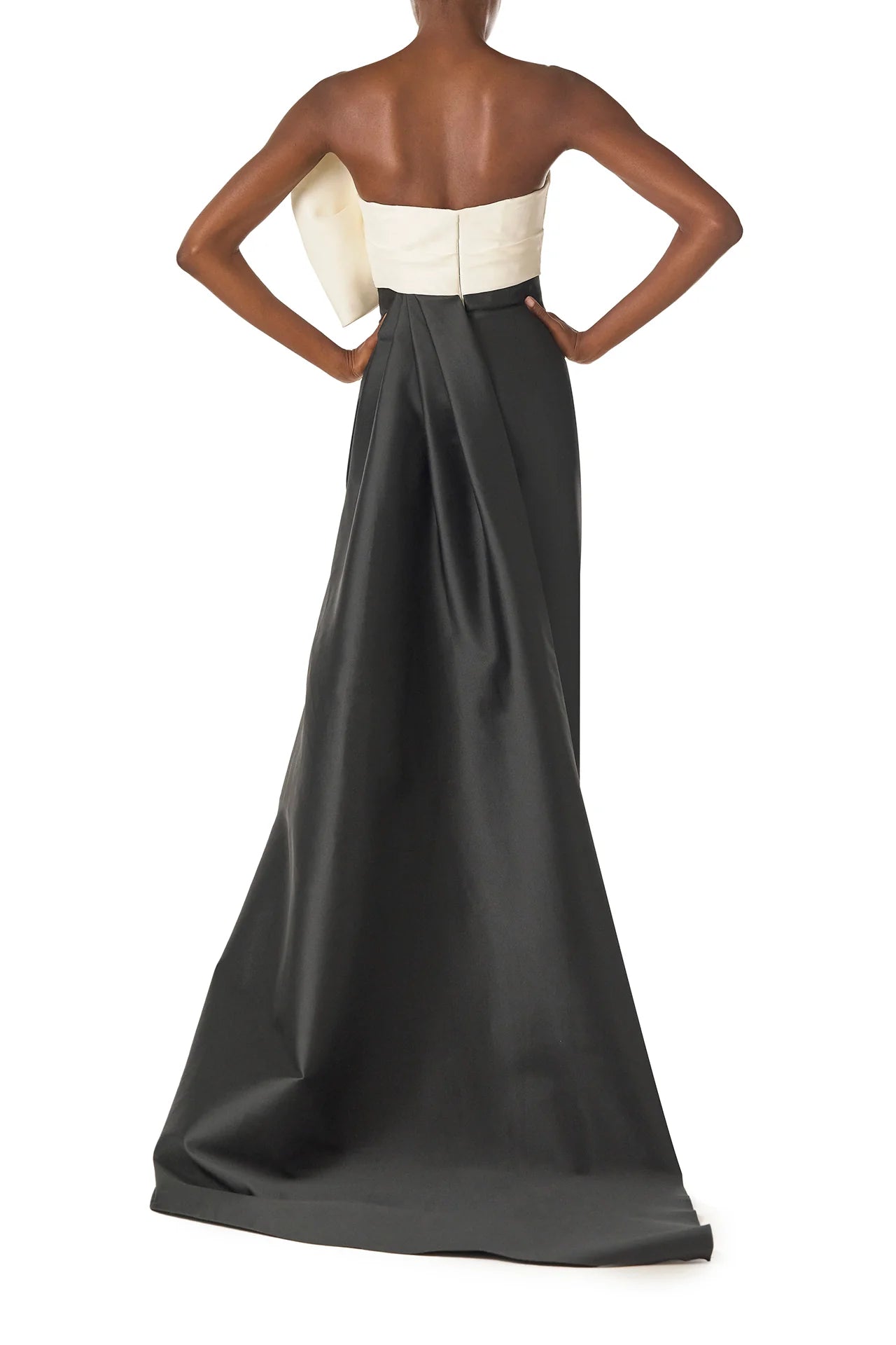 Strapless column gown with asymmetric draped bow neckline and pleated back train.