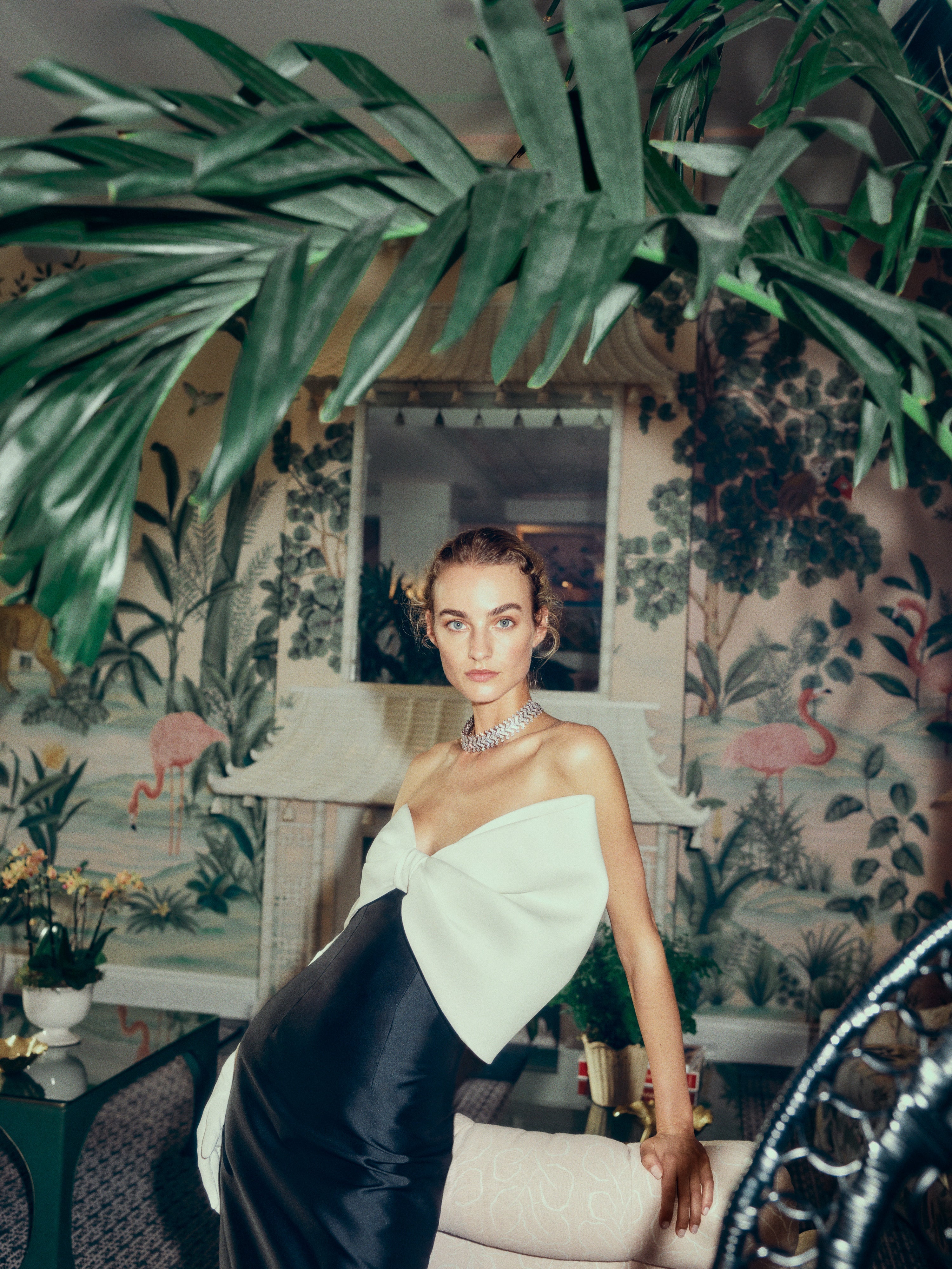 Our column gown in Noir and Silk White Mikado exudes effortless sophistication. The sleek silhouette is elevated by an asymmetric draped bow at the bodice. blending skillful tailoring with intricate draping. Princess seams allow the gown to contour the figure. while a dramatic pleated back train adds graceful movement for a look that's both bold and timeless.