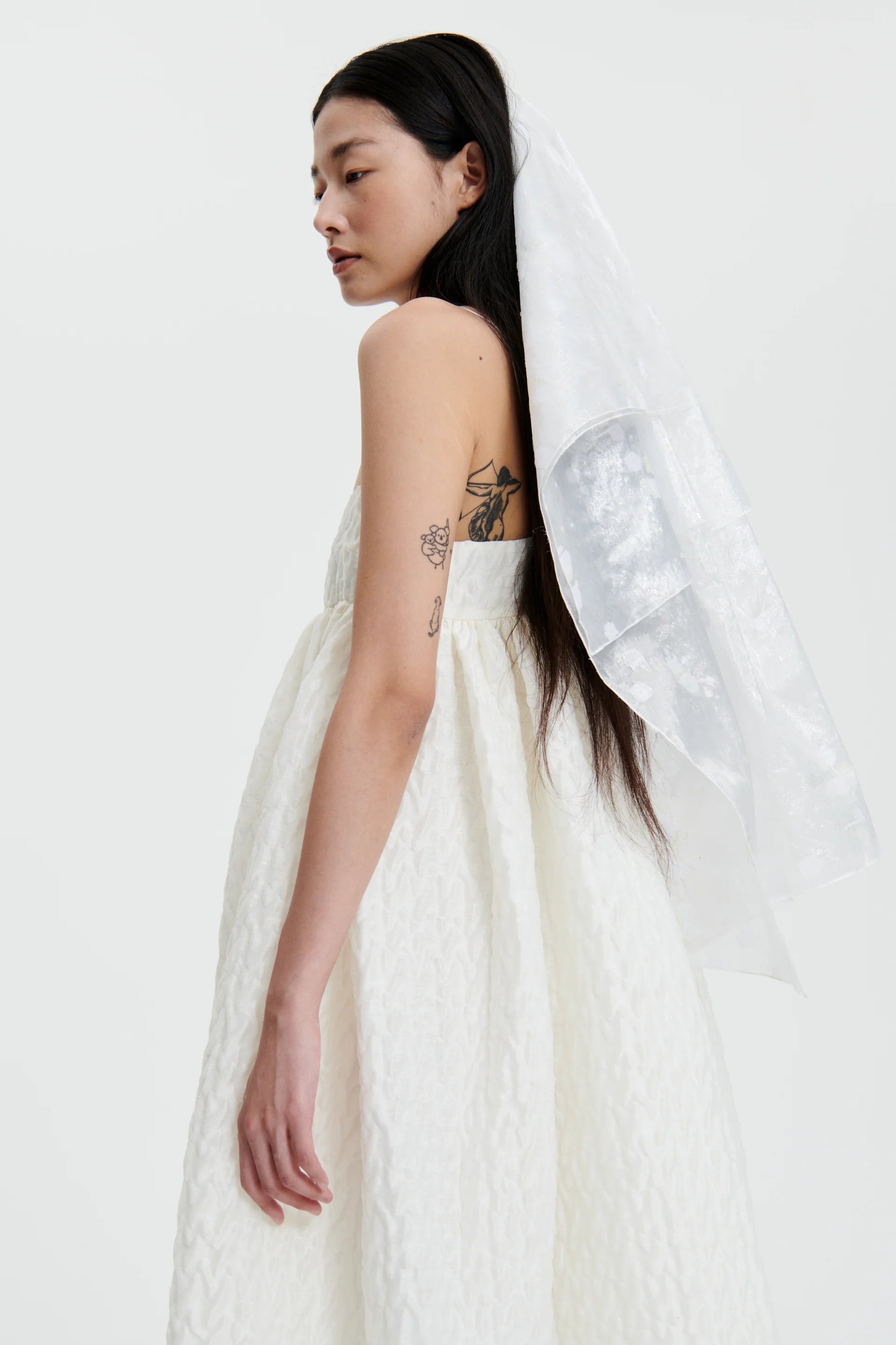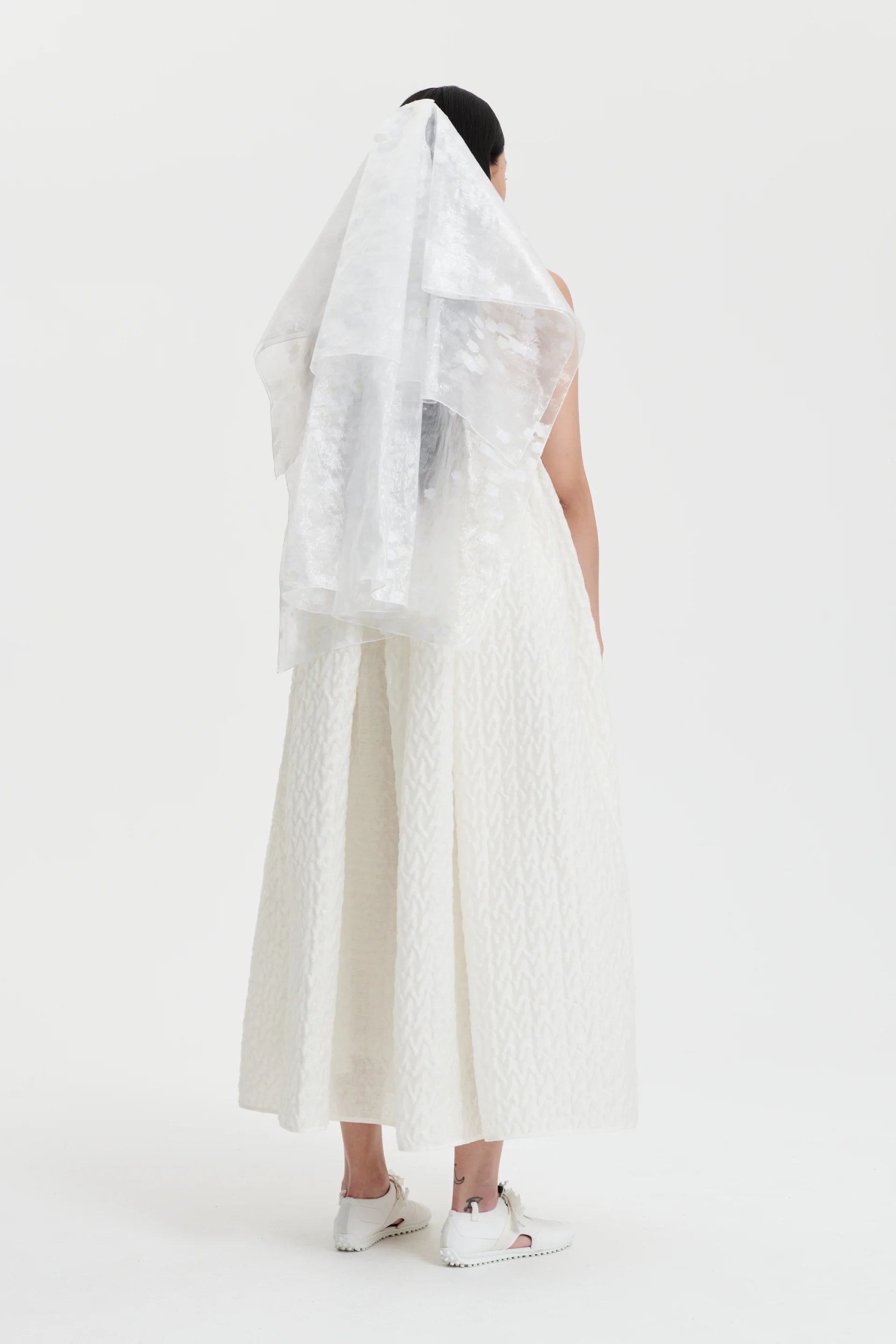 Expressing Cecile Bahnsenís appreciation for couture fabric. the Beth is crafted from an ethereal linen plissÈ in white. The minimalist silhouette balances a narrow bandeau with a voluminous skirt that falls to the ankle.
