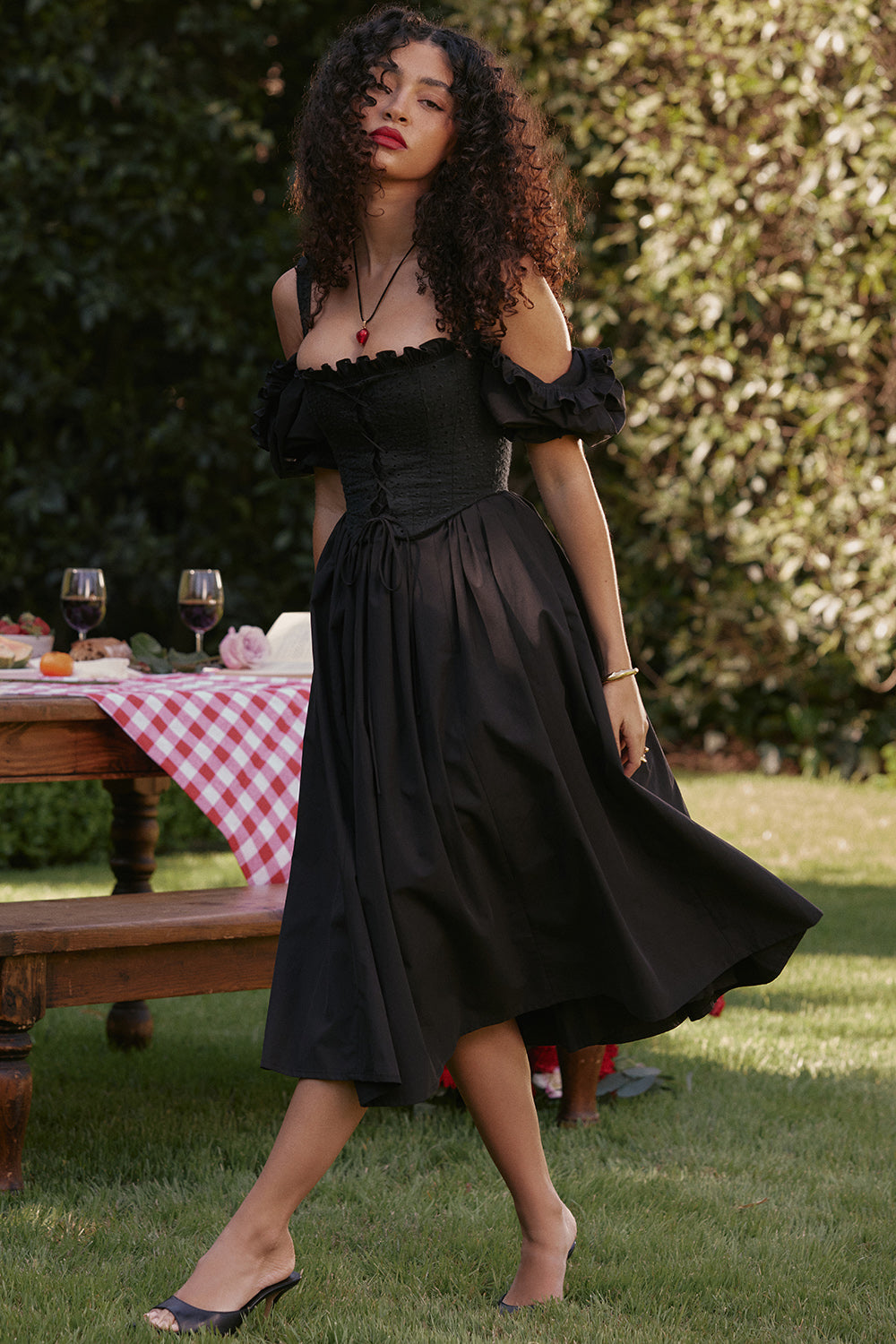 We love the pretty drama that 'Silvana' brings with the exaggerated puff sleeves to wear on or off the shoulders and the voluminous floaty skirt for an ultra feminine feel. It zips up the back for easy on and is fully lined for comfort. Wear yours with dainty mules or tonal heels like 'Lola' in black.