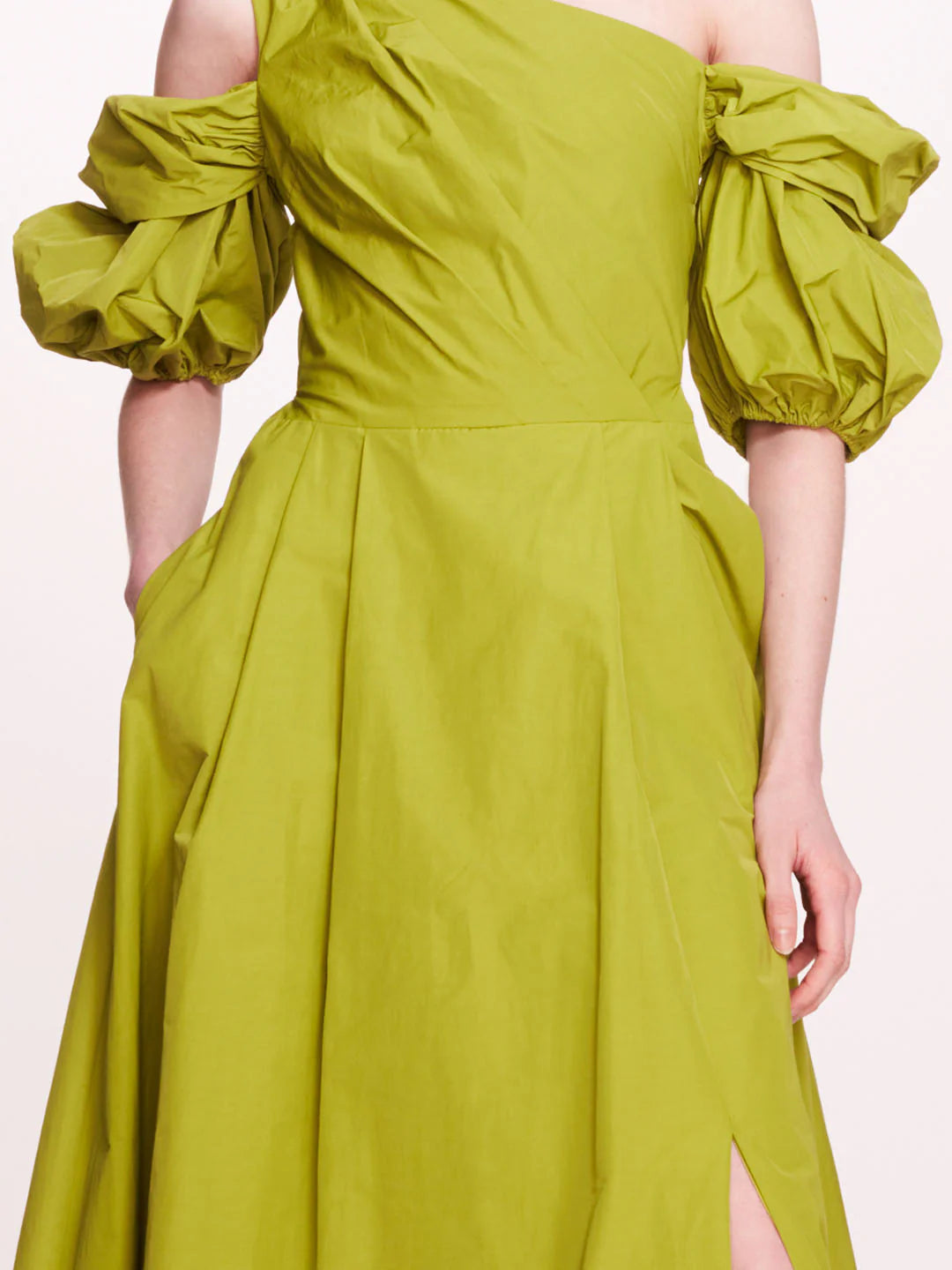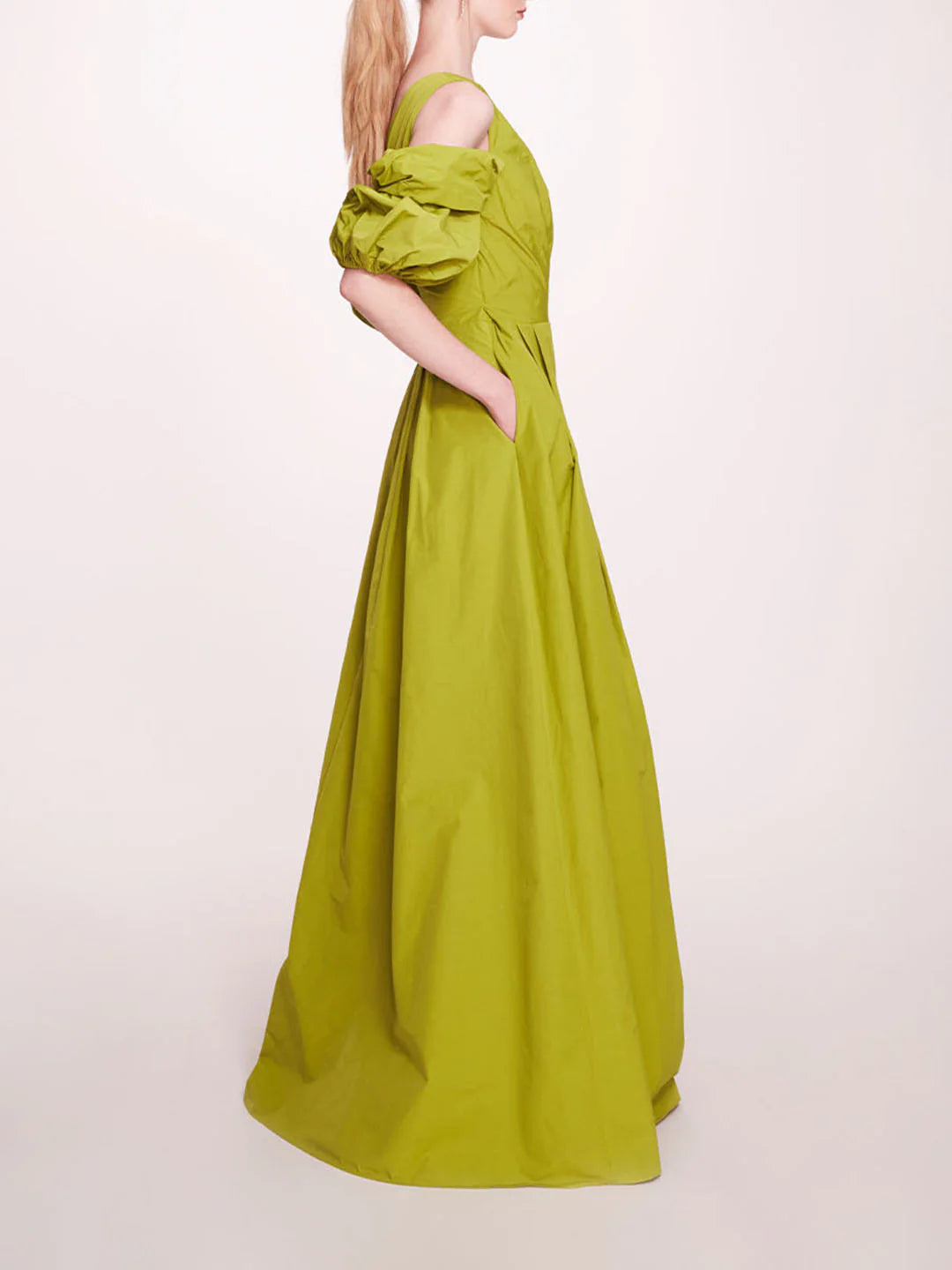 Embrace modern elegance with the Bubble Sleeve Taffeta Gown. featuring a chic one-shoulder design. The draped bodice enhances your silhouette. while the off-the-shoulder bubble sleeve adds a playful flair to this stunning a-line gown.