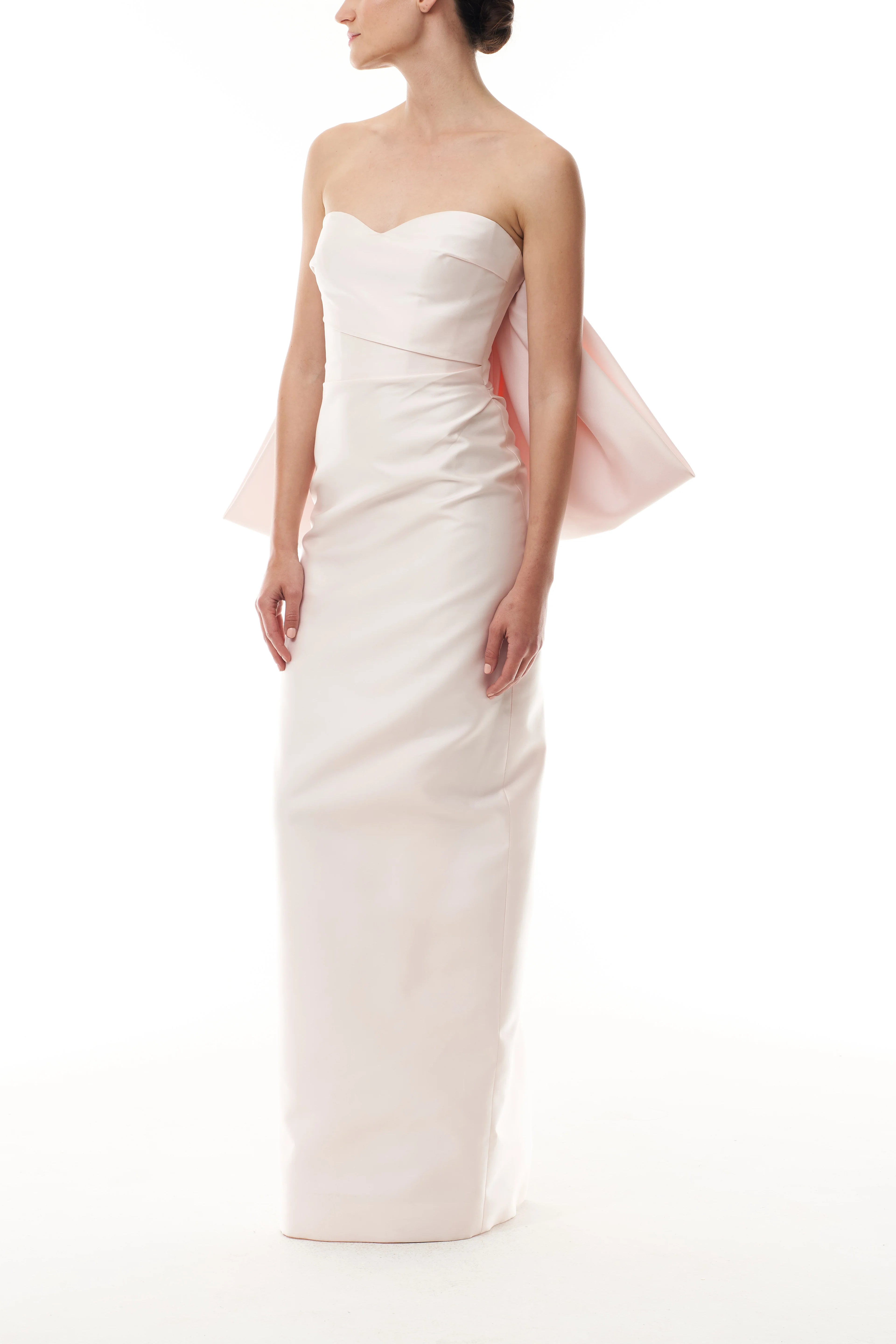 Our Sweetheart Column Gown makes a striking impression in sculptural Mikado. Draping across the bodice moves from right to left, enhancing the contoured silhouette and drawing the eye to the natural waist. A dramatic bow cascades from the back, adding volume and elegance to the clean column shape. Boning through the bodice ensures structure and support, while a back slit allows for graceful ease of movement. Rendered in a playful Candy hue, it’s a modern take on timeless glamour.