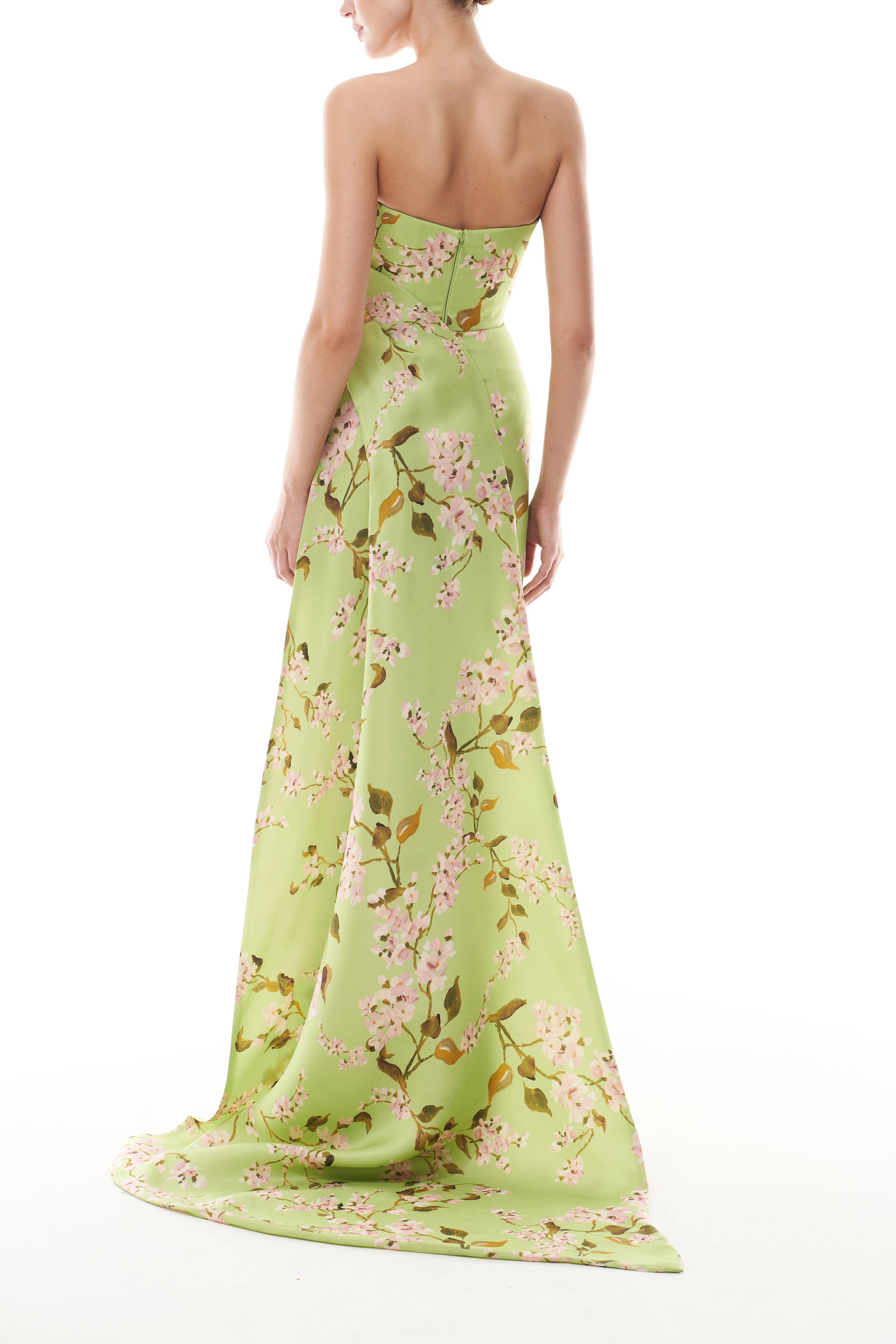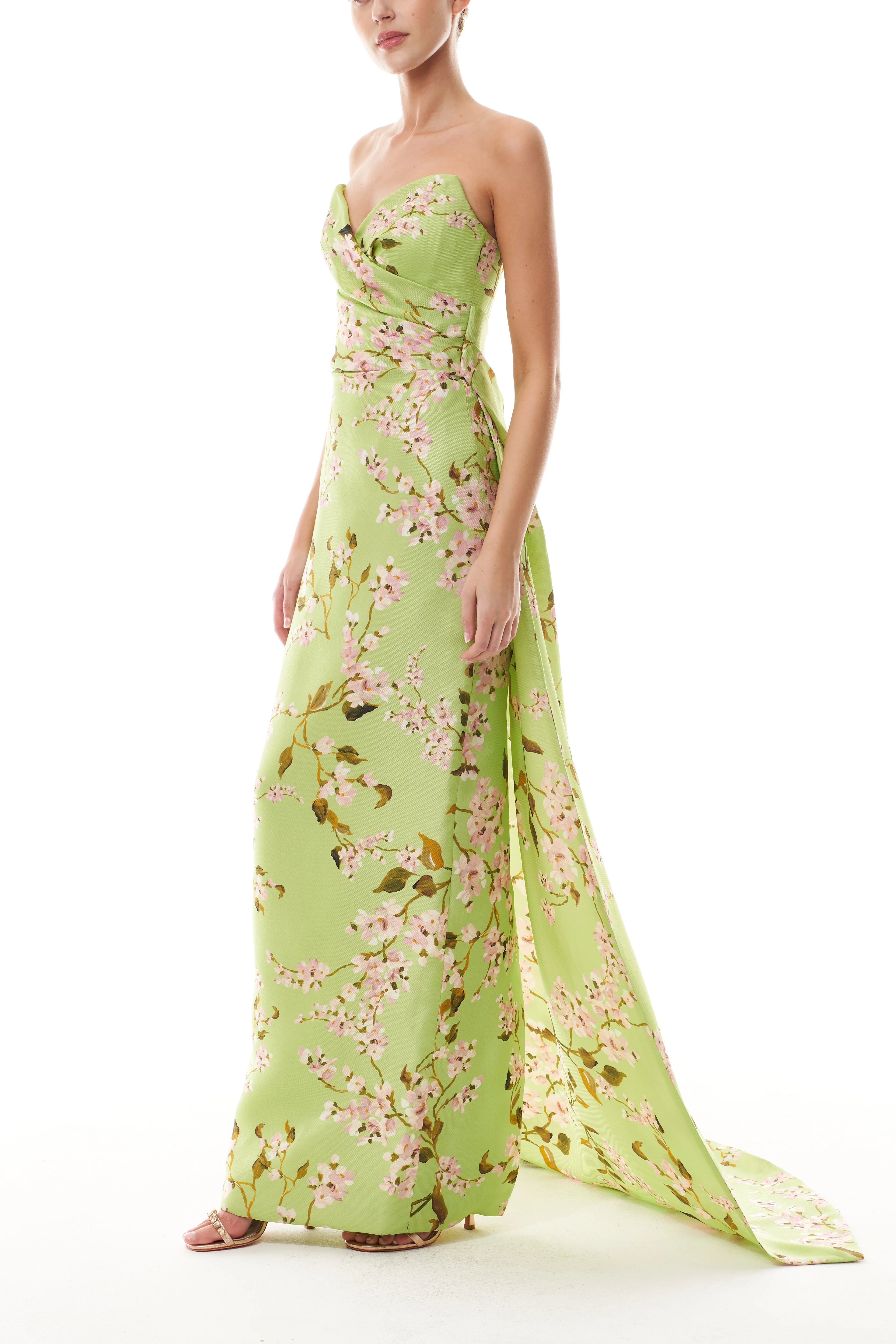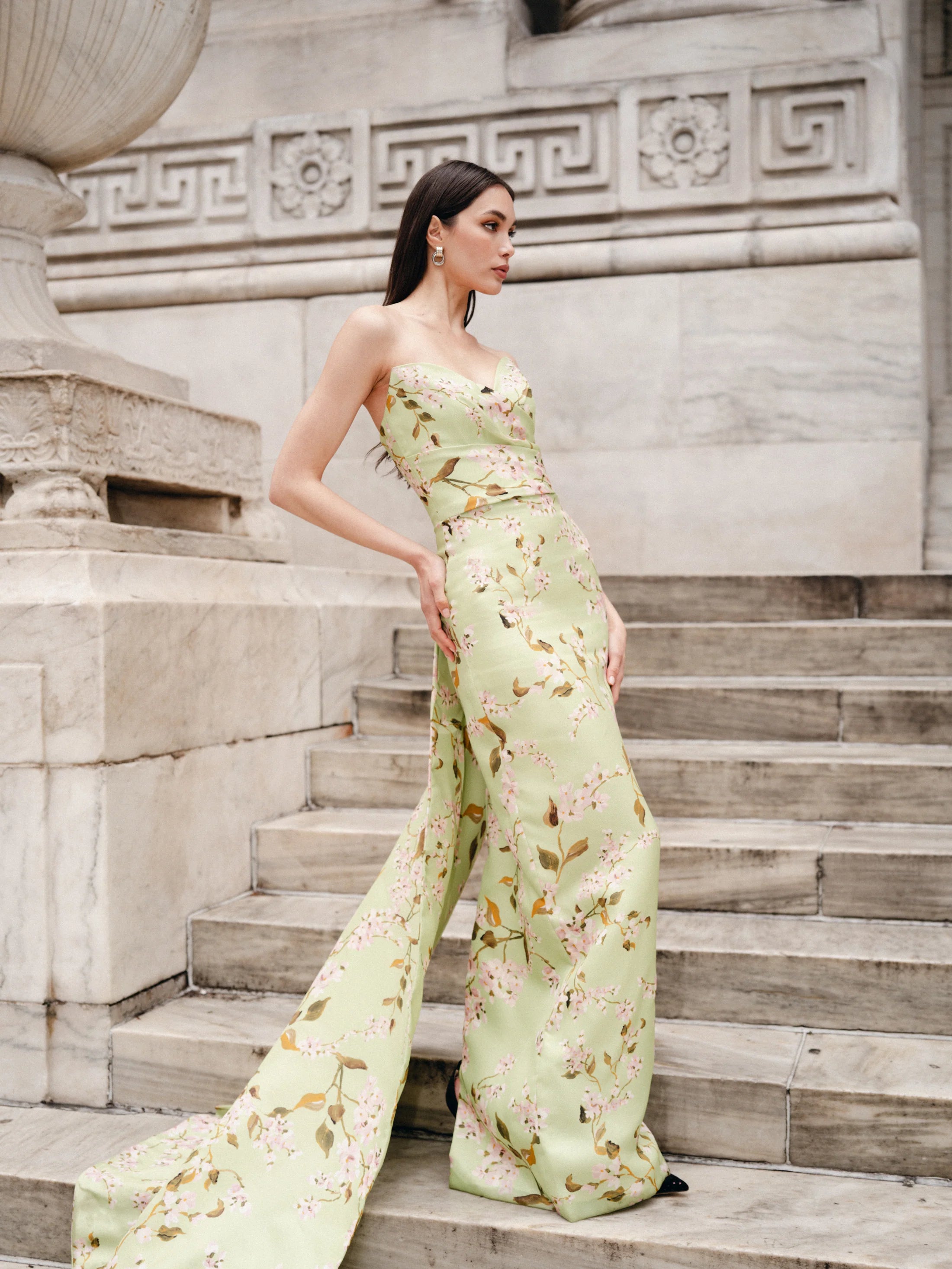 Radiating organic elegance, our Draped Bodice Column Gown with Train in Celadon/Multi Wisteria Printed Gazar is a true statement piece. The structured bodice, featuring a sculpted sweetheart neckline and vertical boning, seamlessly meets a defined waistline, enhancing the gown’s column silhouette. Artful draping flows from the right bodice across to the left, culminating in a breathtaking train that cascades from the left side of the back skirt, creating a striking balance of structure and movement.