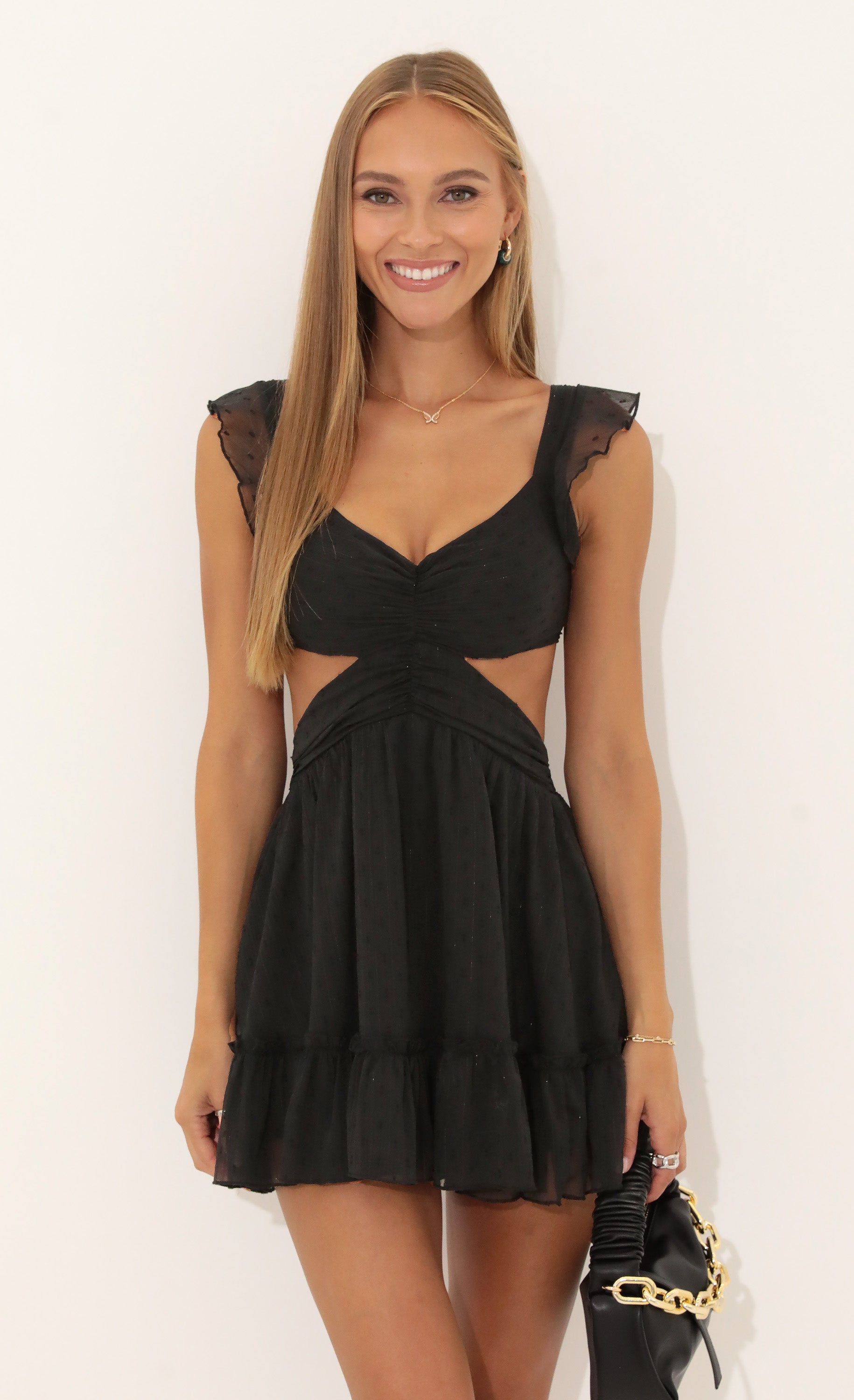 Made in Los Angeles - Fully Lined - Hand Wash Cold - Elastic Waist Band - Pull On Dress - Made in Chiffon Dots With Silver Stripes Length of Dress 31in/78.7cm All Measurements Are For A Size Small LUCY IN THE SKY garments are sourced and sewn by hand in Los Angeles. Handling the garments with care, hand washing and air drying is strongly recommended. Slight modifications might be made to improve garment quality.