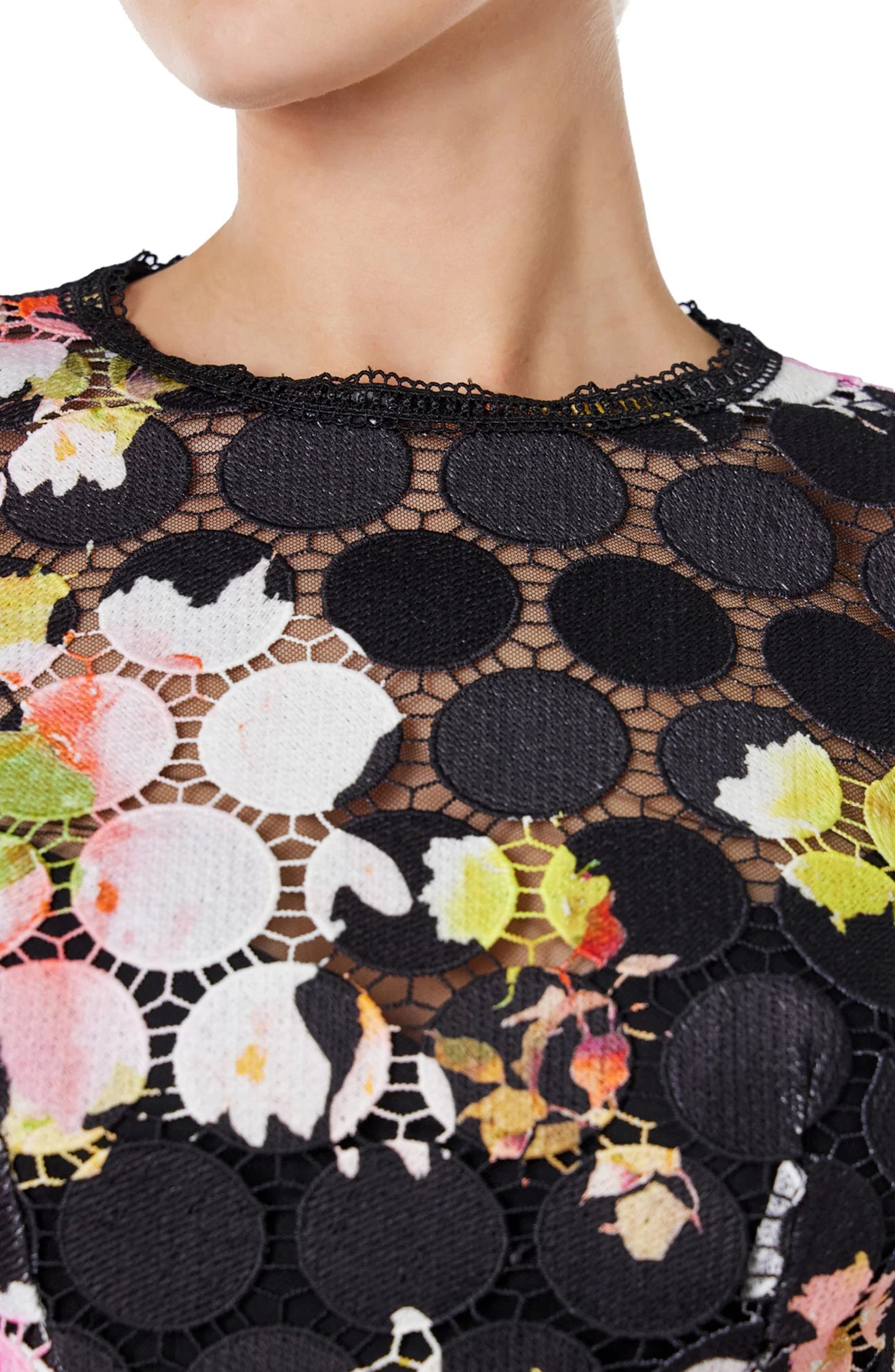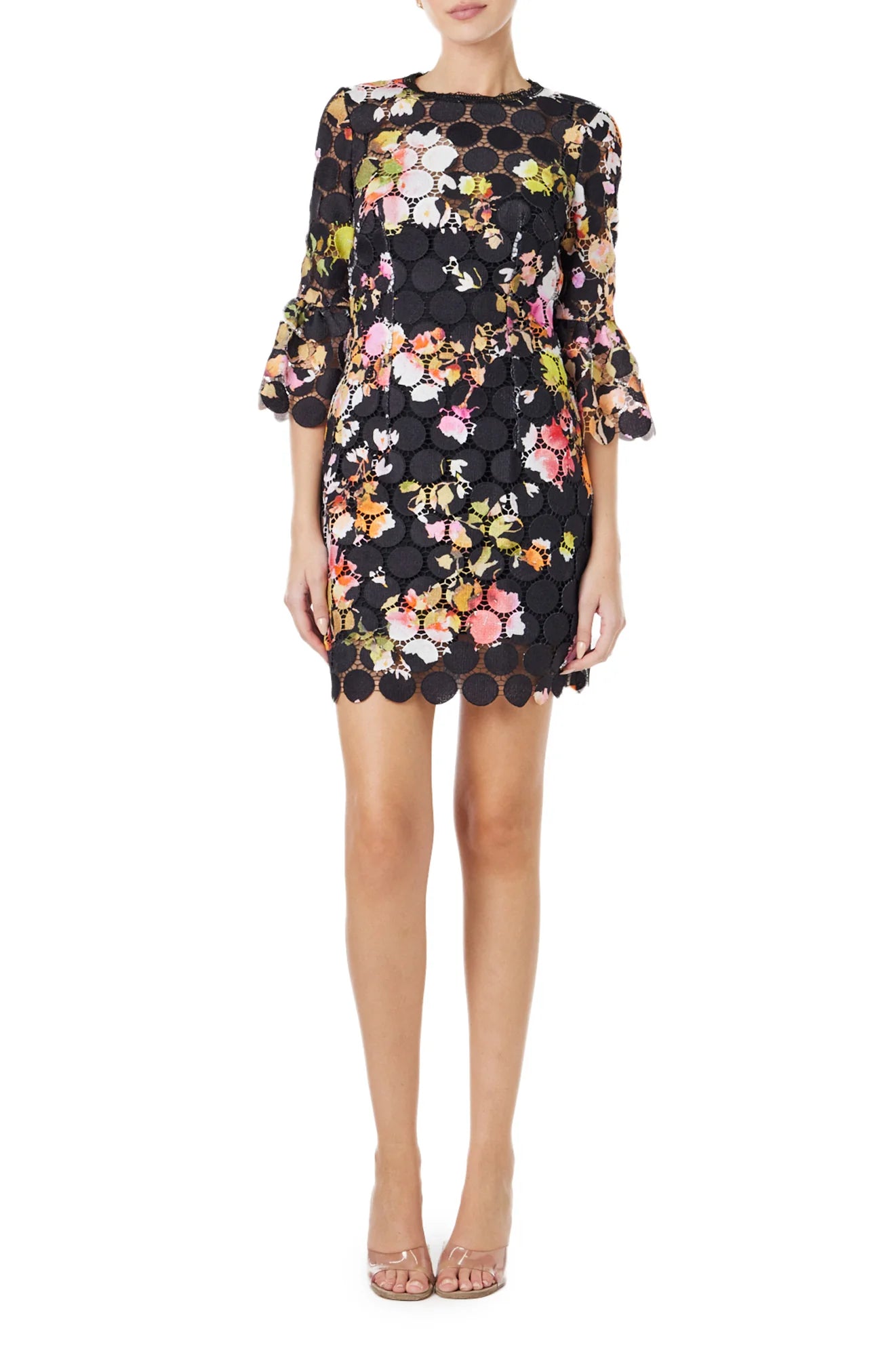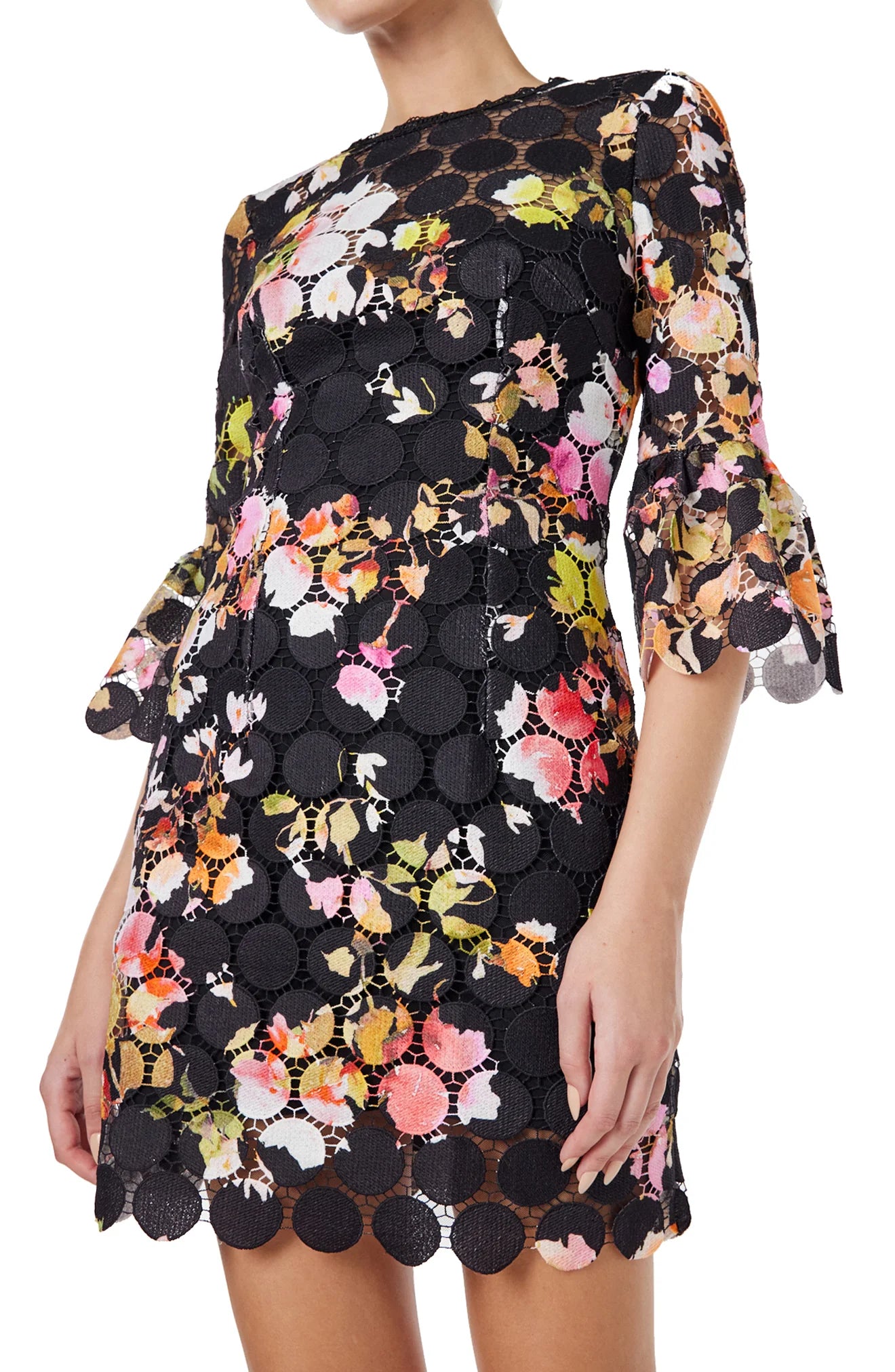 Jewel neck mini dress in floral printed circle lace with bracelet length bell sleeves.