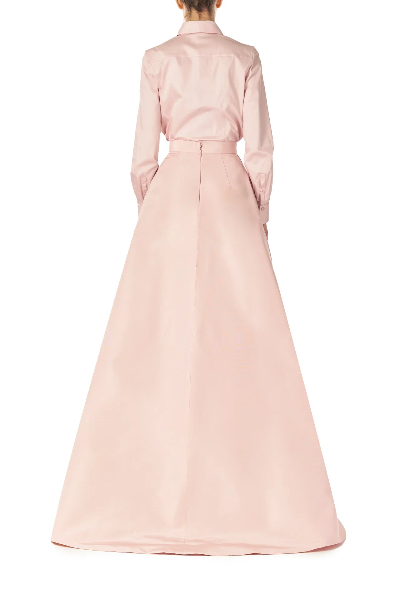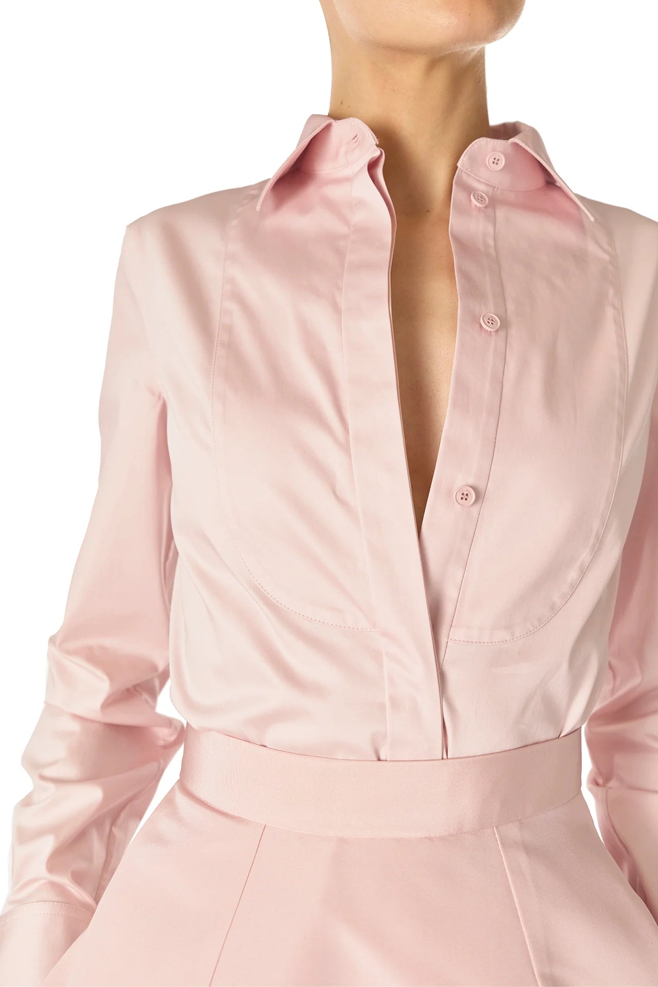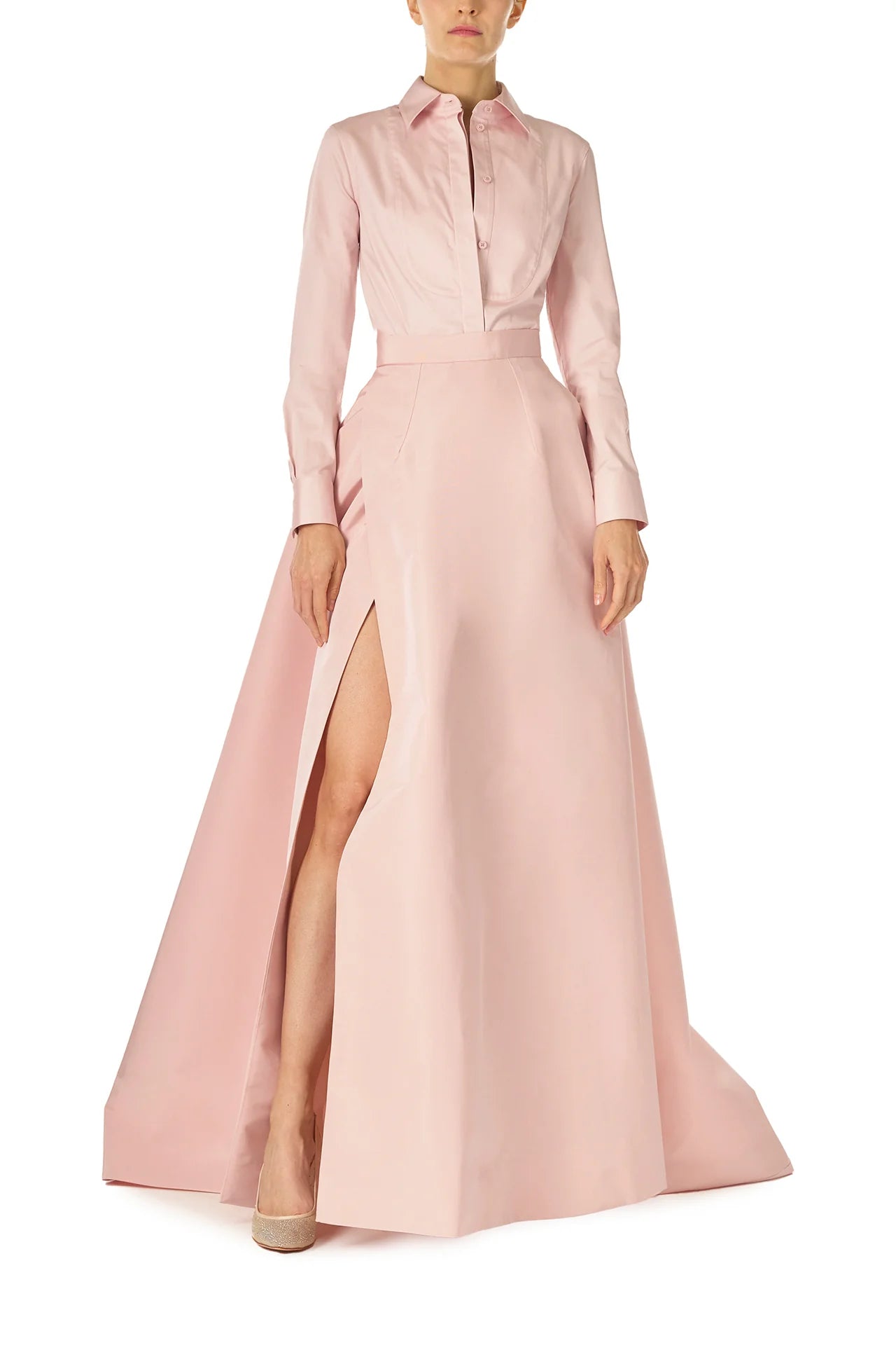 Collared. long sleeve button-front tuxedo skirt in Pale Blush cotton poplin.