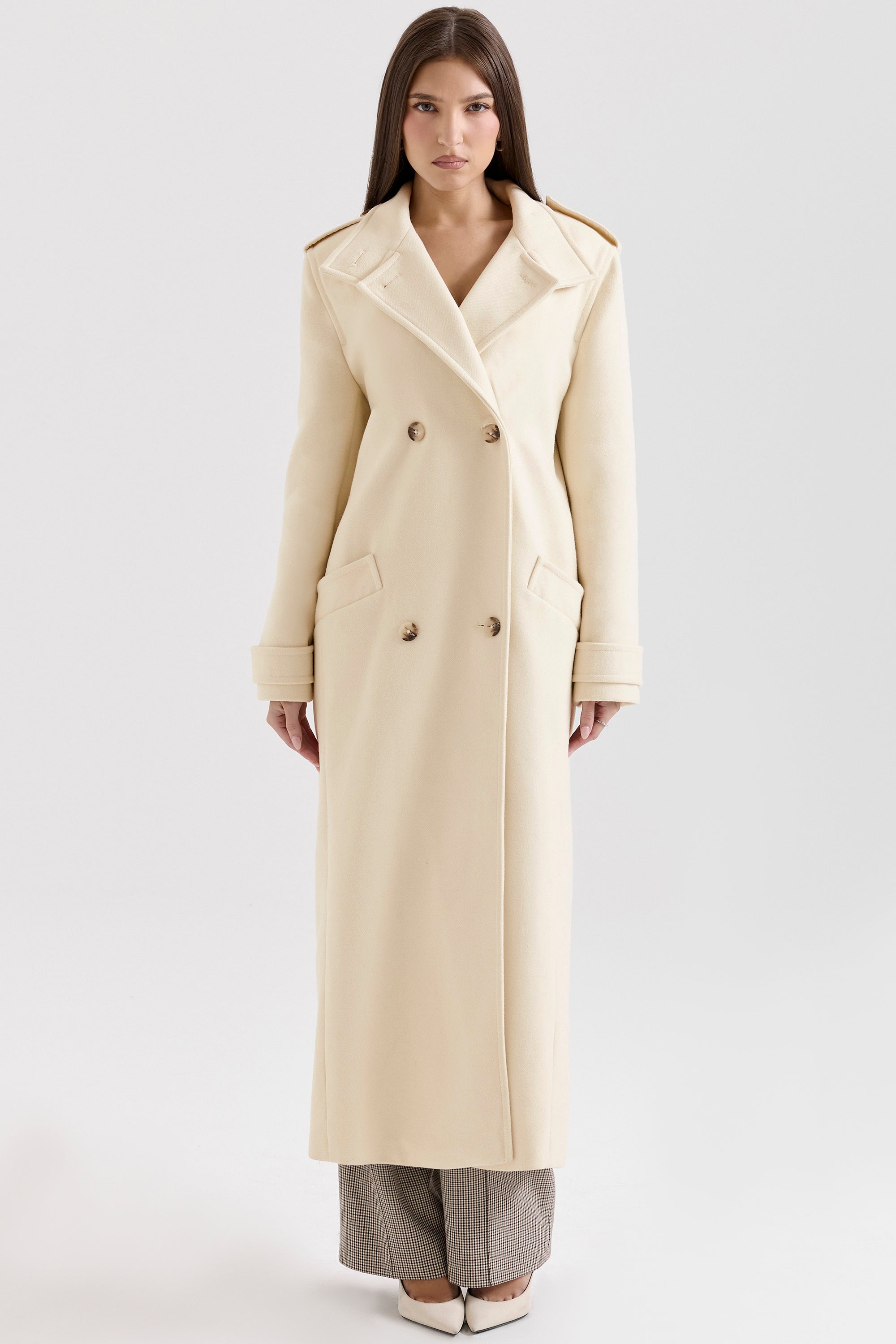 Brave colder days in style. Introducing our 'Sander' Coat, it's the only one you'll need this season. This staple piece is constructed to a classic double breasted silhouette with full length column shaping. We've kept to the clean aesthetic with some sophisticated details too – including a structured collar, button shoulder epaulettes, button cuff straps and a belt strap at the back. You won't want to take it off, it's perfect for everyday wear with an easy back vent and two side pockets for functionality. It's also fully lined to keep you cosy in any weather. Give your day-to-day outerwear the ultimate upgrade with the 'Sander'.