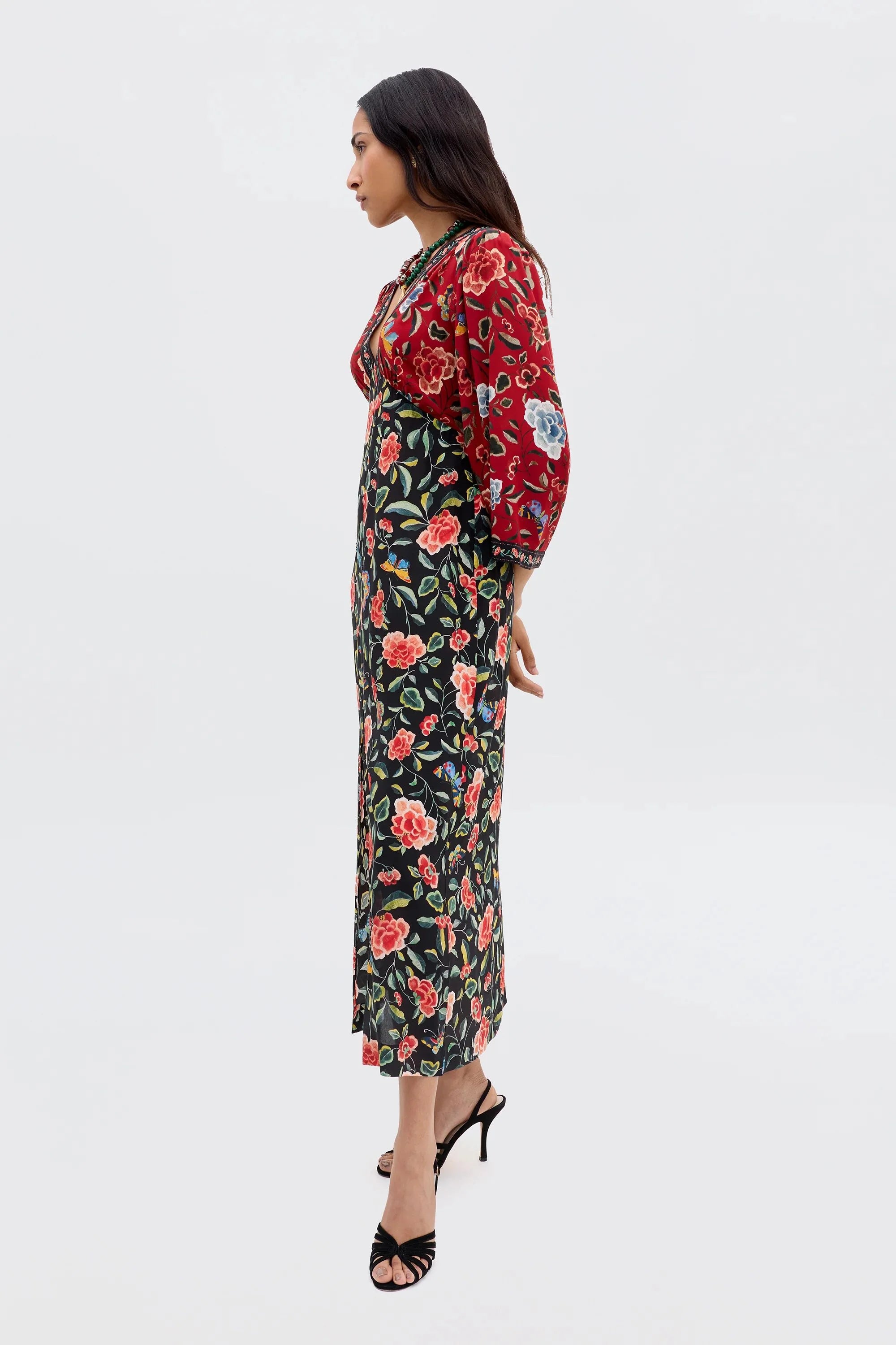Refined maximalism, expressive and timeless in style – rediscover Dahlia, now in our Butterfly Mix print. Patterned with florals resembling traditional chinoiserie and in warm hues, it's an easy transitional piece. Style with your favourite RIXO statement earrings for an eclectic finishing touch.