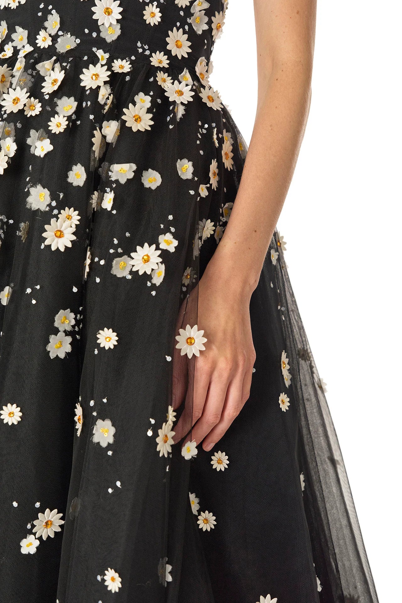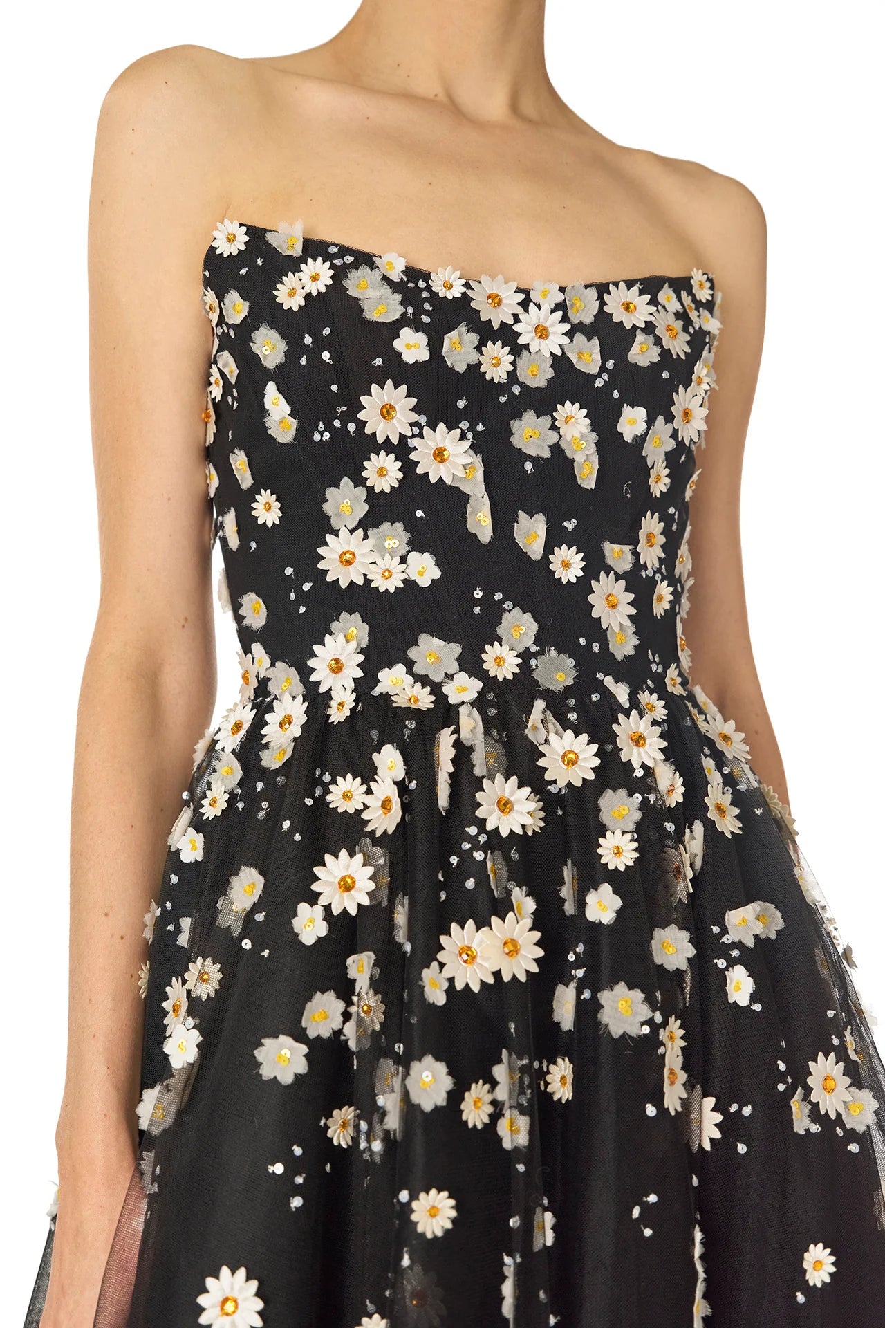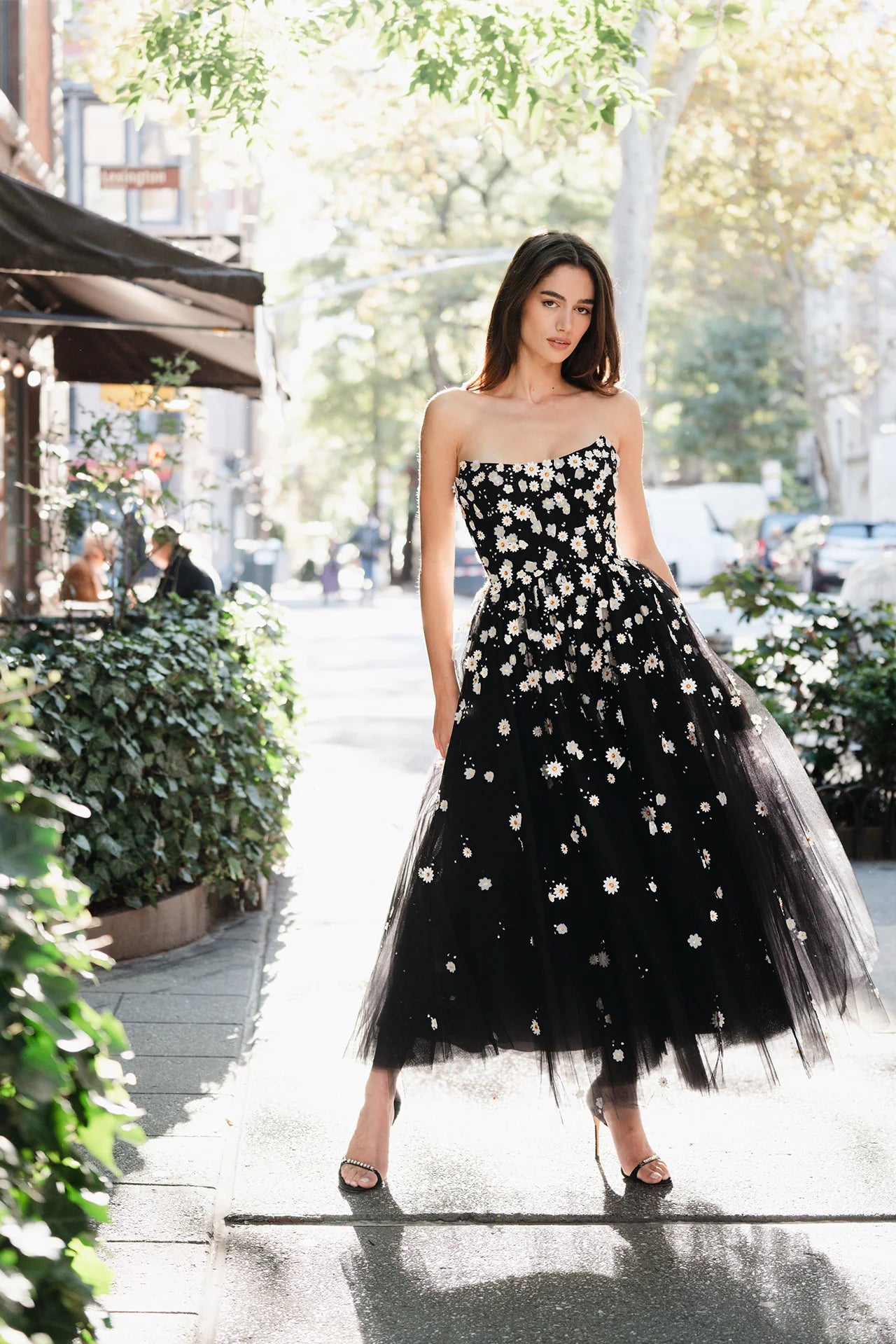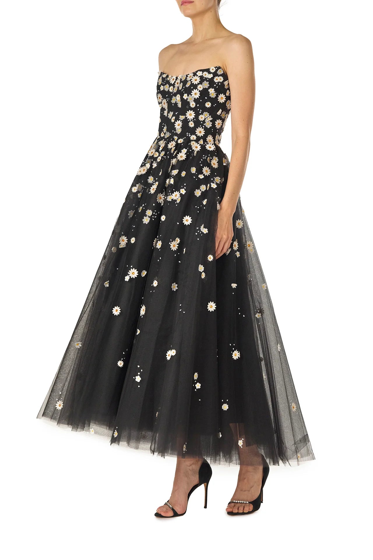 Delicately embroidered with charming daisies. this strapless mid-length Noir/Multi cocktail dress is a vision of flirty femininity. Layers of tulle and a vertically boned. delicately scooped corset juxtaposed with the intricate floral embroidery beautifully balance elegance with playful charm. Pair with the coordinating Daisy Embroidered Tulle Cape to complete your look (sold separately).