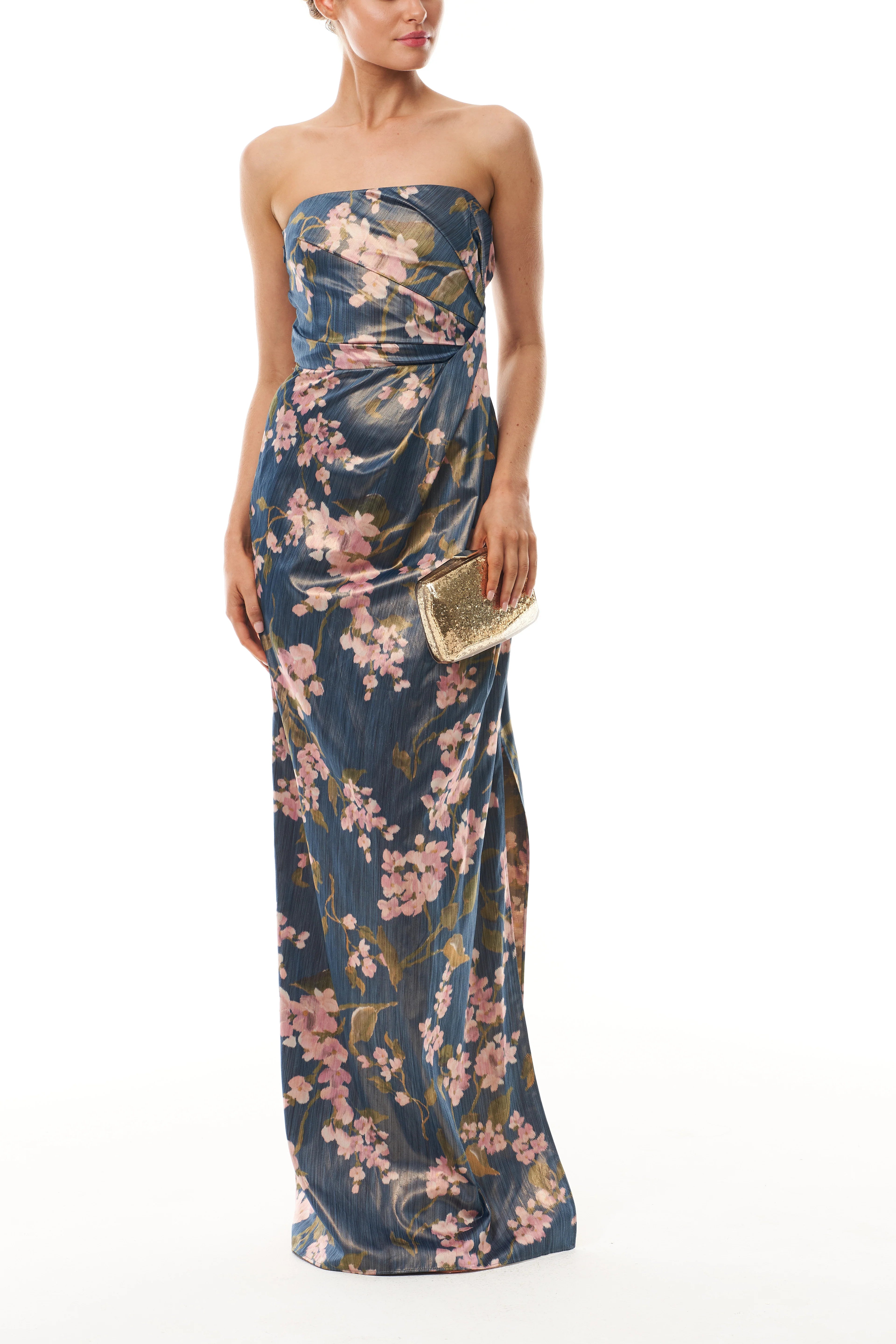 Our Draped Strapless Column Gown in Ocean/Multi is the picture of refined elegance. Crafted in soft Wisteria Printed Chine, the statuesque silhouette features a sculpted bodice with internal boning for support. Asymmetric draping sweeps from the neckline across the bodice and gathers at the waist, creating graceful dimension and movement. A side slit adds a subtle touch of allure to this modern classic.