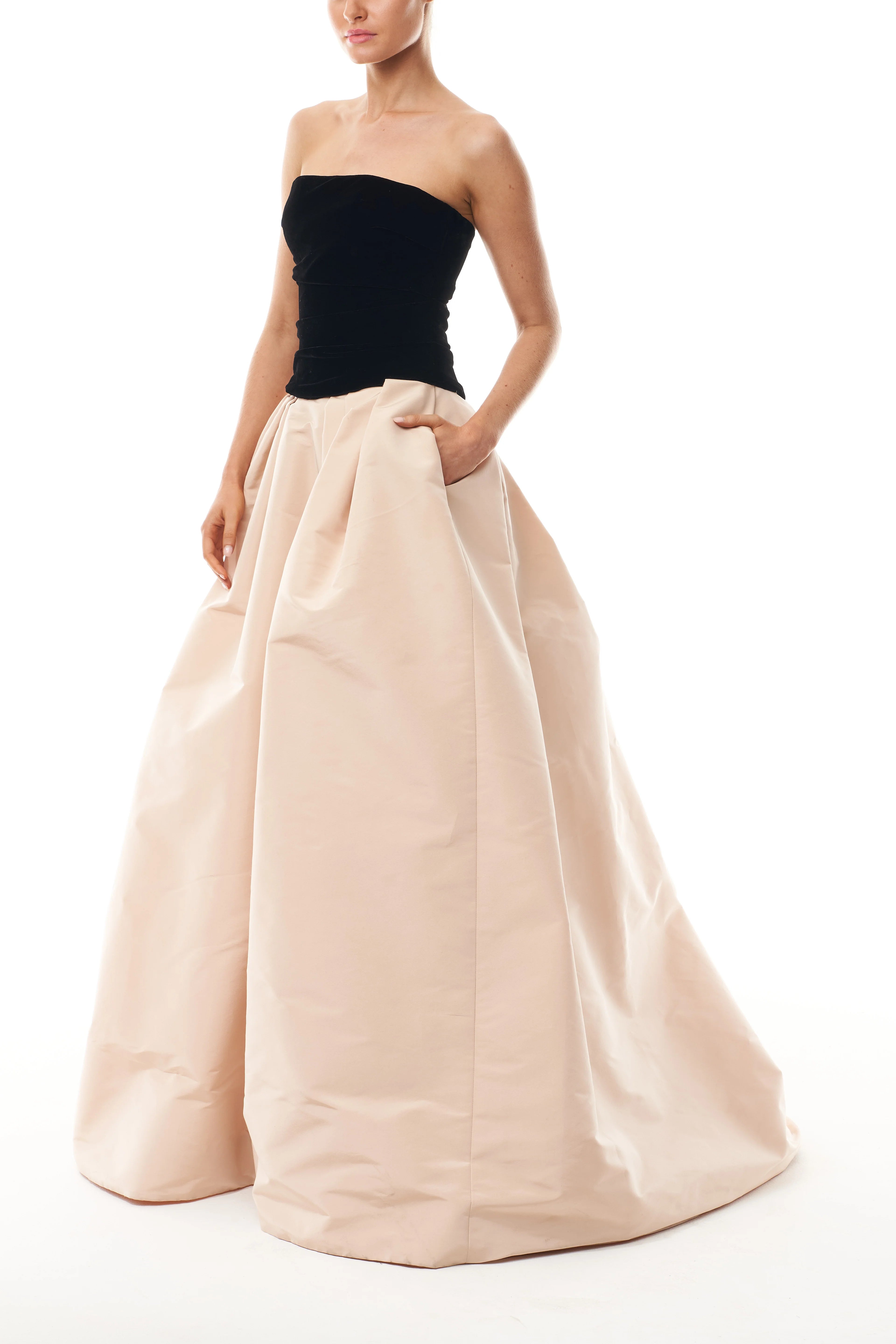 Our Drop Waist Velvet Faille Ballgown marries rich texture with refined volume. The strapless noir velvet bodice is sculpted with a dropped waist and soft draping, creating a romantic, corseted silhouette. Below, a full faille skirt in soft cameo unfolds with precise pleating at the waist and through the back, finishing with a subtle train that trails elegantly behind. A beautiful play of contrast and structure, this gown balances drama with timeless sophistication.