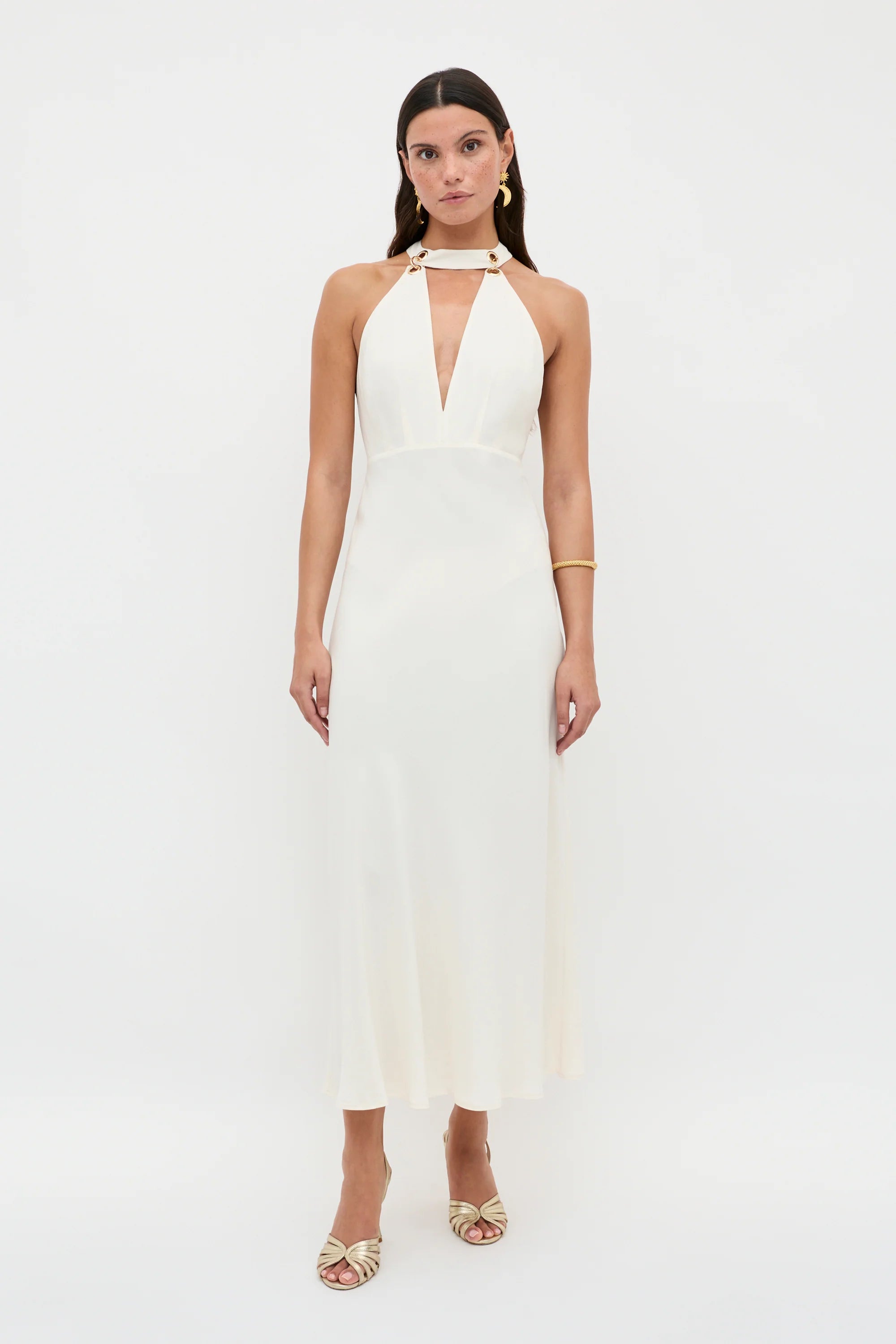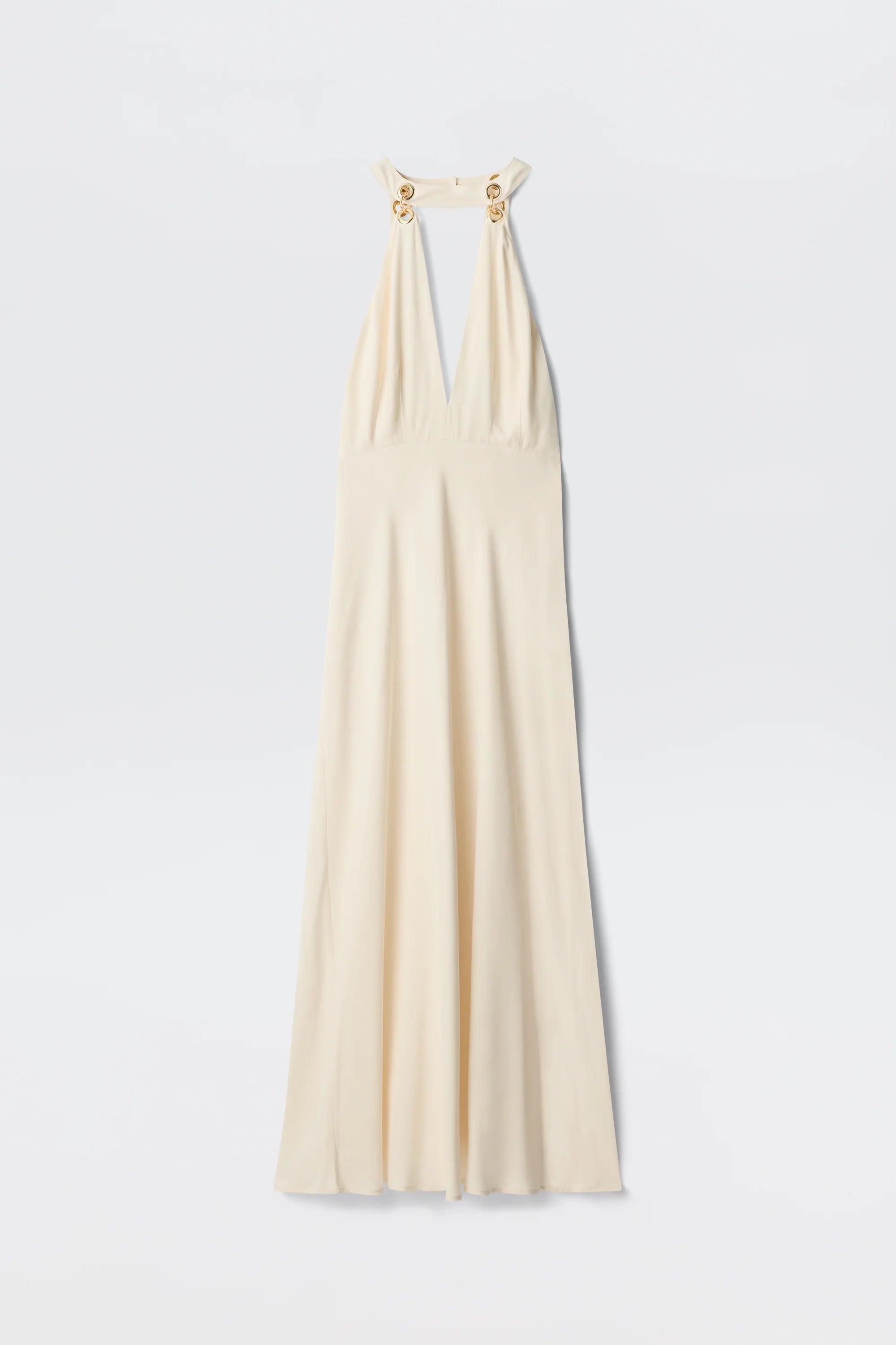 Eleanora was one of the very first RIXO styles and inspired by a vintage dress we fell in love with. With a flattering bias-cut hem, deep neckline and gold link detailing, it's sexy but effortless. Style with our Mavi heels and Salene Bracelet for a look that evokes ‘70s glamour with a modern feel.