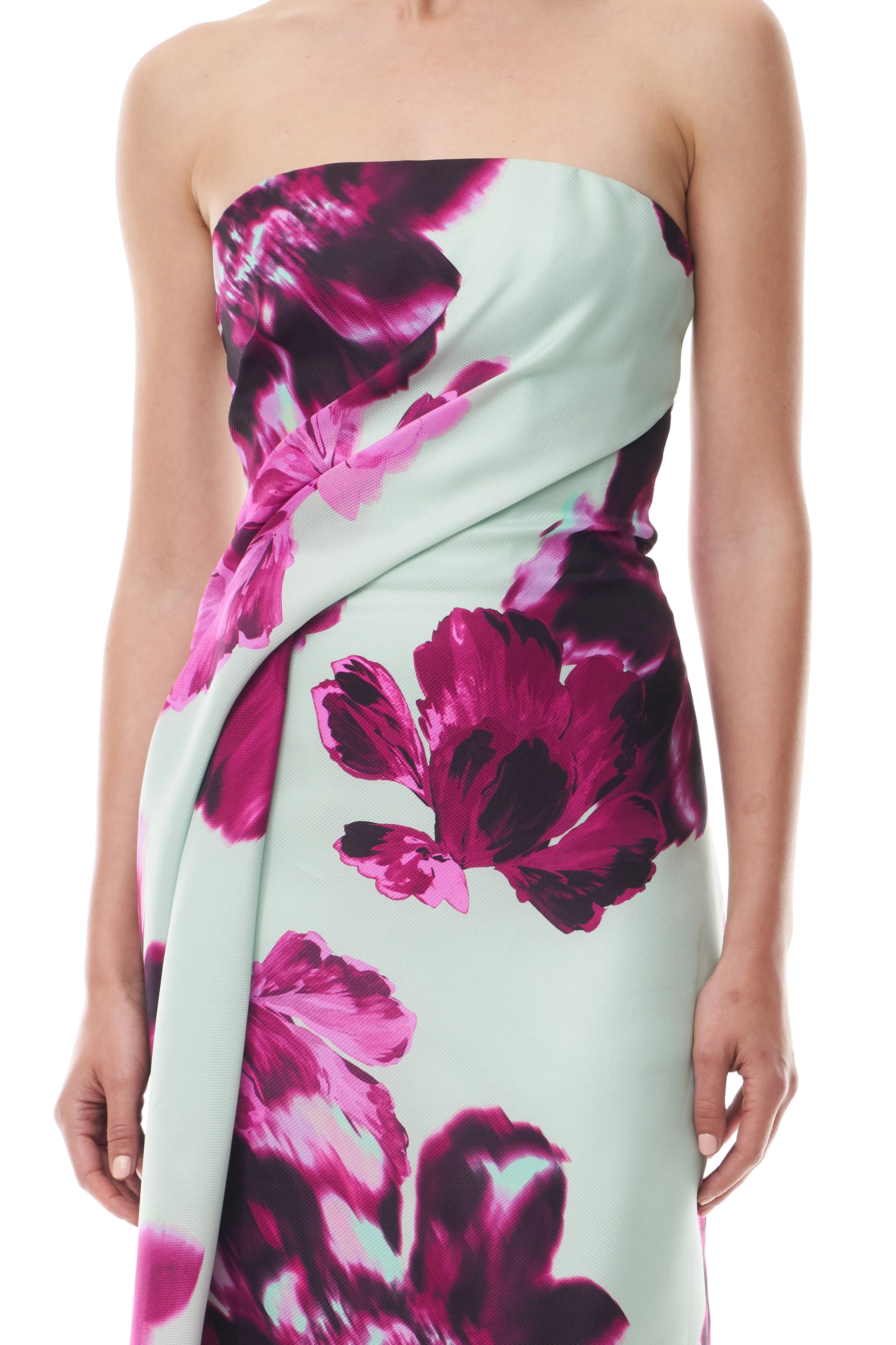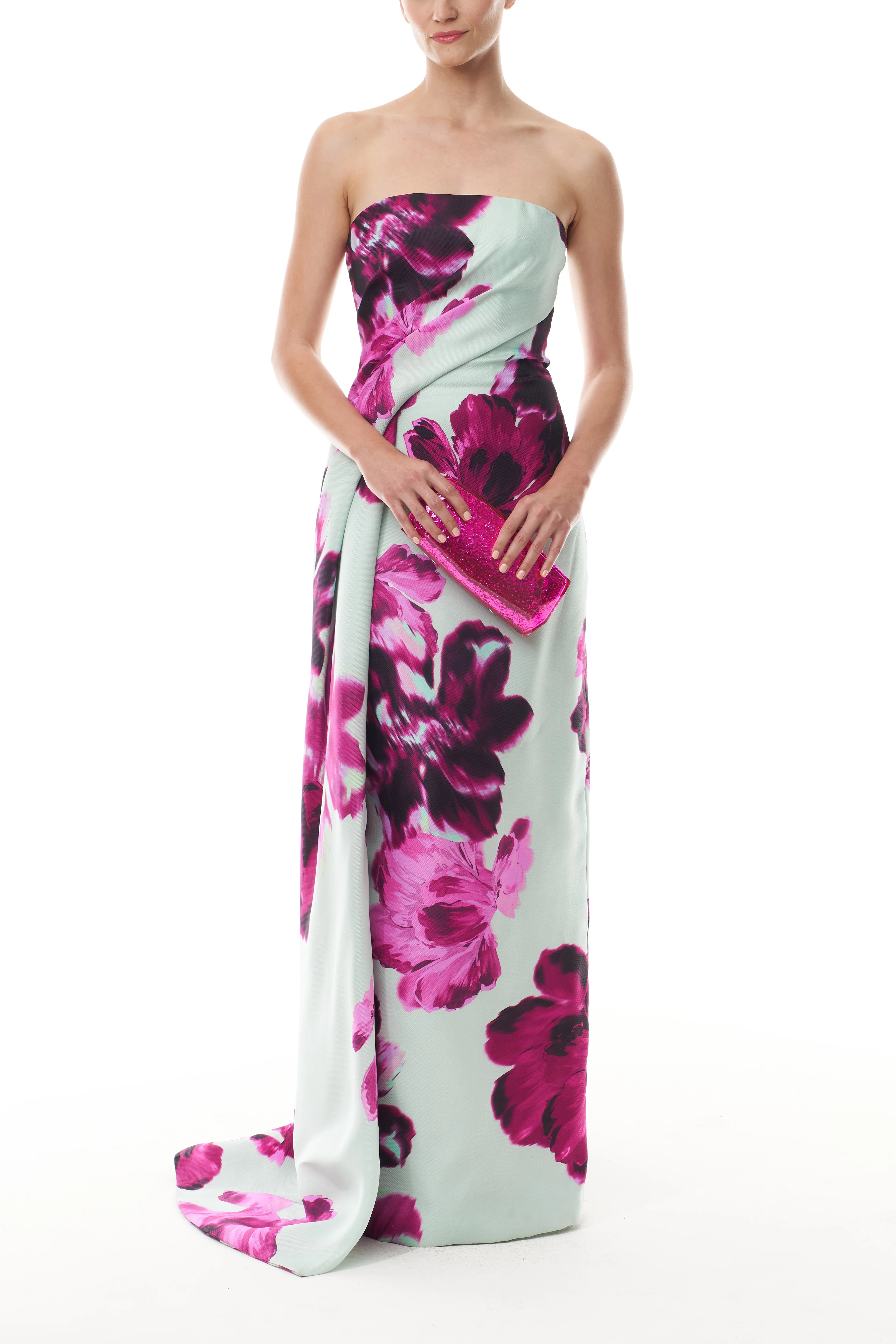 This strapless column gown makes a striking statement in Electric Floral Printed Gazar. The structured, vertically boned bodice features a straight-across neckline, offering a sculpted fit. Draping sweeps gracefully from the left bodice to the right hip, where it cascades into a dramatic floor-sweeping train. The vibrant Lagoon/Multi palette enhances the gown’s bold fusion of structure and movement.