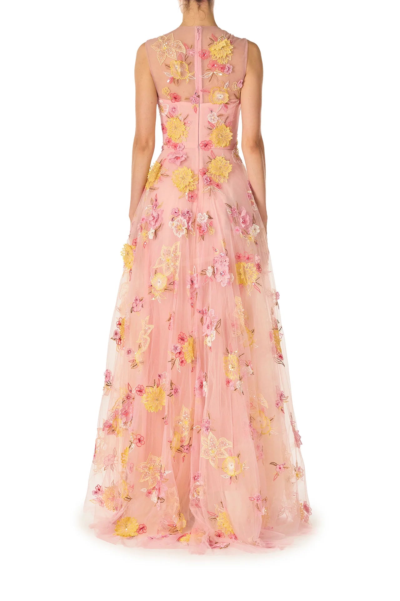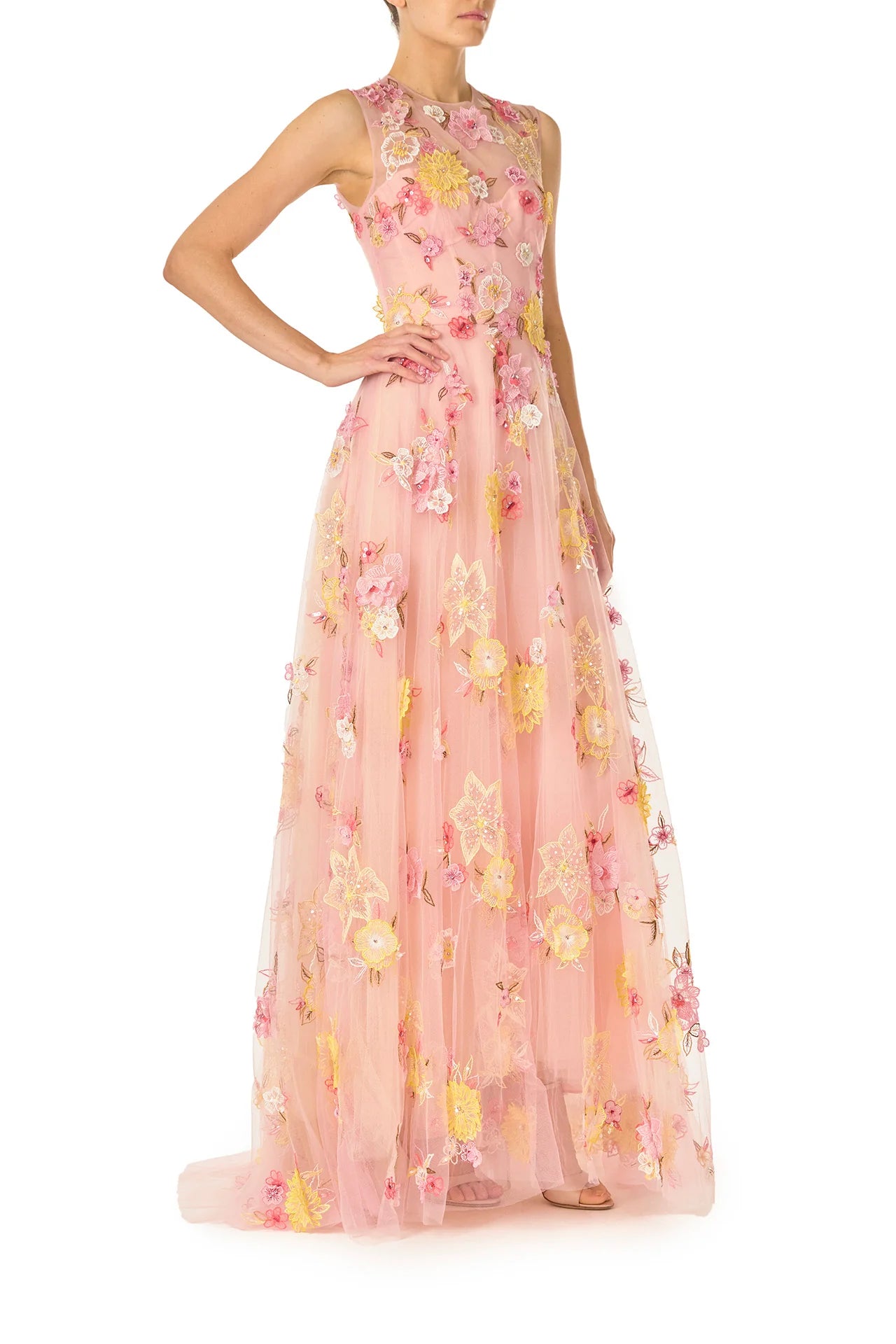 This ethereal gown features delicate rosé tulle, adorned with intricate three-dimensional floral embroidery in soft yellows, pinks, and white. Scattered across the bodice and skirt, the embroidery adds depth and texture, while the illusion neckline and bodice subtly reveal the structured, underwire-boned corset beneath. A defined waist seam enhances the silhouette, flowing into a soft A-line skirt that moves with effortless grace.