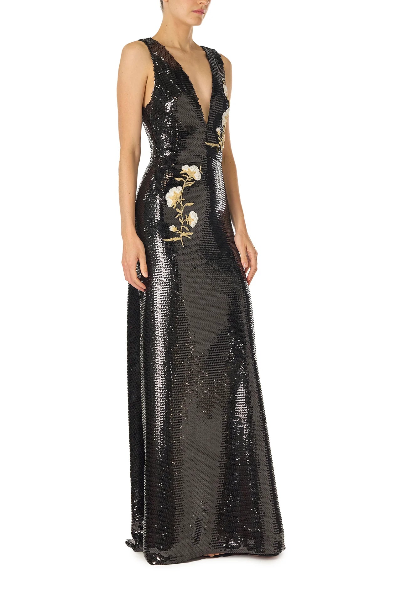 This striking deep-V gown blends bold Noir sequins with delicate embroidered floral appliqués. The sculpted bodice cinches at the natural waist. creating a defined silhouette that flows into a sleek. A-line skirt with appliqués subtly cascading downward. A fully covered back adds balance. while a slight sweep at the hem enhances the gown's graceful movement.