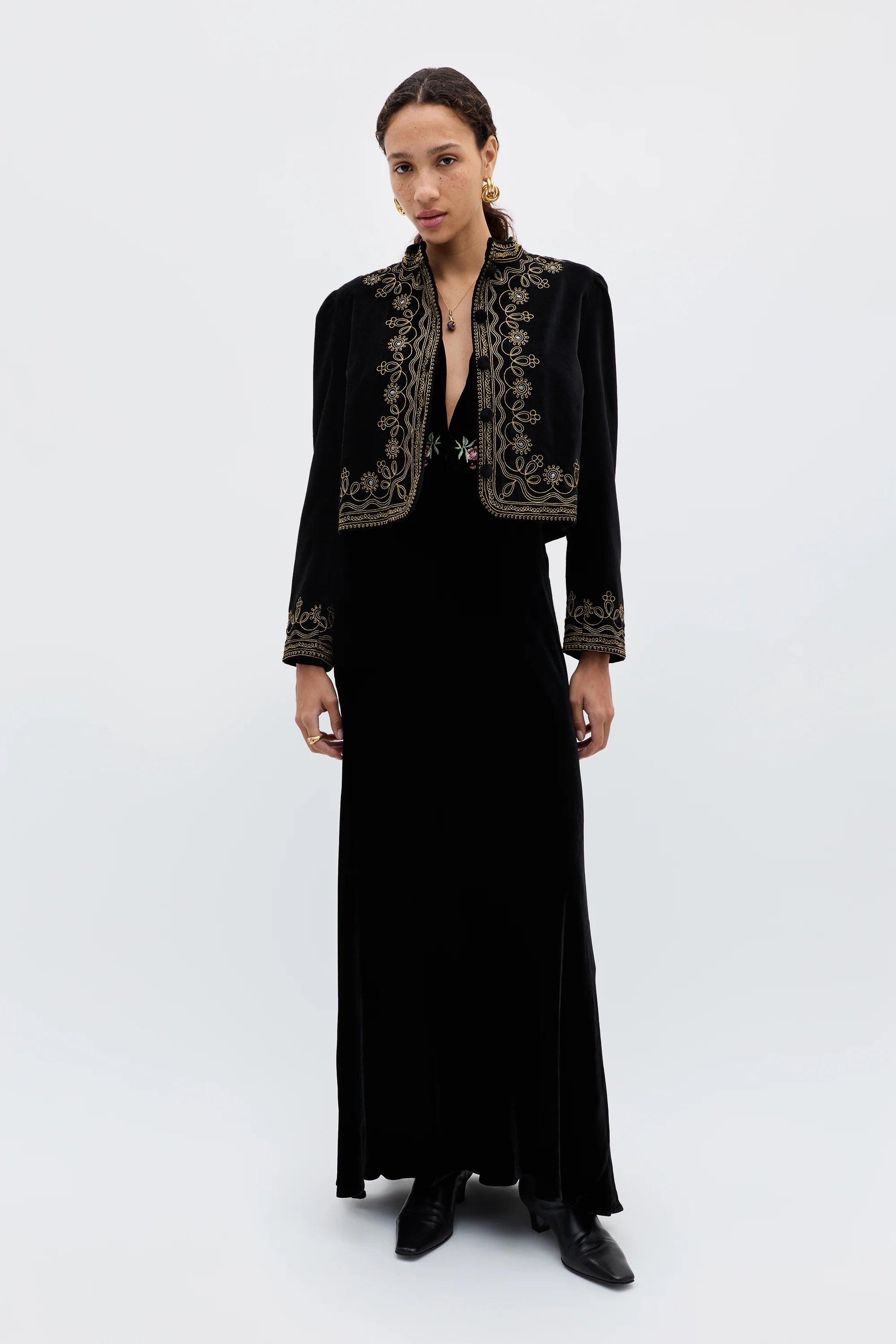 A dress from the 1930s inspired our elegant Emory gown. A bestselling shape, it has a deep but narrow neckline and blouson sleeves. This velvet version is blended with silk and embroidered with tumbling flowers and butterflies.