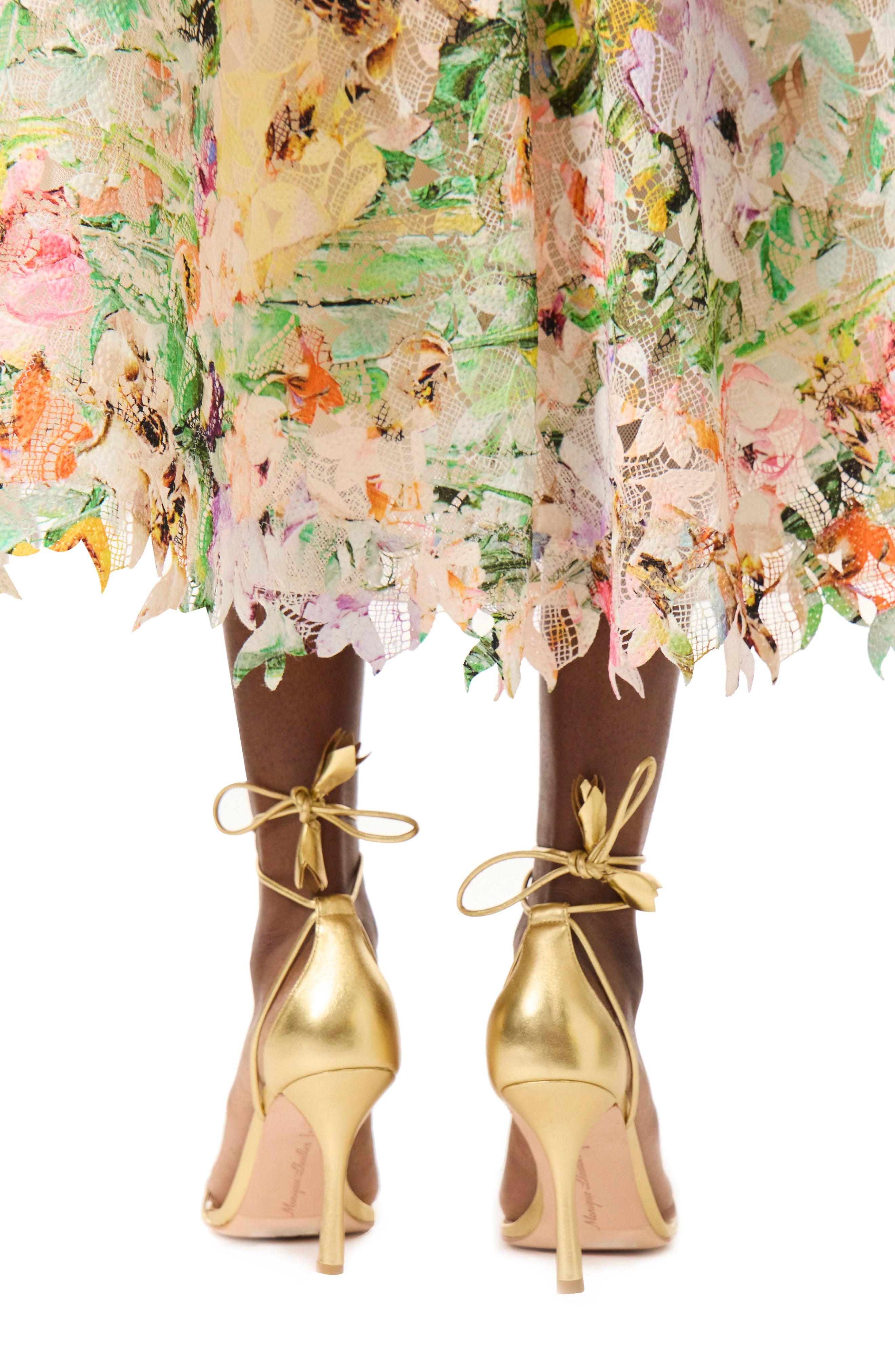 Tea-length dress in floral printed lace with sweetheart neckline and lace scallop detailing.