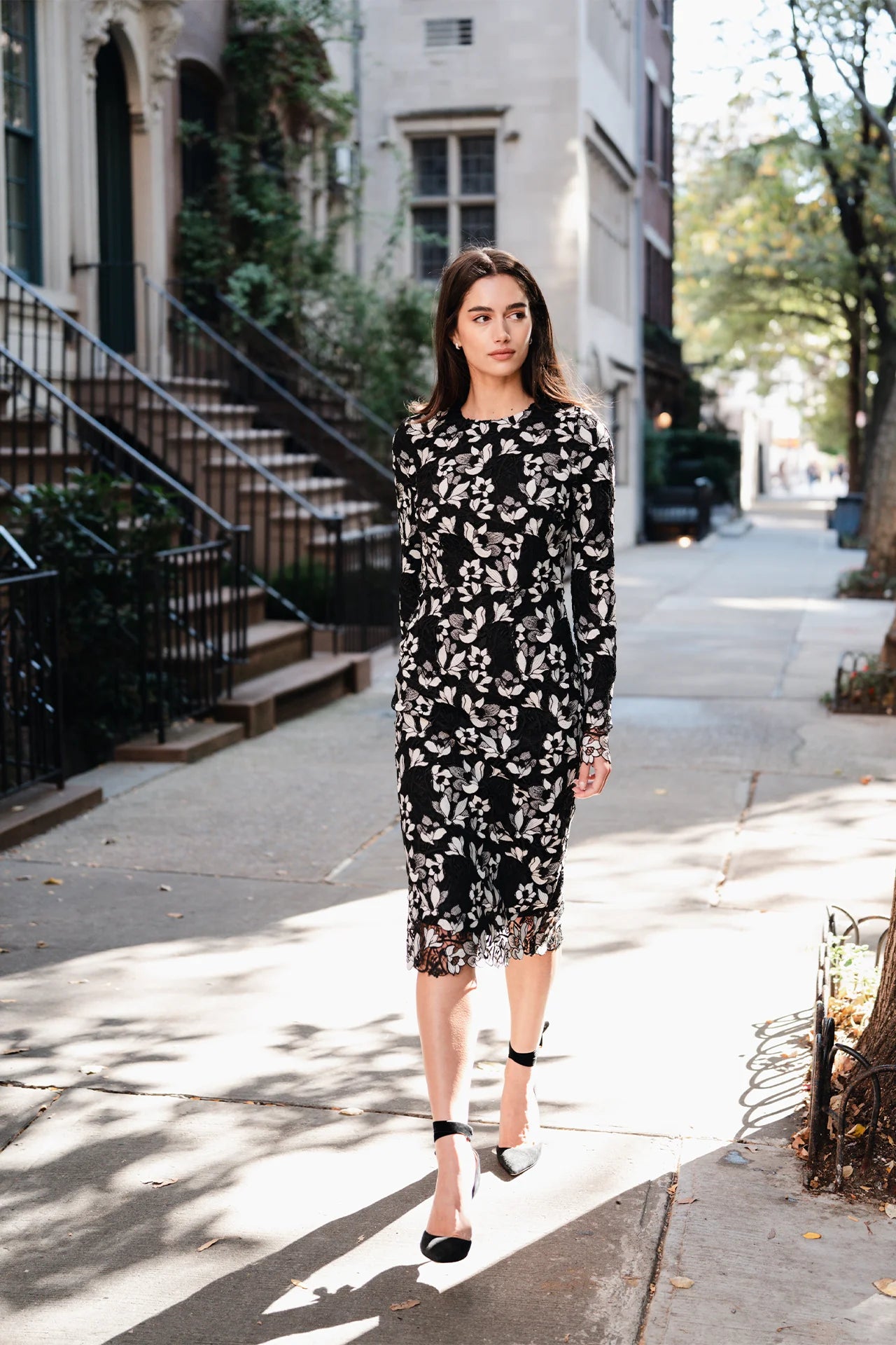 This long-sleeve sheath dress is crafted from floral guipure lace. with Silk White blooms set against a Noir backdrop for a striking contrast. Designed to sculpt the body. it features a seam at the waist and falls just below the knee. A jewel neckline and scalloped lace hem add refined detail to this elegant silhouette.