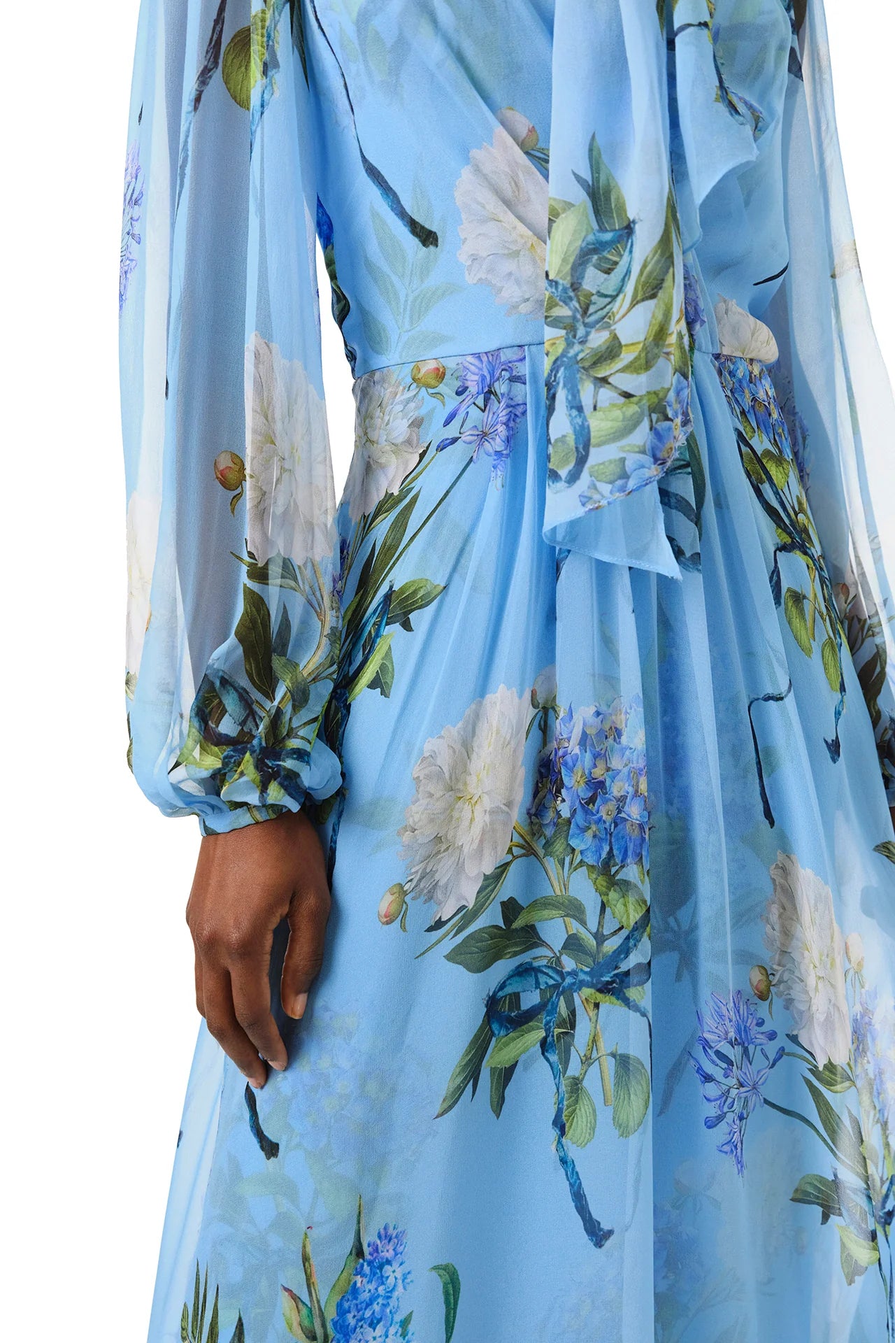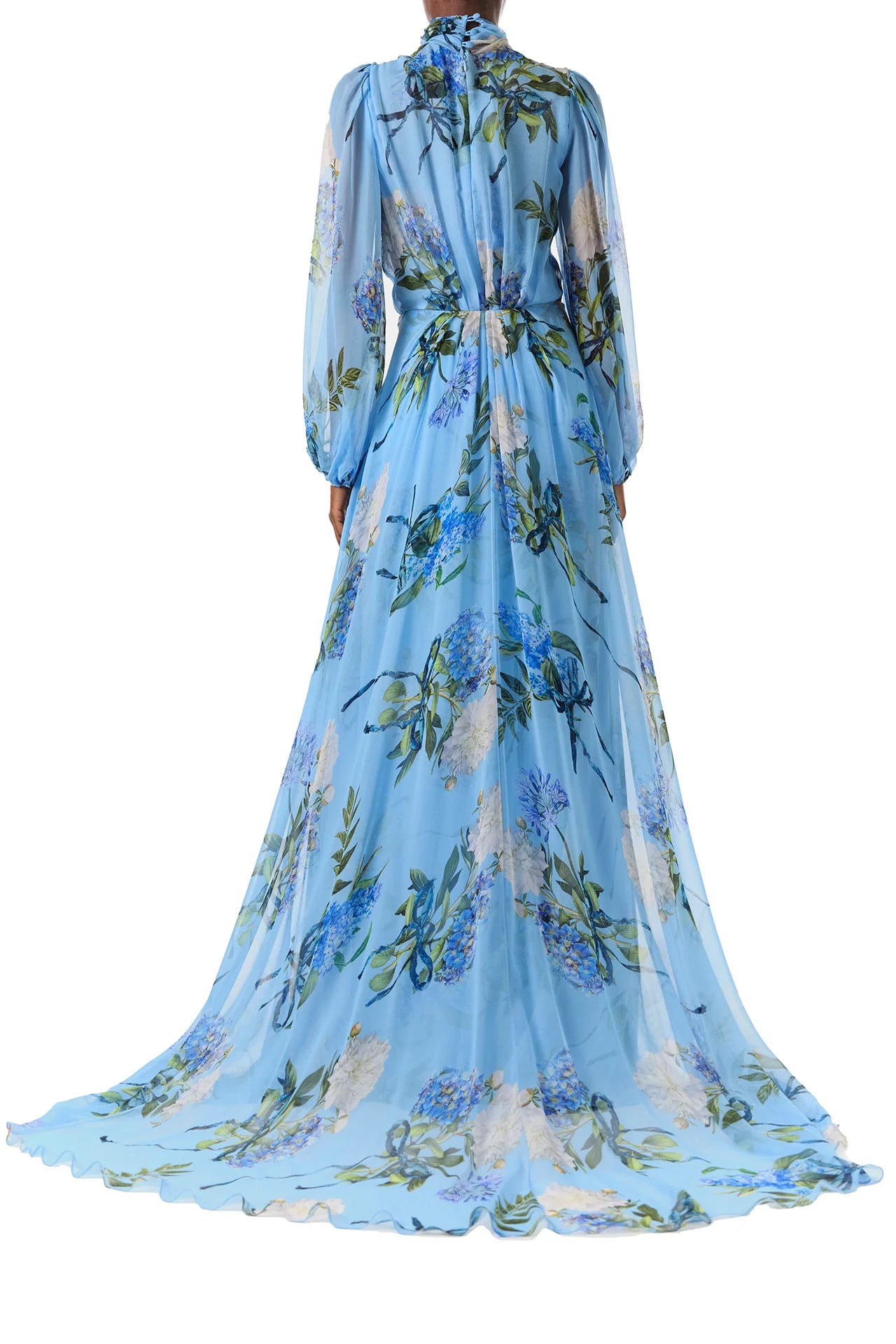 Our Floral Printed Chiffon Long Sleeve Gown is crafted from ethereal Sky Blue/Multi Hydrangea Printed Chiffon. A subtle V-neckline sits under a delicate self-tie bow. accented with self-covered buttons at the back neckline. Billowed sleeves with gentle gathering at the shoulders enhance the airy silhouette. while a cinched waist bodice flows effortlessly into an A-line floor-length skirt. finished with a dramatic train. A detached slip lining provides coverage while allowing the sheer chiffon to maintain its light. graceful movement. creating a breathtaking sense of fluidity with every step.