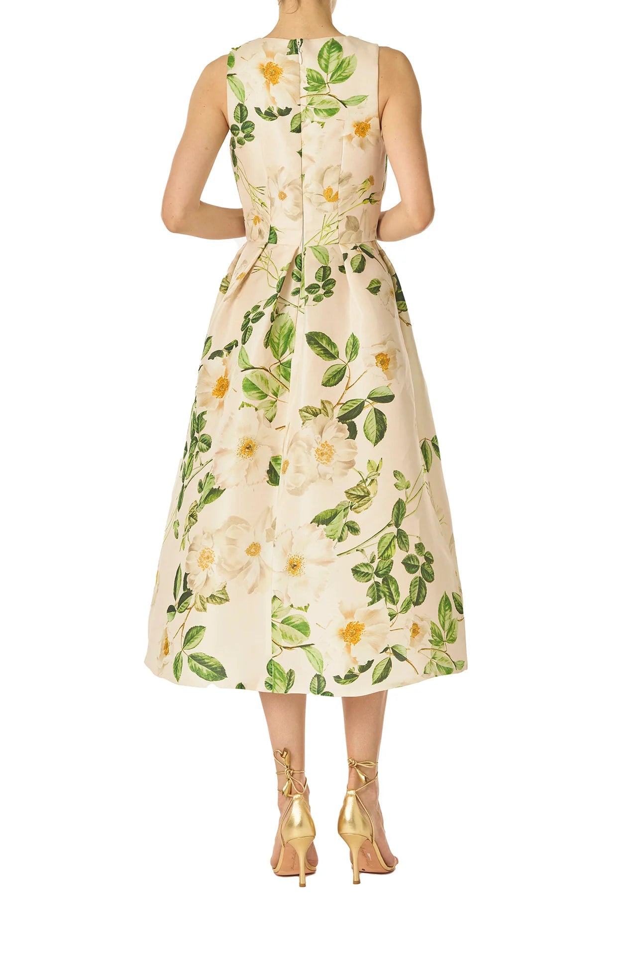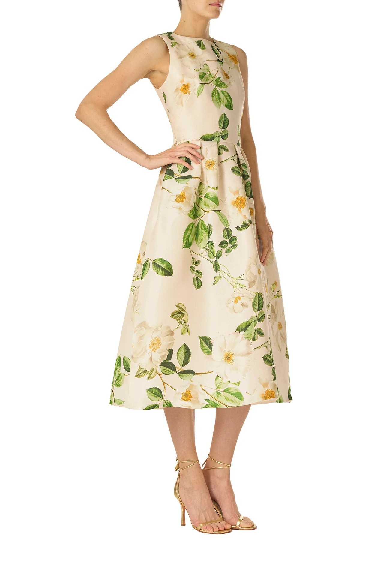 Our Bellini/Multi Floral Sleeveless Day Dress features a stunning Sea Spray Rose-printed Gazar. Darts at the bust help contour the bodice. while a jewel neckline adds a refined and modest touch. Pleats create subtle volume in the skirt. while discreet pockets add a playful element to this sophisticated silhouette. The romantic floral print and construction details perfectly balance polished elegance and effortless charm.