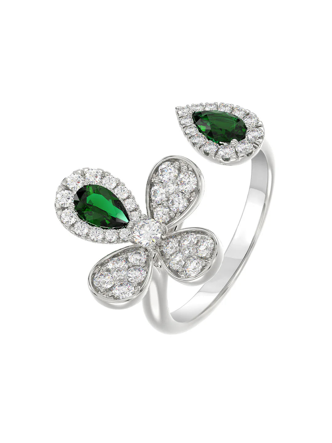 The Floral White Gold Ring features an 18 karat white gold band set with diamonds. The open ring is enriched with a diamond four-leaf clover and teardrop-shaped natural emerald with pavé diamonds.