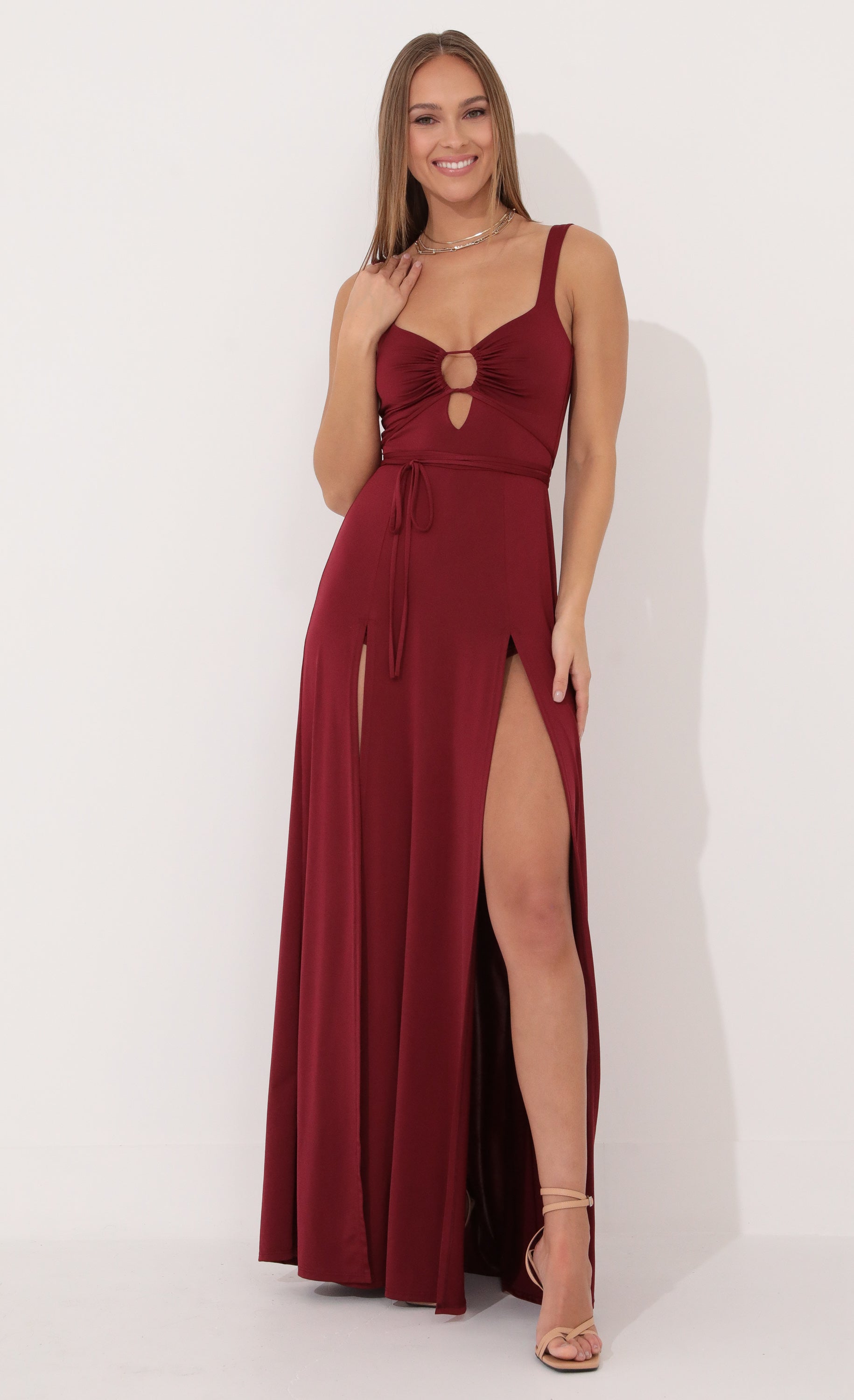 This sexy but elegant maxi dress will make people stop and stare everywhere you go. Featured a small front tie detail at bust and adjustable straps to tie around your waist. Made in our stretch fabric this will show off your curves and legs with the double slit details. Made In Los Angeles - 100% Polyester - Stretch Fabric - Built in Hot Pants - Hand Wash Cold Length of Dress Measures 57in/144.7cm All Measurements Are For A Size Small