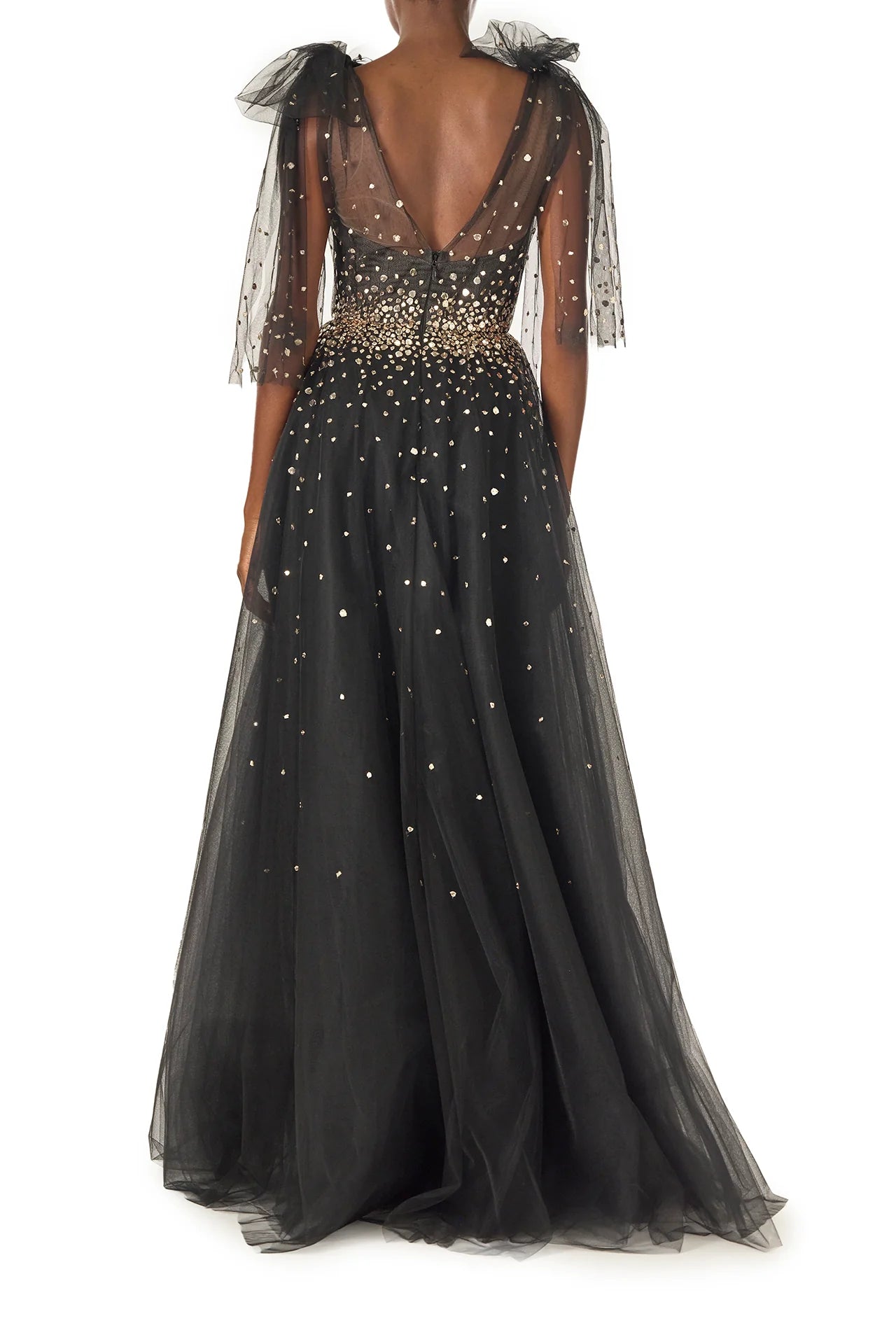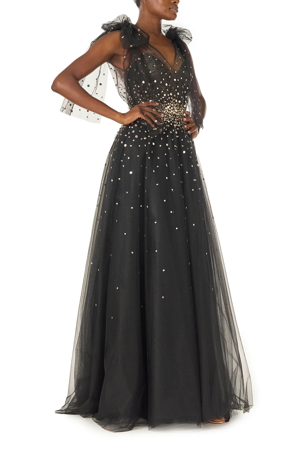 Our Gown with Bow Shoulder Ties in Noir Tulle with Gold Embroidery is a celebration of femininity and glamour. A deep V-neckline and sheer tulle overlay accentuate the vertically boned corset. which extends into delicate bow shoulder ties for an ethereal touch. Gold embroidery is densely concentrated at the waist before gradually dispersing upward towards the bodice and cascading down the voluminous ballgown skirt. A low V-back adds a hint of allure. completing this breathtaking design.