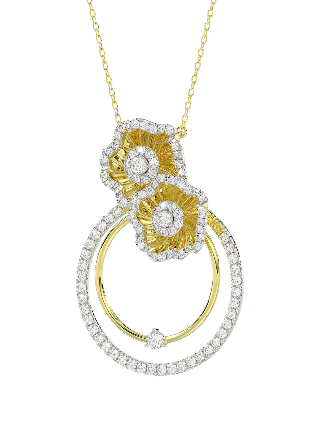 The Halo Flower Yellow Gold Pendant Necklace is an 18 karat yellow gold chain with a concentric yellow gold hoop pendant. The outer ring features pavé diamonds. while the inner ring is a solid band adorned with a single diamond at the base. At the apex of the hoops sits a set of yellow gold and natural diamond camellia-inspired flowers.