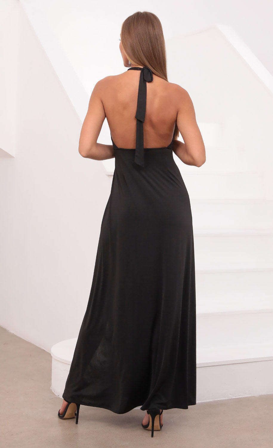 This stunning halter neck maxi dress is classy, sexy, and elegant. Made for the heart breaker, dream chaser, and love embracer. Made in our black Venezia fabric. The perfect maxi for special occasions, dinner dates and formals all year long. Pair with crystal earrings and cute heels and all eyes are on you! - Tie-Back Detailing - Double Layered - 100% Polyester - Hand Wash Cold Length of Dress Measures 57in/144.7cm All Measurements Are For A Size Small