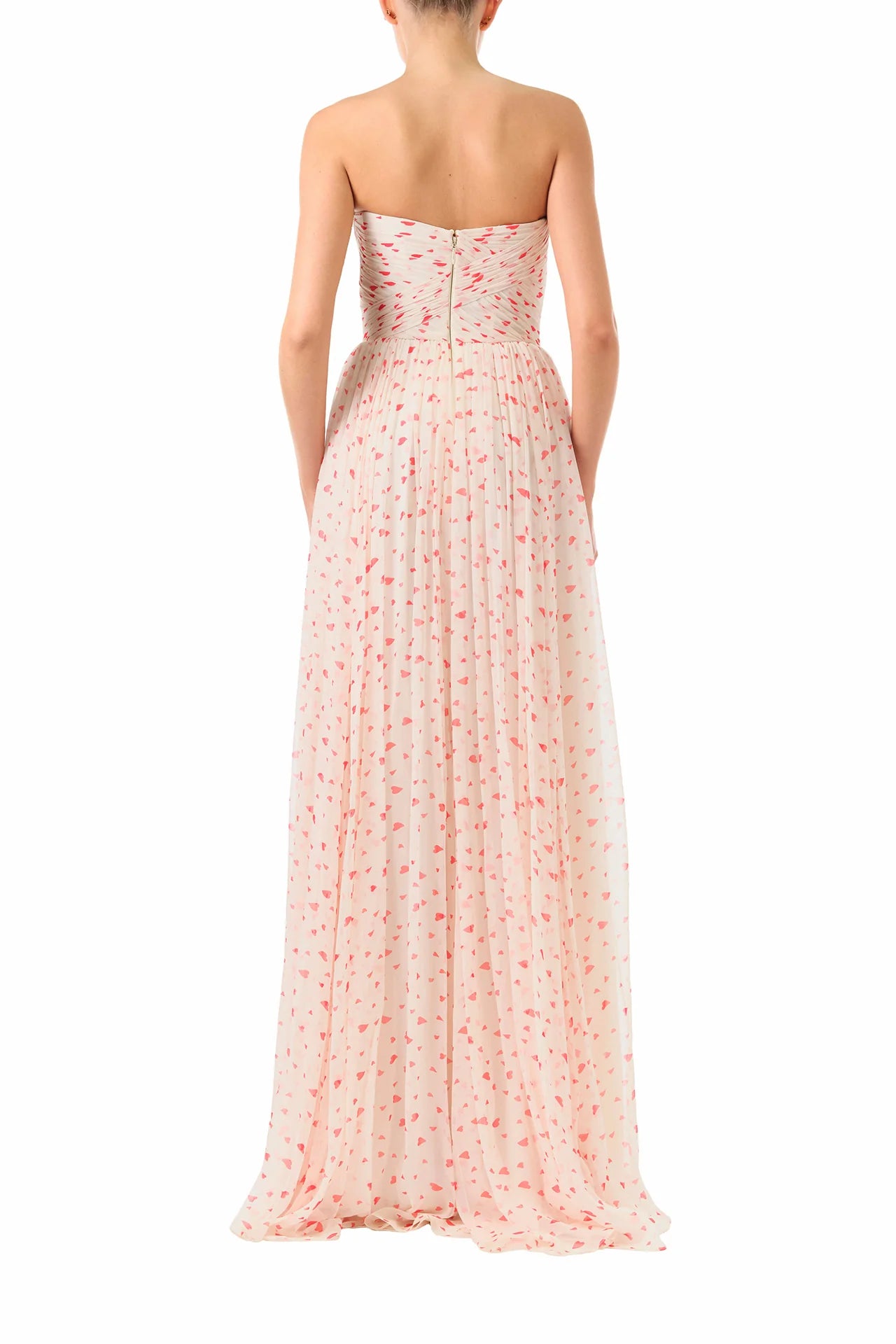 Our Heart Print Chiffon Gown in Creme/Multi exudes effortless romance. Light boning offers soft structure to the draped bodice. complemented by a sweetheart neckline. Chiffon is expertly draped in different directions. sculpting the bodice and continuing seamlessly onto the back. The skirt gathers slightly at the defined waist. adding subtle volume. while a hint of a sweeping train finishes the back hem. Pair with the coordinating Heart Print Chiffon Cape to complete your look (sold separately).