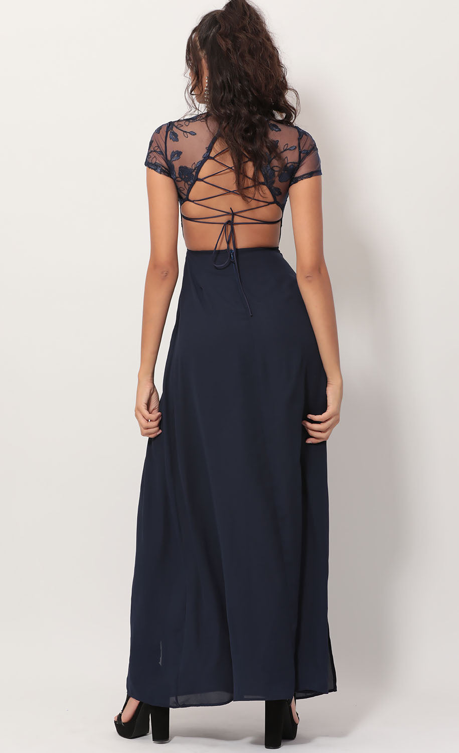 Strut your stuff like the queen you are in this maxi. Elegance, romance and high-class are sewn into the seams of this dress. Made in our embroidered navy lace and draping navy wooldobby fabric. Features a classy high neck lined with a sweetheart neckline, a sexy open back with lacing and a side slit skirt. Perfect for special ocassions, formals and prom. Pair with crystal earrings and dainty heels and all eyes are on you! Made In Los Angeles -100% Polyester -Stretch Fabric -Button Closure -Partially Lined -Hand-wash Cold Length of Dress Measures 57in/144.7cm All Measurements Are For A Size Small