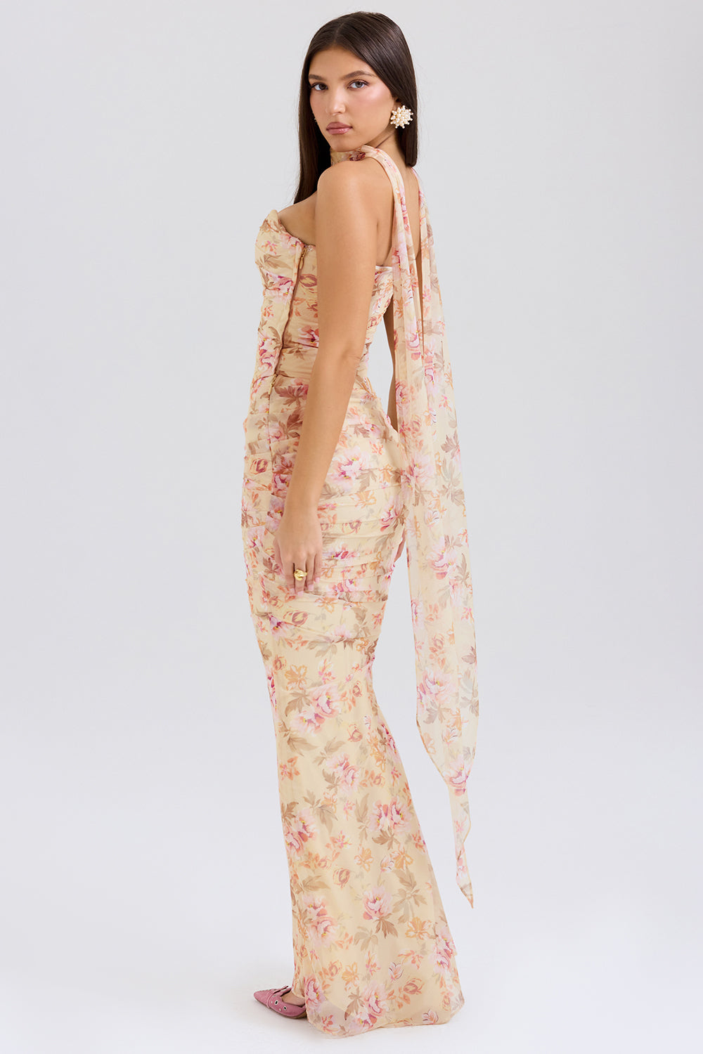 Our 'Cassidy' maxi skirt captures our elegant approach to design. Made from stretch mesh, its gently gathered and hugs your figure all the way down to the fluted maxi hem. It sits mid-rise at the waist and zips to the side for easy on. Match the pretty honeyflower print and wear yours with our 'Hallie' strapless corset as we transition into Fall.