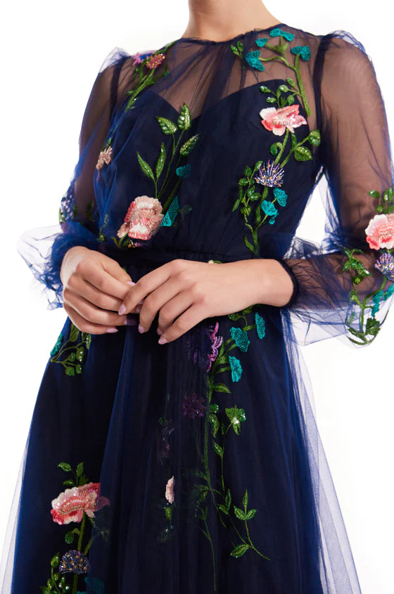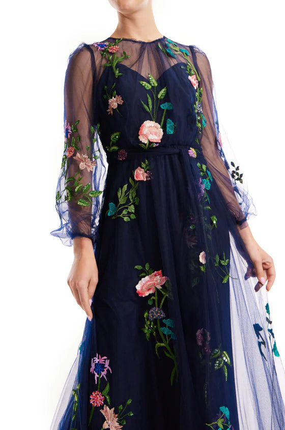 Our Jewel Neck Puff Sleeve Embroidered Tulle Gown in Navy/Multi is a stunning display of intricacy and draping. Crafted from navy embroidered silk tulle. this floor-length gown features long. billowed sleeves with gentle gathering at the jewel neckline. adding texture and movement. The attached self-tie sash at the waist enhances the silhouette. while the keyhole detail at the back neckline. finished with a button closure. adds a refined touch. The neckline and sleeves remain unlined. allowing the delicate floral embroidery to stand out. cascading gracefully over the gown. Beneath the ethereal tulle. an attached lining provides coverage. while the tulle train flows past it. creating a weightless and enchanting effect.