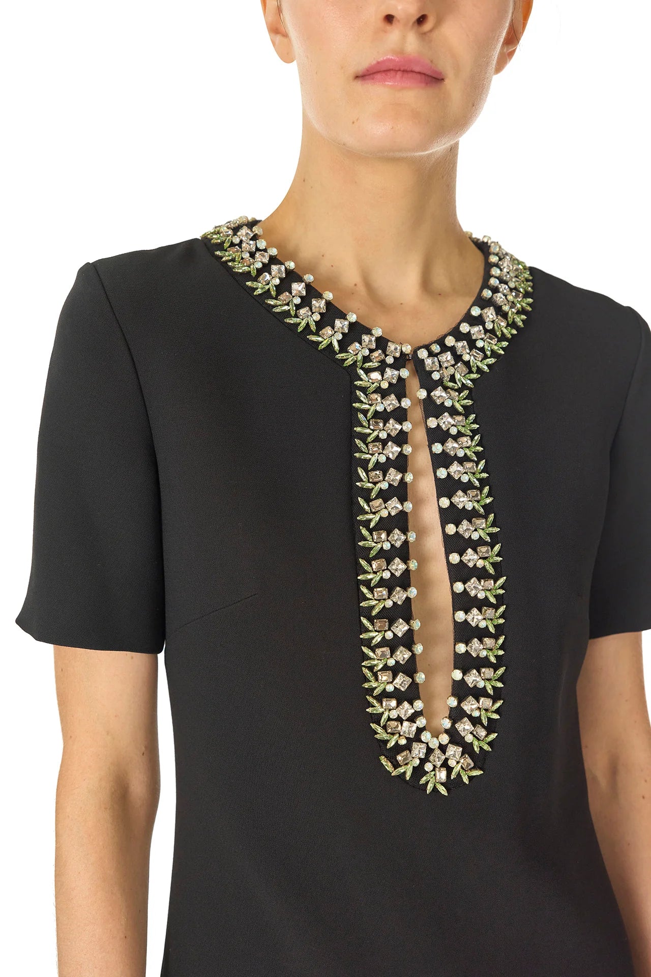 Graceful and refined. this short-sleeve caftan is crafted from luxurious Noir wool-silk suiting. The streamlined silhouette is subtly contoured with front bust darts and back princess seams. offering a polished yet fluid drape. The neckline. adorned with intricate jeweled embroidery. adds a hint of sheen. while a delicate keyhole detail enhances its elegance. The skirt falls effortlessly to the floor. finished with a high back slit for ease of movement.