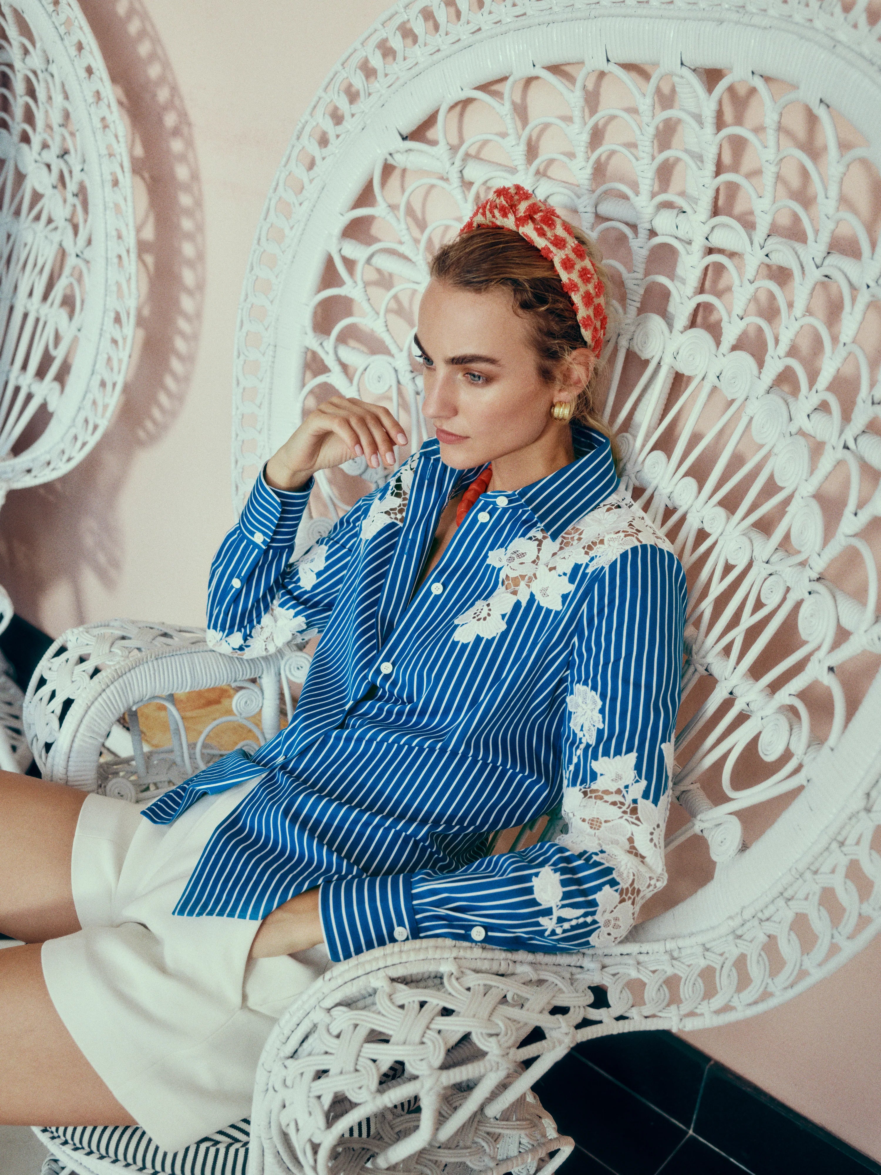 Our Nautical Blue & White striped button-down reimagines a classic with intricate lace detailing. Crafted from crisp striped cotton poplin. this long-sleeve shirt features delicate white guipure lace cascading from the shoulder and accenting the mid-arm. A structured collar and buttoned cuffs complete the refined yet romantic design.
