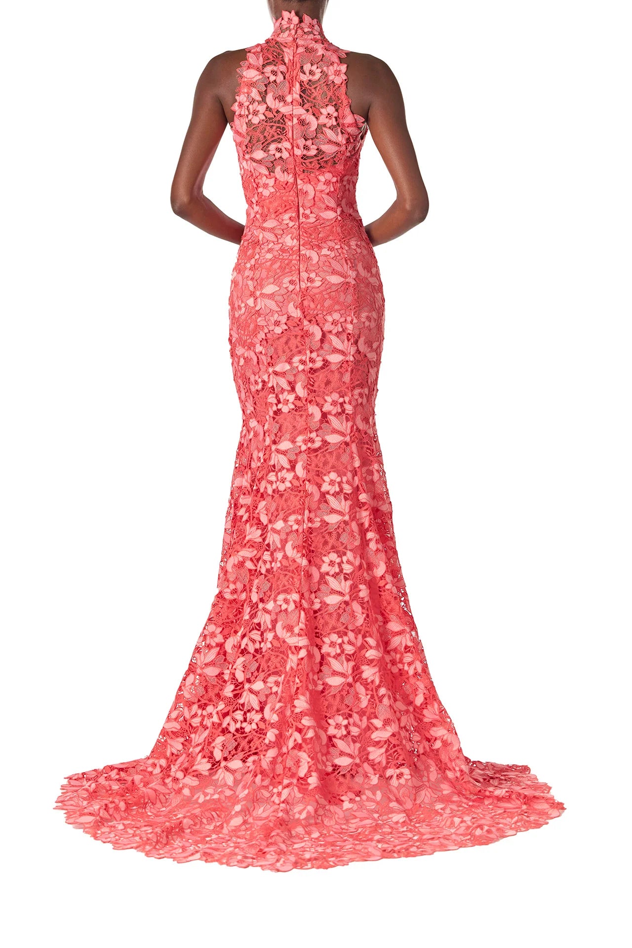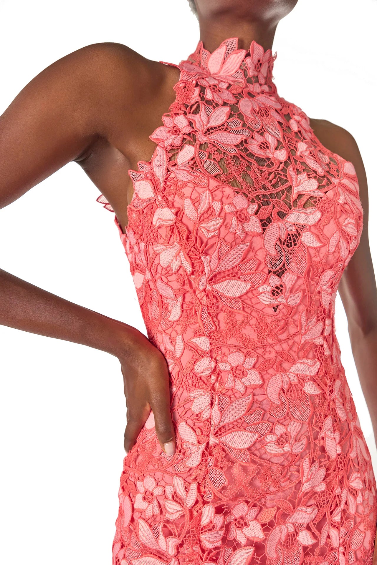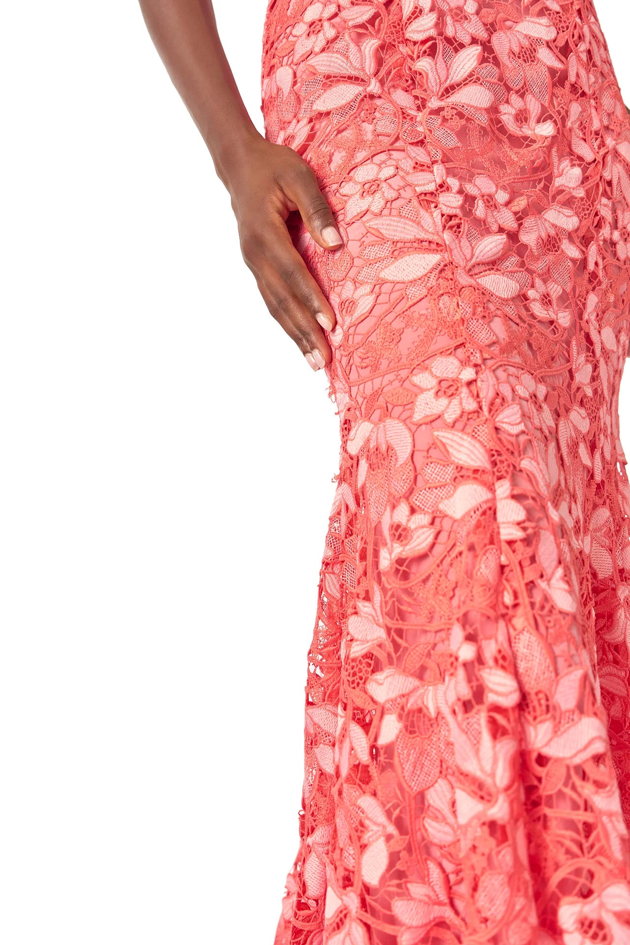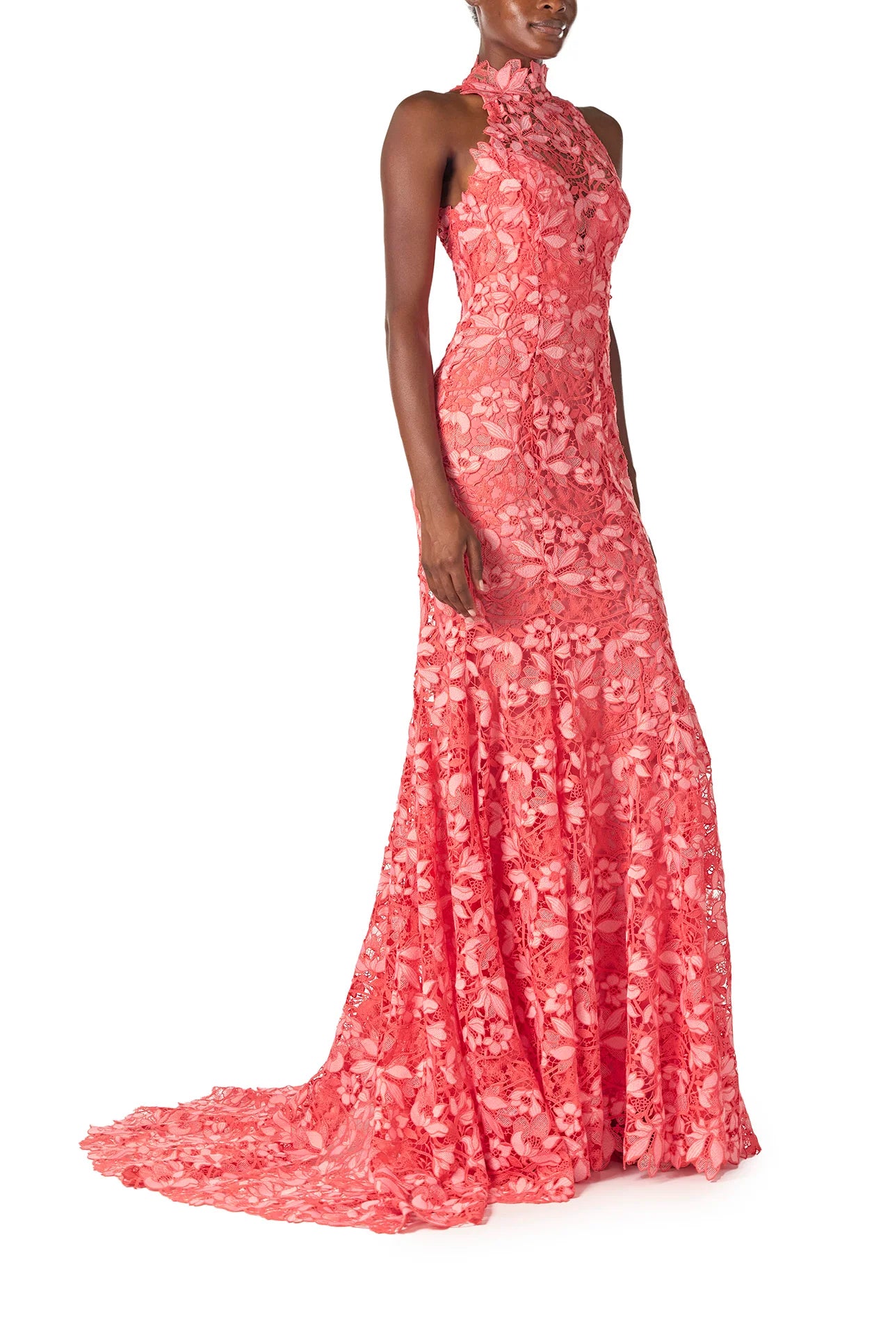 Bold and vibrant. this floral lace trumpet gown in rich Coral/Rosette exudes timeless romance. A sophisticated halter neckline beautifully frames the shoulders. while delicate scalloped lace edging adds a soft. feminine touch. The lining finishes at a sweetheart neckline. allowing the intricate lace to extend upward. highlighting its ornate details. A seam at the waist subtly defines the silhouette beneath the lace. while the fitted shape flares into a sweeping. elegant train.