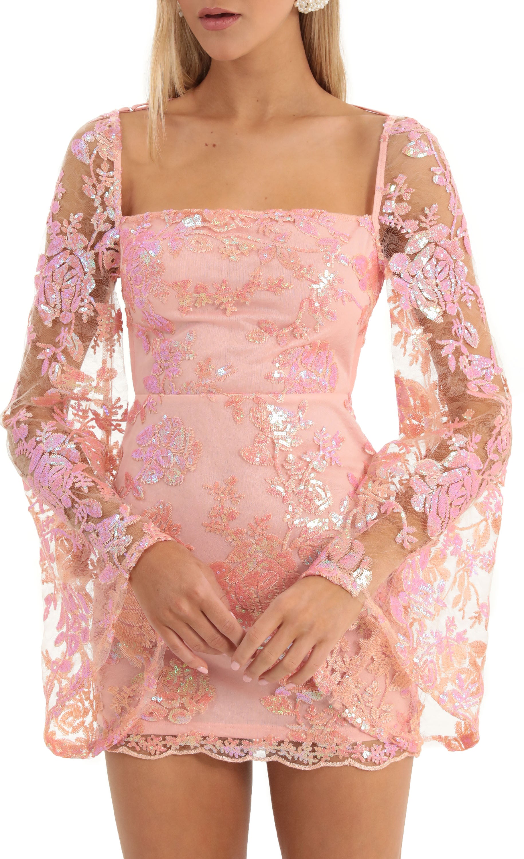 Designed in Los Angeles - Made in Lace Sequin Fabric - Hand-Wash Cold - Dress is Sheer - Dress is Fully lined - Sleeves Unlined - Zipper Back Closure Length of Dress Measures 31in/78.74 cm All Measurements Are For A Size Small Handling the garments with care, hand washing and air drying is strongly recommended. Slight modifications might be made to improve garment quality.