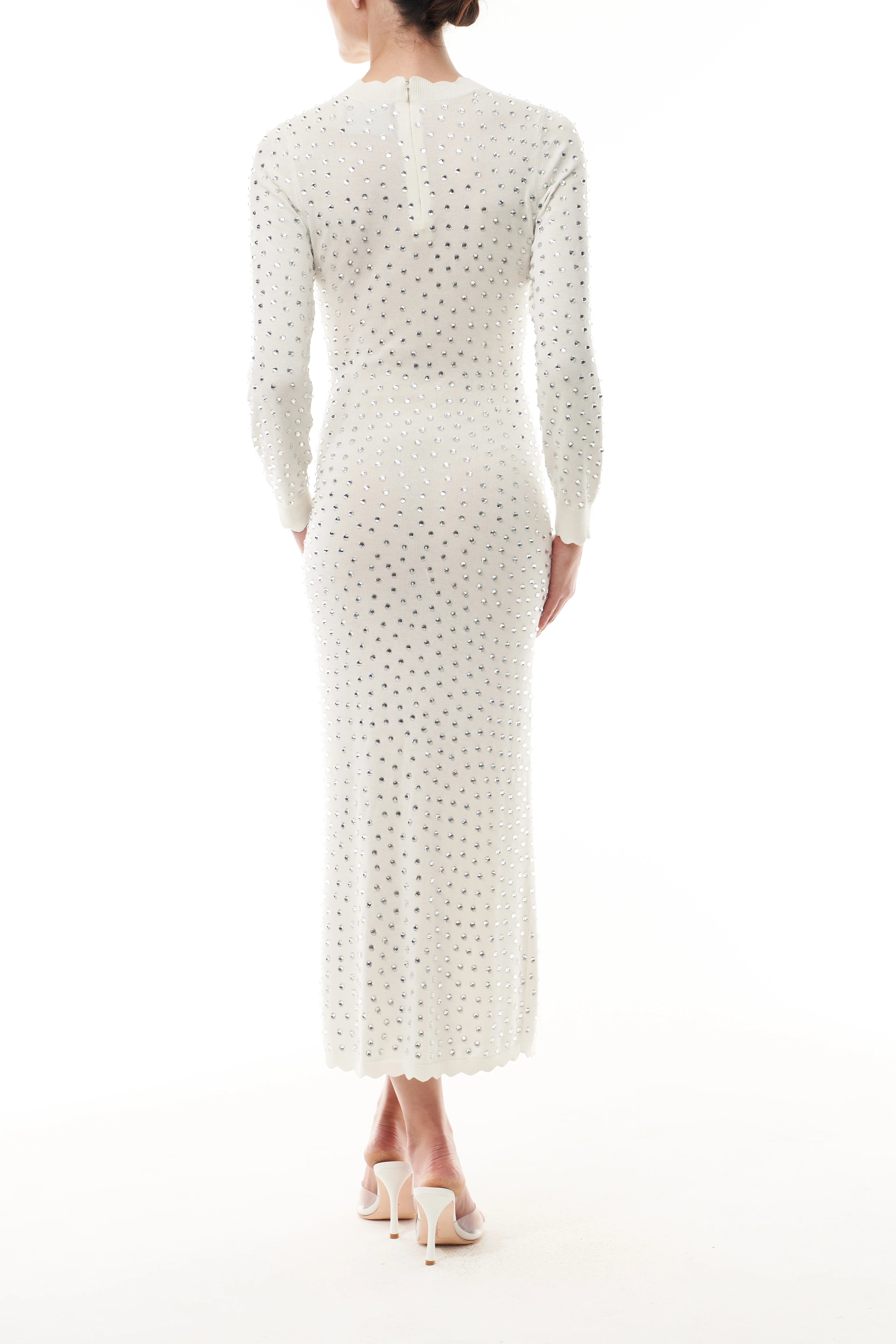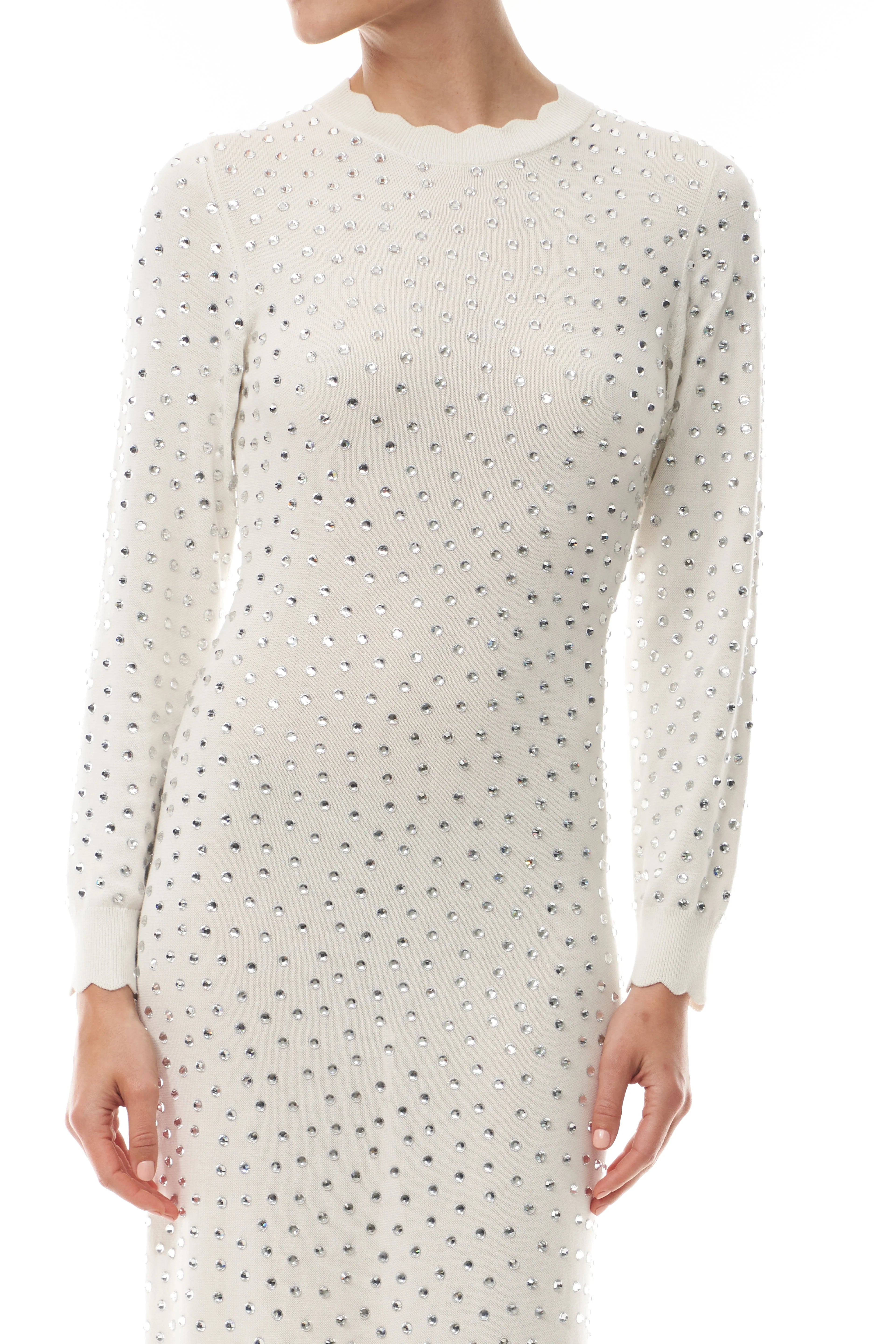 Our Long Sleeve Crystal Hotfix Dress brings together ease and sparkle in a refined, fitted silhouette. Crafted from Cotton Hotfix Knit, the Ivory design is scattered with silver crystals that catch the light with every movement. Scalloped detailing at the neckline, cuffs, and hem adds softness to the sleek shape, while the breathable knit keeps the look effortless and wearable—all while exuding understated glamour.