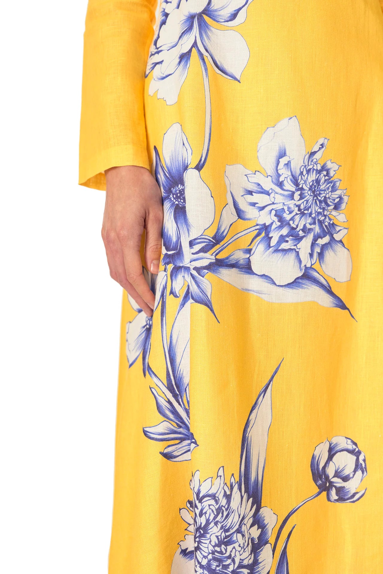 Blue and white printed flowers bring an organic element to this long sleeve linen cocktail dress. A jewel neckline. princess seams and a belted waist help sculpt the bodice. while the a-line tea-length skirt flows effortlessly.