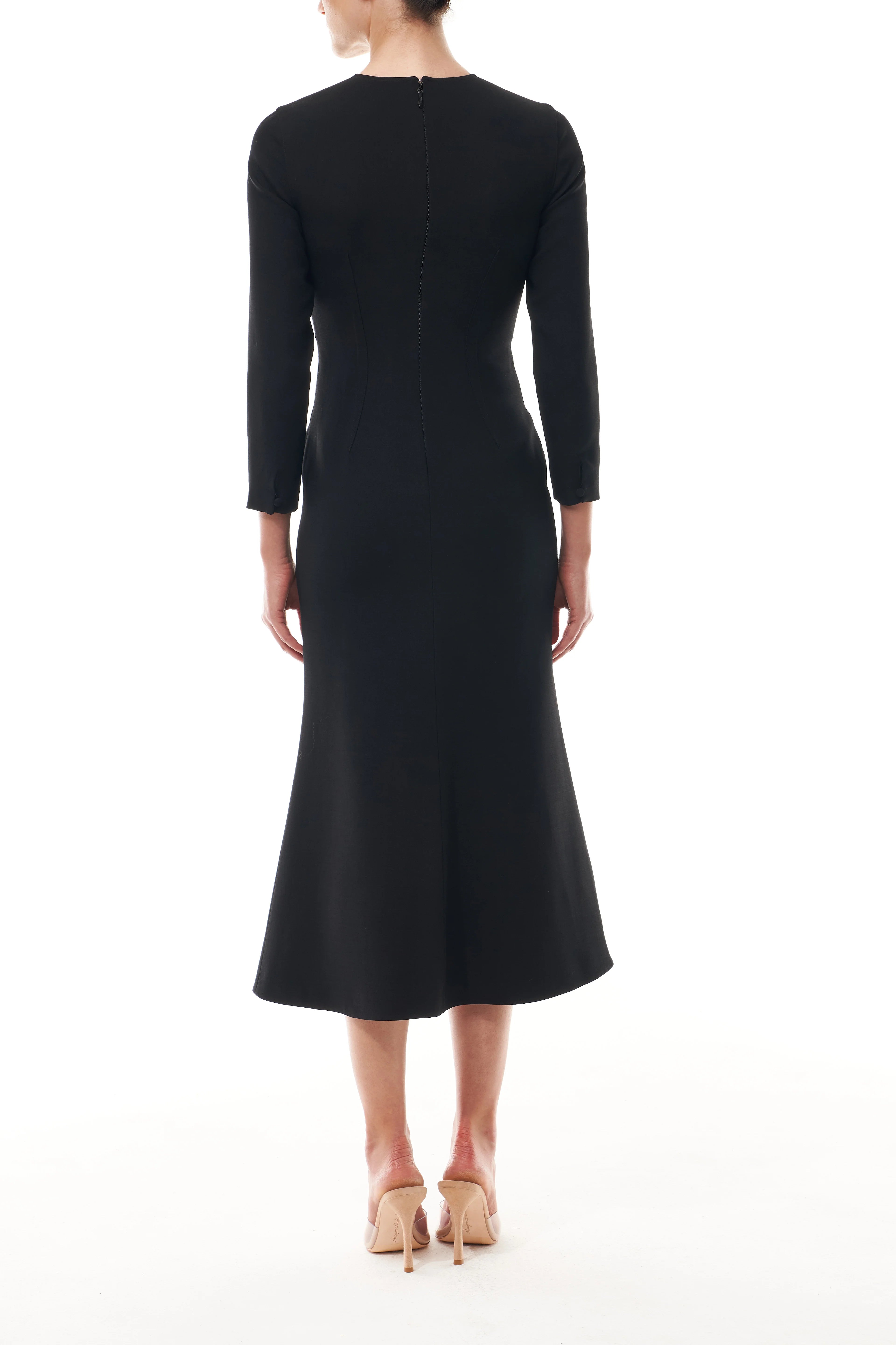 Our Long Sleeve Wool Midi Dress blends refined tailoring with understated femininity. Cut from lightweight silk wool suiting in Noir, this polished silhouette features a jewel neckline and long sleeves. A subtle fit-and-flare shape and midi length complete the look with quiet sophistication.