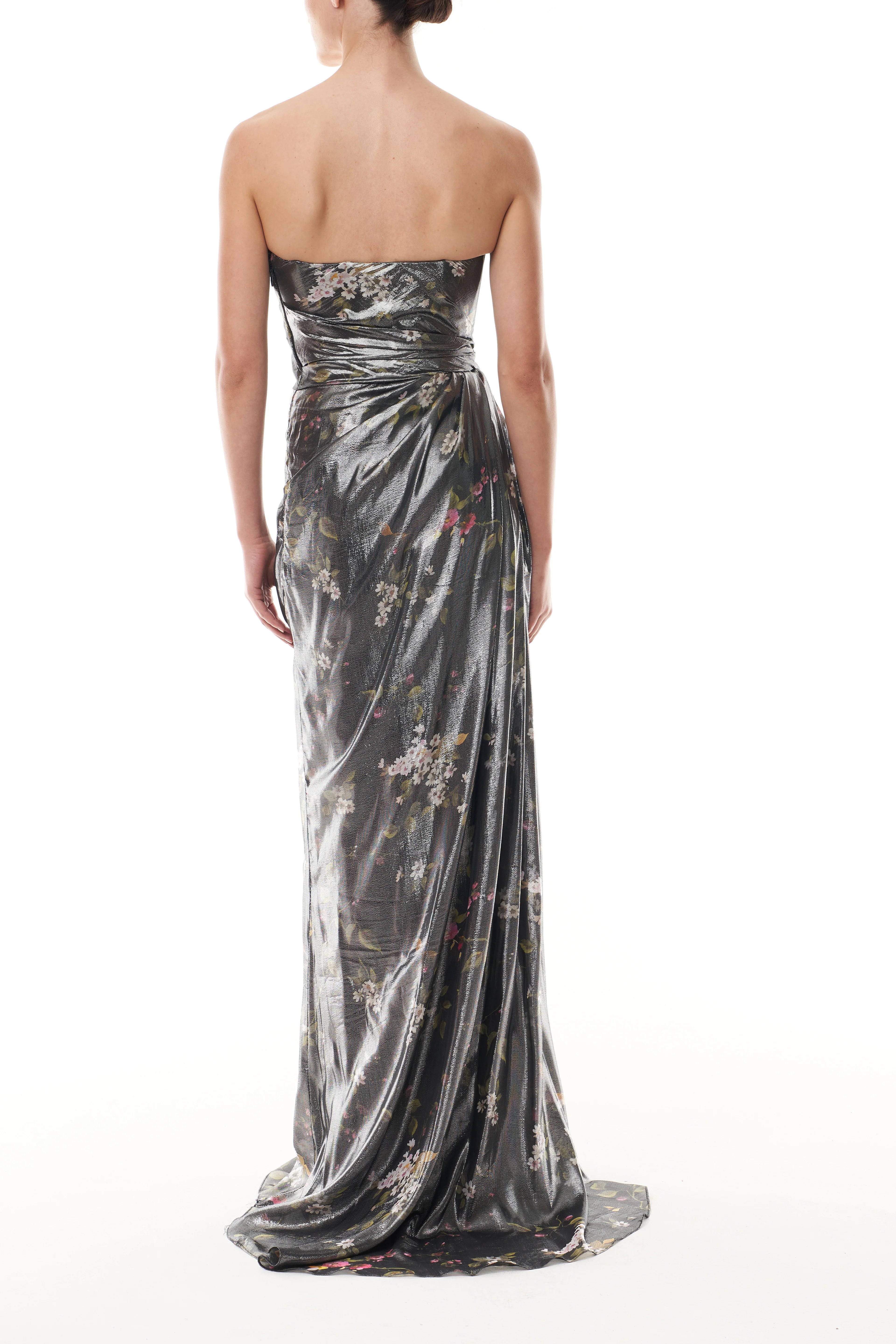 Crafted from delicate bloom-printed lamé, this strapless gown exudes floral glamour. The straight-across, vertically boned bodice is finished with a side zipper closure, while asymmetric draping cascades elegantly toward the high hip, enhancing the silhouette. A flowing scarf adds a graceful finishing touch, complementing the gown’s sophisticated movement.