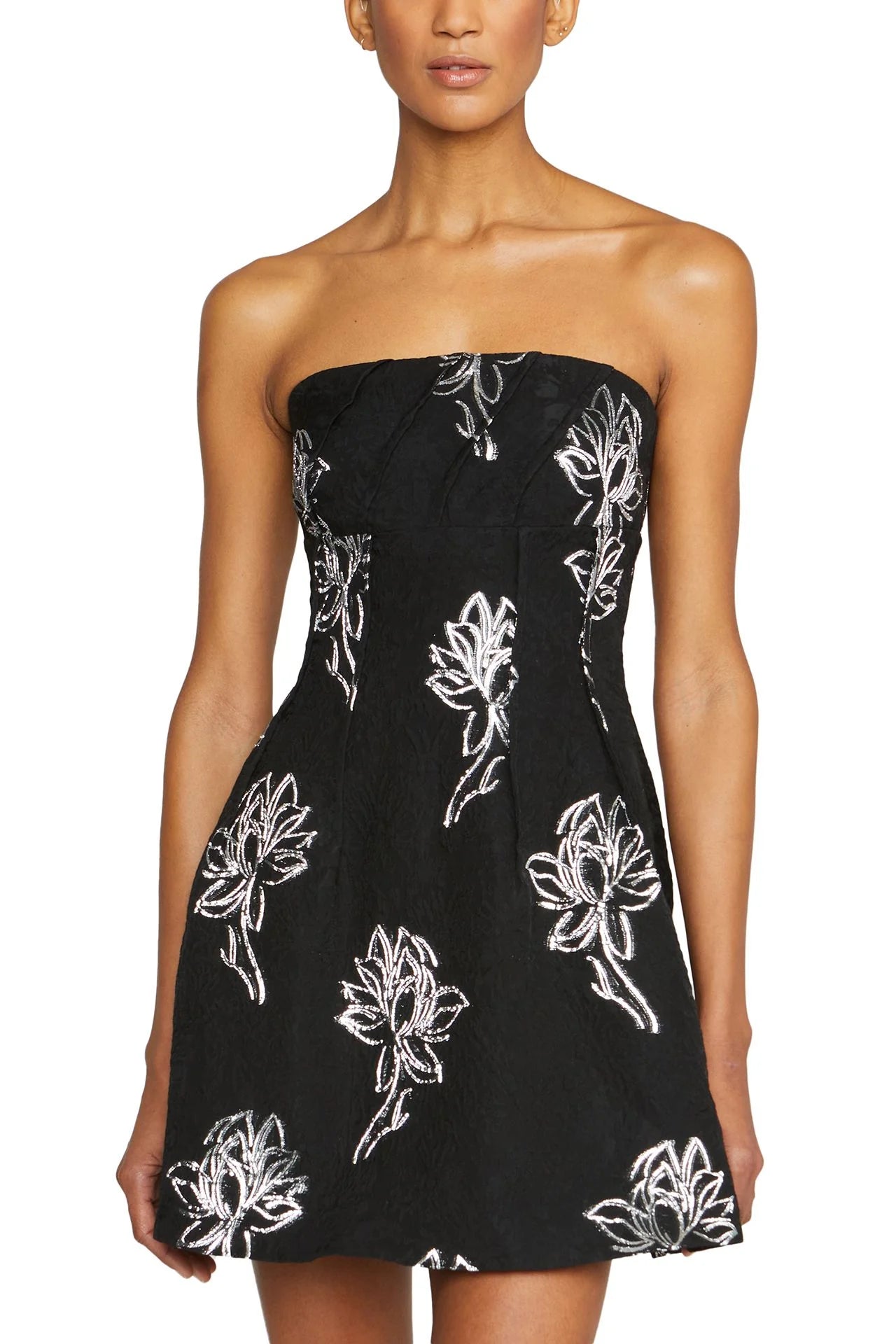Strapless. A-line cocktail dress with mini length skirt in Black/Silver Metallic Jacquard.