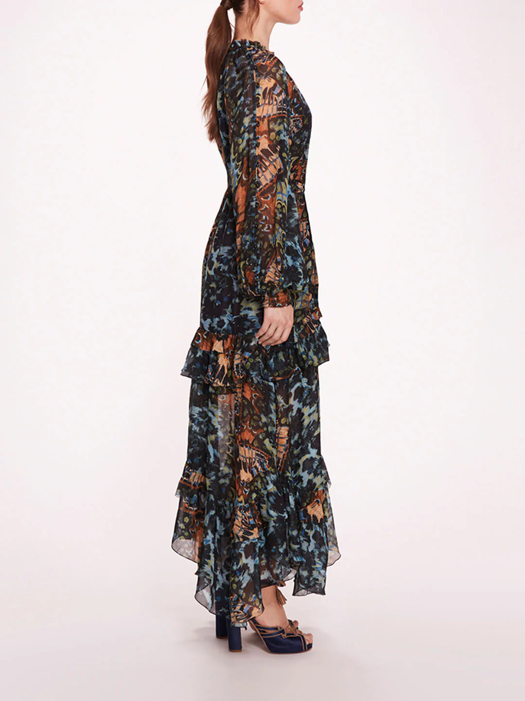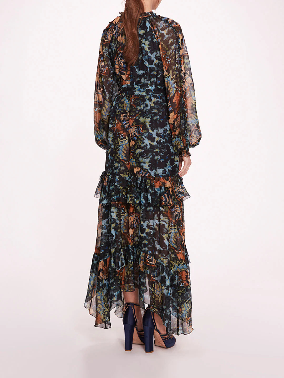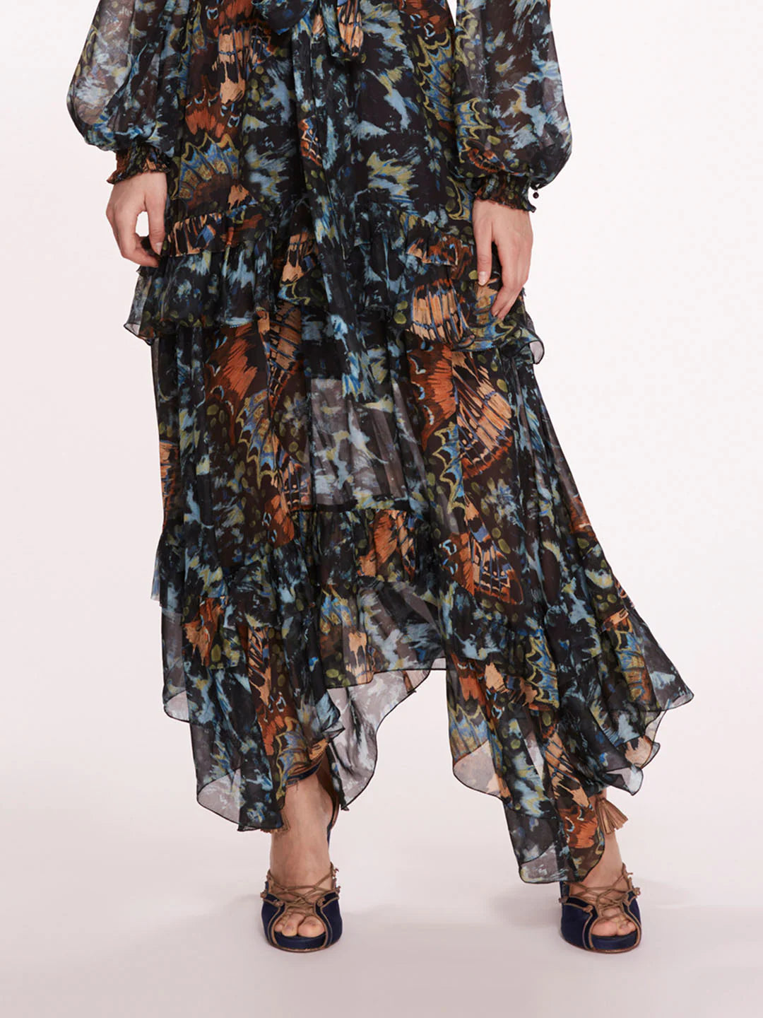 The Monarch Maxi Dress is an abstract embodiment of the butterfly. Crafted with printed silk viscose fabric. its raglan billowy sleeves adorned with bobble button accents exude a sense of refinement. while the flowy A-line silhouette and handkerchief hem create a captivating sense of movement. Complete with a separate belt. this dress offers versatility in styling.