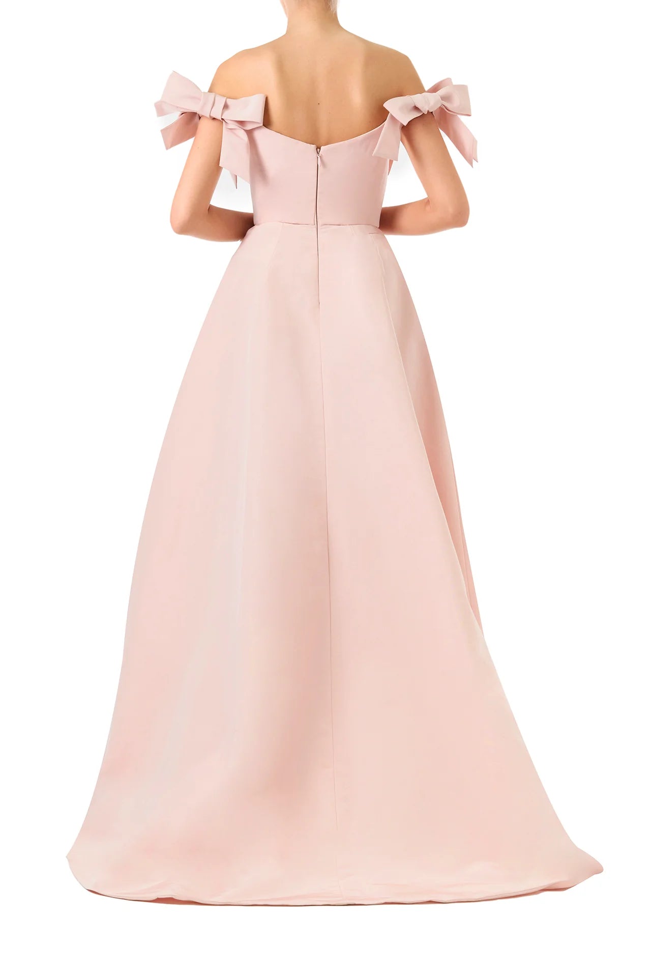 Our Off-The-Shoulder Bow Sleeve Gown in Pale Blush is the epitome of romantic elegance. Crafted from luxurious faille. this gown features a subtly scooped neckline and delicately draped bows that form off-the-shoulder straps. The corseted bodice. shaped by princess seams and a defined waist. creates a beautifully structured silhouette. A full. flowing skirt cascades from the waist. complete with a front slit and sweeping train for added drama. A hidden horsehair trim inside the hem adds subtle structure. ensuring the skirt maintains graceful movement.