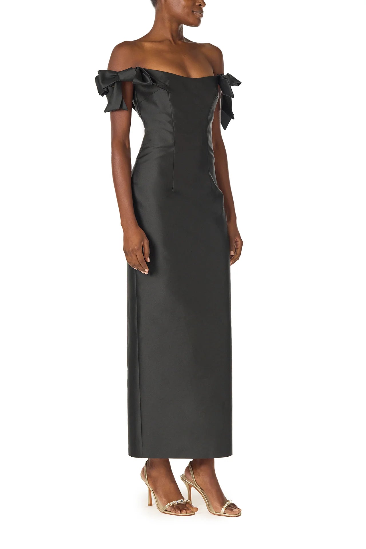 Our Off-the-Shoulder Bow Sleeve Sheath in Noir Mikado is the epitome of timeless sophistication. Featuring vertical boning and a built-in corset. the bodice offers both structure and support. Princess seams enhance the figure. while the absence of a waist seam creates a continuous. elongating effect. The off-the-shoulder bow sleeves add a playful. feminine touch. perfectly accentuating the shoulders. A back slit ensures ease of movement. completing the classic. tea-length silhouette.