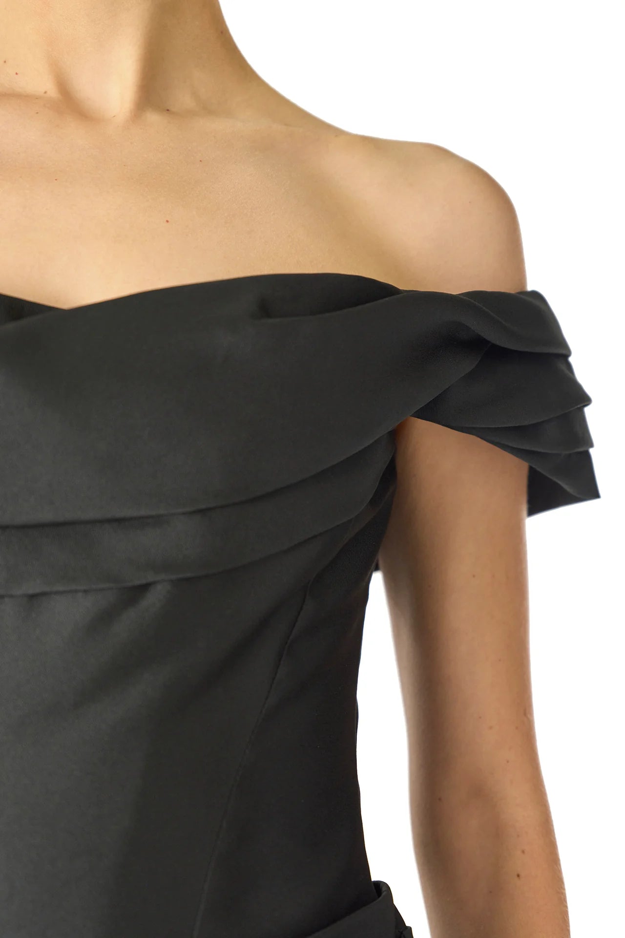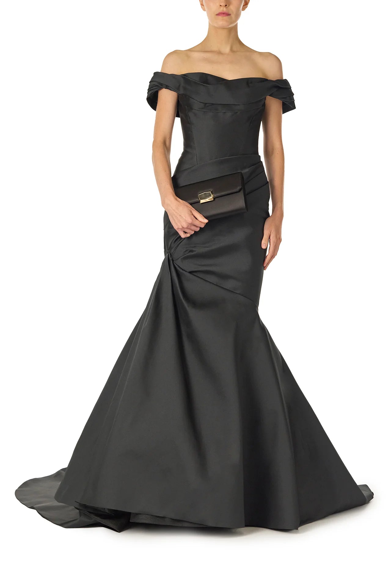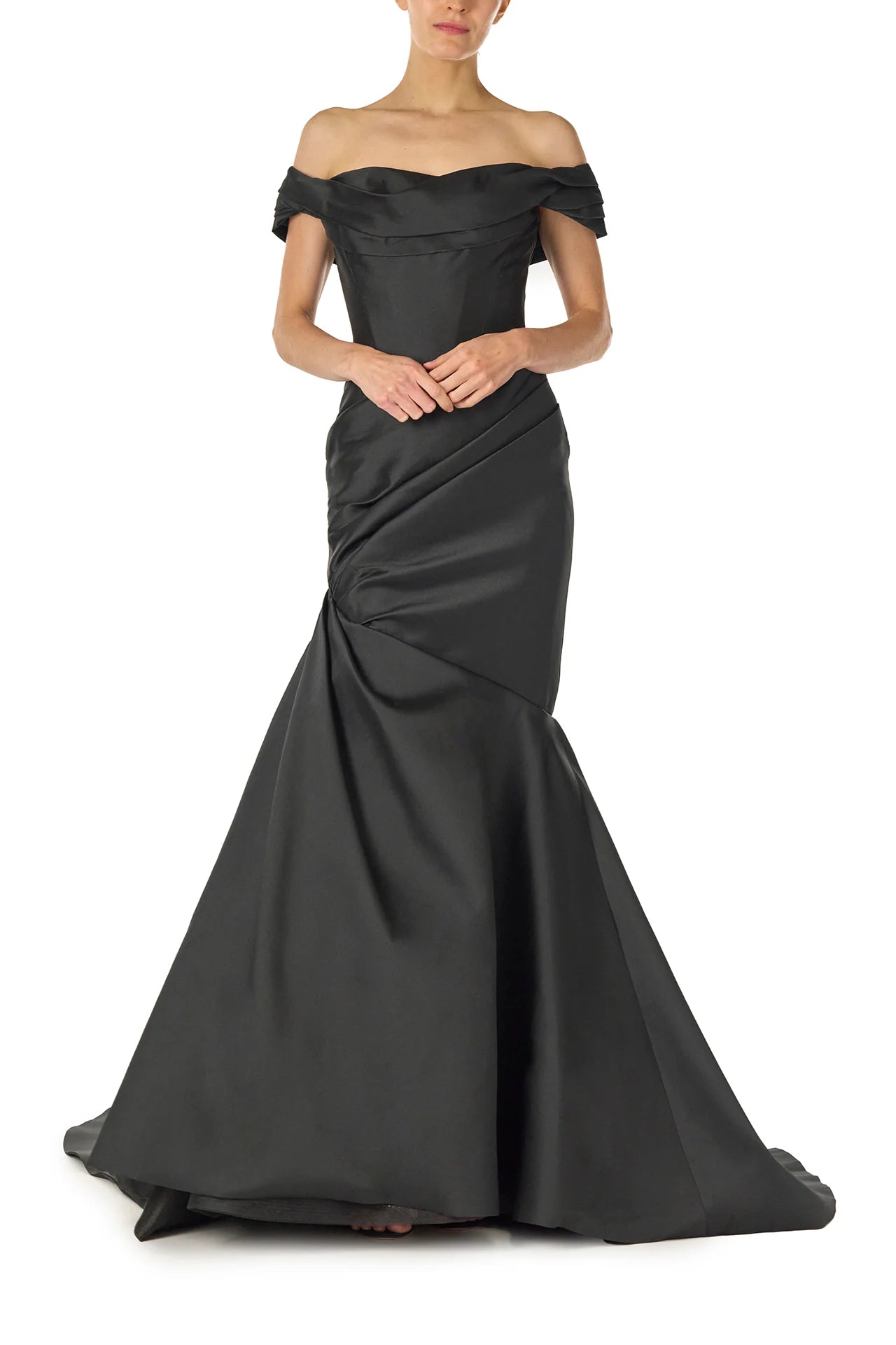 Our Off-The-Shoulder Draped Trumpet Gown in Noir Mikado is the epitome of sculpted elegance. Expertly draped fabric wraps around the bust and extends into off-the-shoulder sleeves. creating a romantic and sophisticated silhouette. The elongated. corseted bodice contours the figure. enhancing the waist and allowing for a striking low V-back. Thoughtfully placed draping at the hip gathers before flowing seamlessly into a dramatic trumpet skirt. while a sweeping train at the back hem adds a breathtaking finish.
