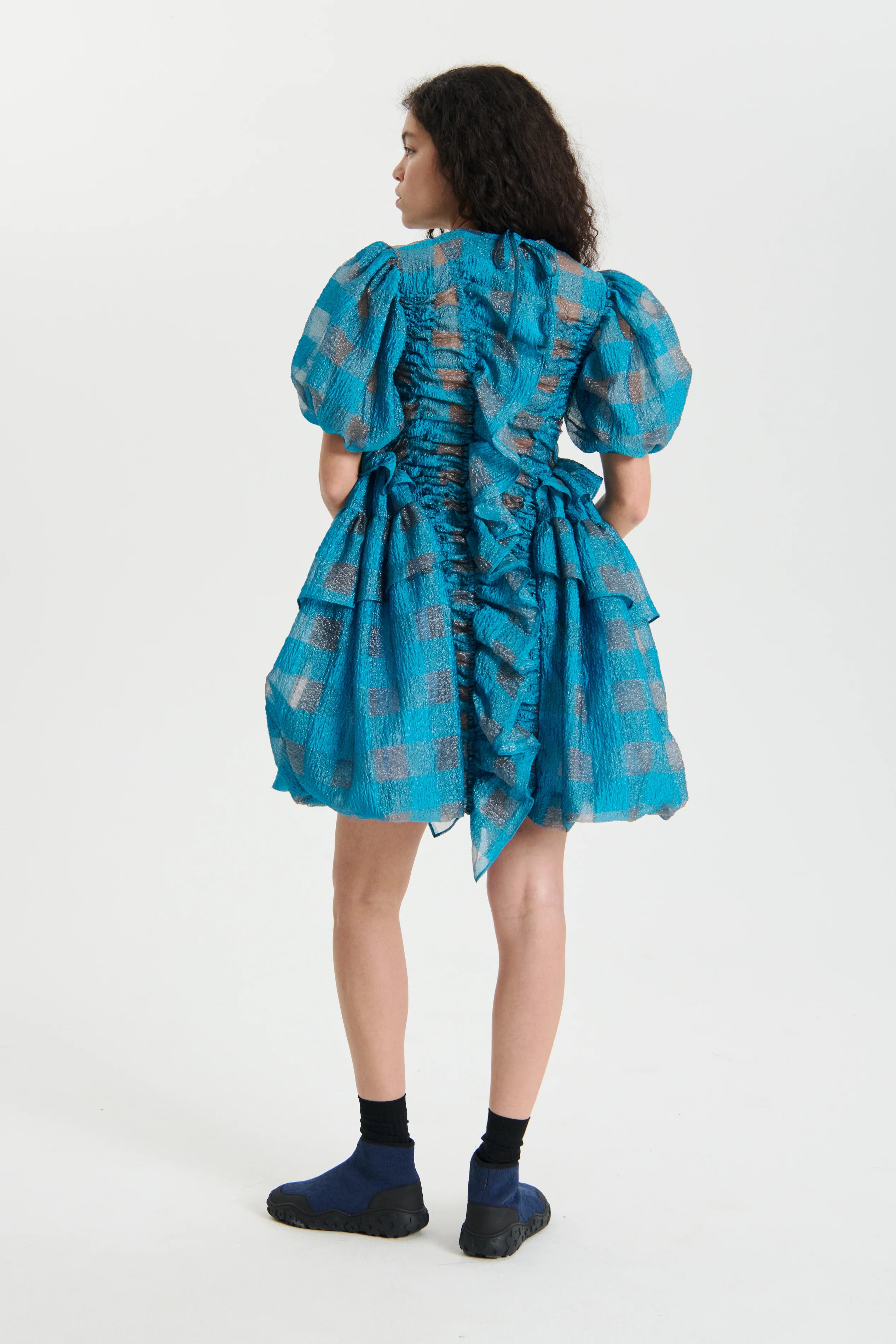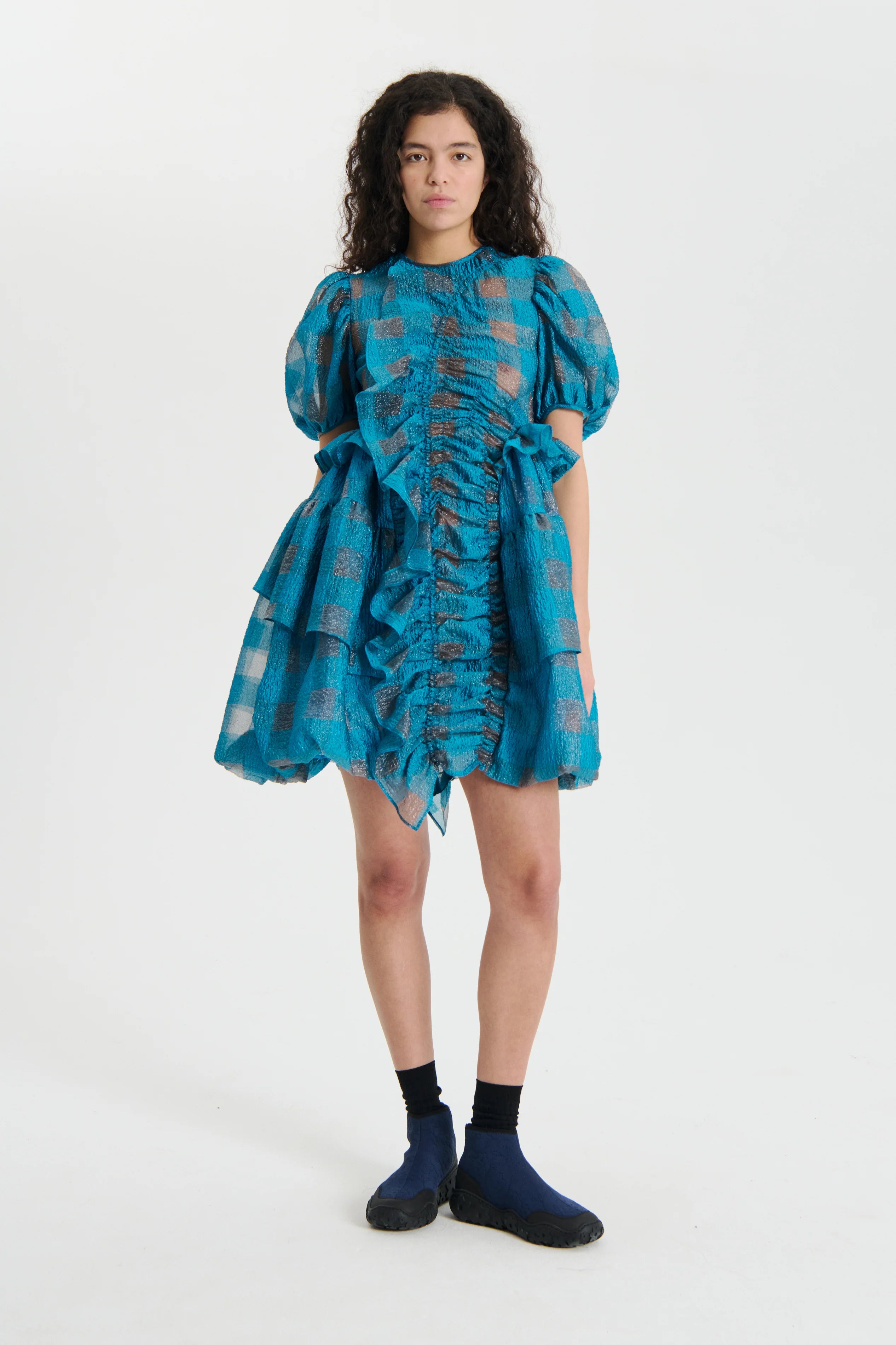 A cascade of ruffles and rusching. the Olena dress. Featuring hip inserts and puff sleeves. the romantic silhouette is cut from a utilitarian recycled faille for light. sporty movement.