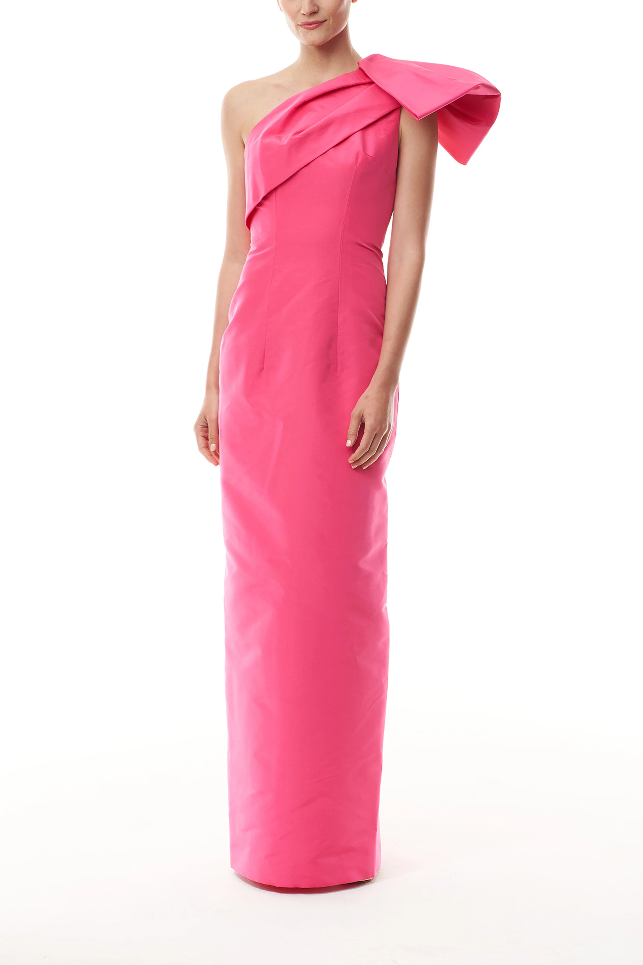 This one-shoulder column gown in Hot Pink faille blends architectural structure with graceful draping. Vertical boning and princess seams sculpt the figure, while the fabric gathers elegantly upward, culminating in a striking bow at the left shoulder. The streamlined silhouette and expertly crafted draping create a look of dramatic but refined sophistication.